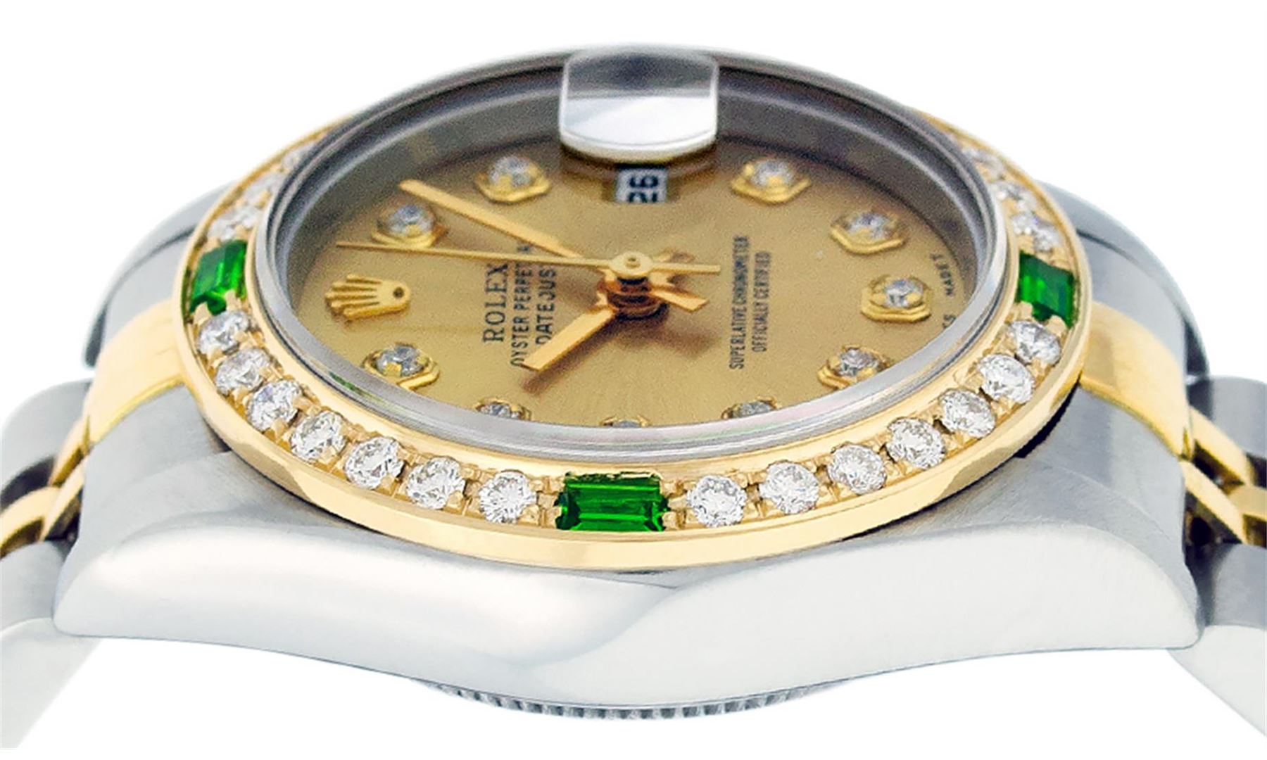 One Ladies 18K Two Tone Rolex Datejust Polished, Serviced & Electronically Tested, 18K Yellow Gold & Stainless Steel Case: 26mm, 18K Yellow Gold Crown, Custom Bezel: New 18K Yellow Gold Emerald Beadset Diamond Bezel, Diamond + Gem Count: 28 Diamonds + 4 Emeralds Total Weight .70 Carat, Clarity: SI-VS, Color: G to H. Custom Crystal: New Scratch Resistant Synthetic Sapphire Cyclops Lens. Custom Hands: New Luminescent Hands. Movement: Automatic Winding Movement Caliber 2235. Custom Dial: Champagne Dial Set With Diamond Hour Markers, Diamond Count: 10 Single Cut VS Diamonds in Dial, G To H In Color, VS Clarity. Date Window: 3 O'Clock Position Date Display, Model: Datejust, Condition: G-6 Extra Fine. Bracelet: Two Tone 18K Yellow Gold & Stainless Steel Jubilee. Bright Polish. 6.0 Inch Length, Adjustable. Standard Clasp, With Rolex Logo. This Watch Has Been Serviced Time Tested And Is In Excellent Condition It Is Free Of All Scratches And Dents.