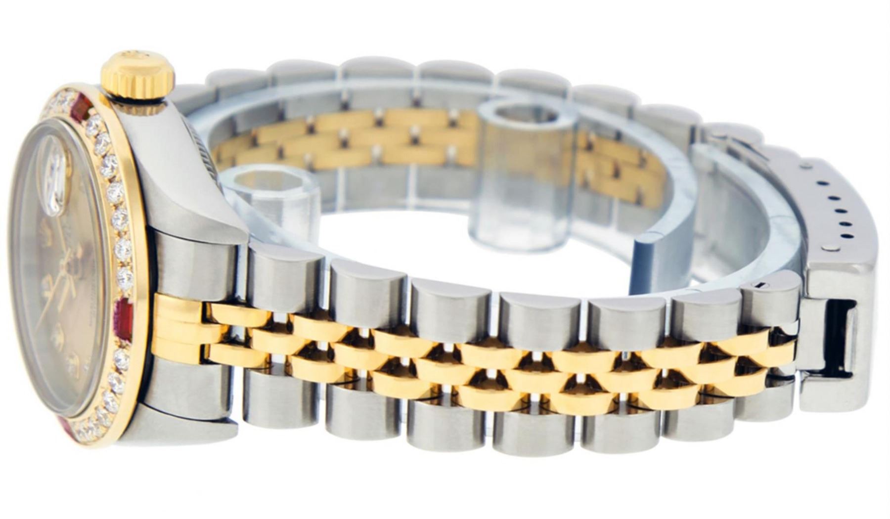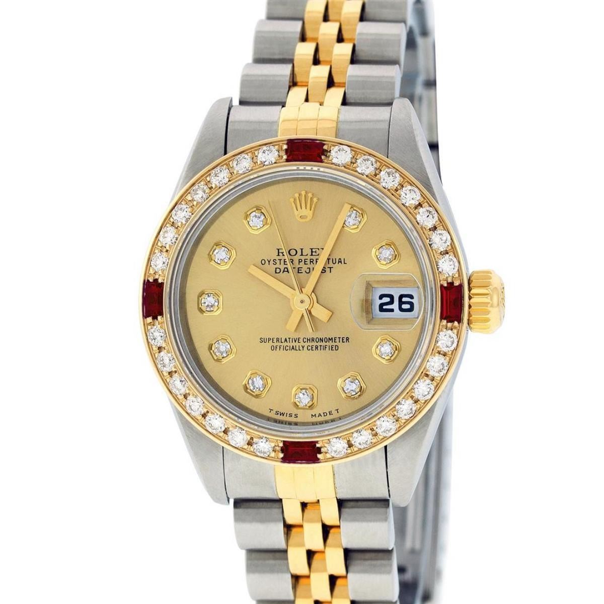 One Ladies 18K Two Tone Rolex Datejust Polished, Serviced & Electronically Tested, 18K Yellow Gold & Stainless Steel Case: 26mm, 18K Yellow Gold Crown, Custom Bezel: New 18K Yellow Gold Ruby Beadset Diamond Bezel, Diamond + Gem Count:  28 Diamonds + 4 Rubies Total Weight .70 Carat, Clarity: SI-VS, Color: G to H. Custom Crystal: New Scratch Resistant Synthetic Sapphire Cyclops Lens. Custom Hands: New Luminescent Hands. Movement: Automatic Winding Movement Caliber 2235. Custom Dial: Champagne Dial Set With Diamond Hour Markers & Dash Track, Diamond Count: 10 Champagne Single Cut Diamonds in Dial, G To H In Color, VS Clarity. Date Window: 3 O'Clock Position Date Display, Model: Datejust, Condition: G-6 Extra Fine. Bracelet: Two Tone 18K Yellow Gold & Stainless Steel Jubilee. Bright Polish. 6.0 Inch Length, Adjustable. Standard Clasp, With Rolex Logo. This Watch Has Been Serviced Time Tested And Is In Excellent Condition It Is Free Of All Scratches And Dents.