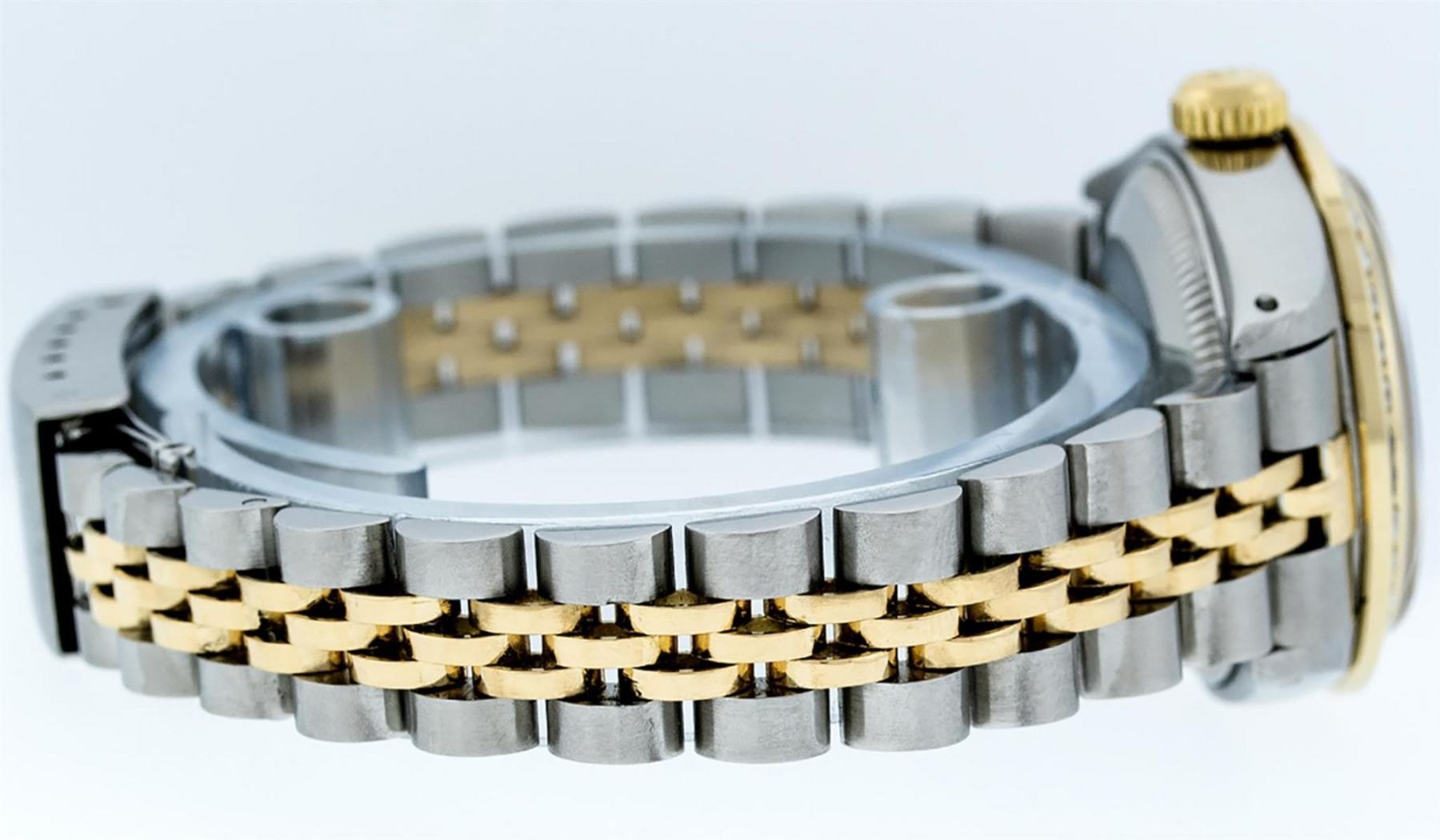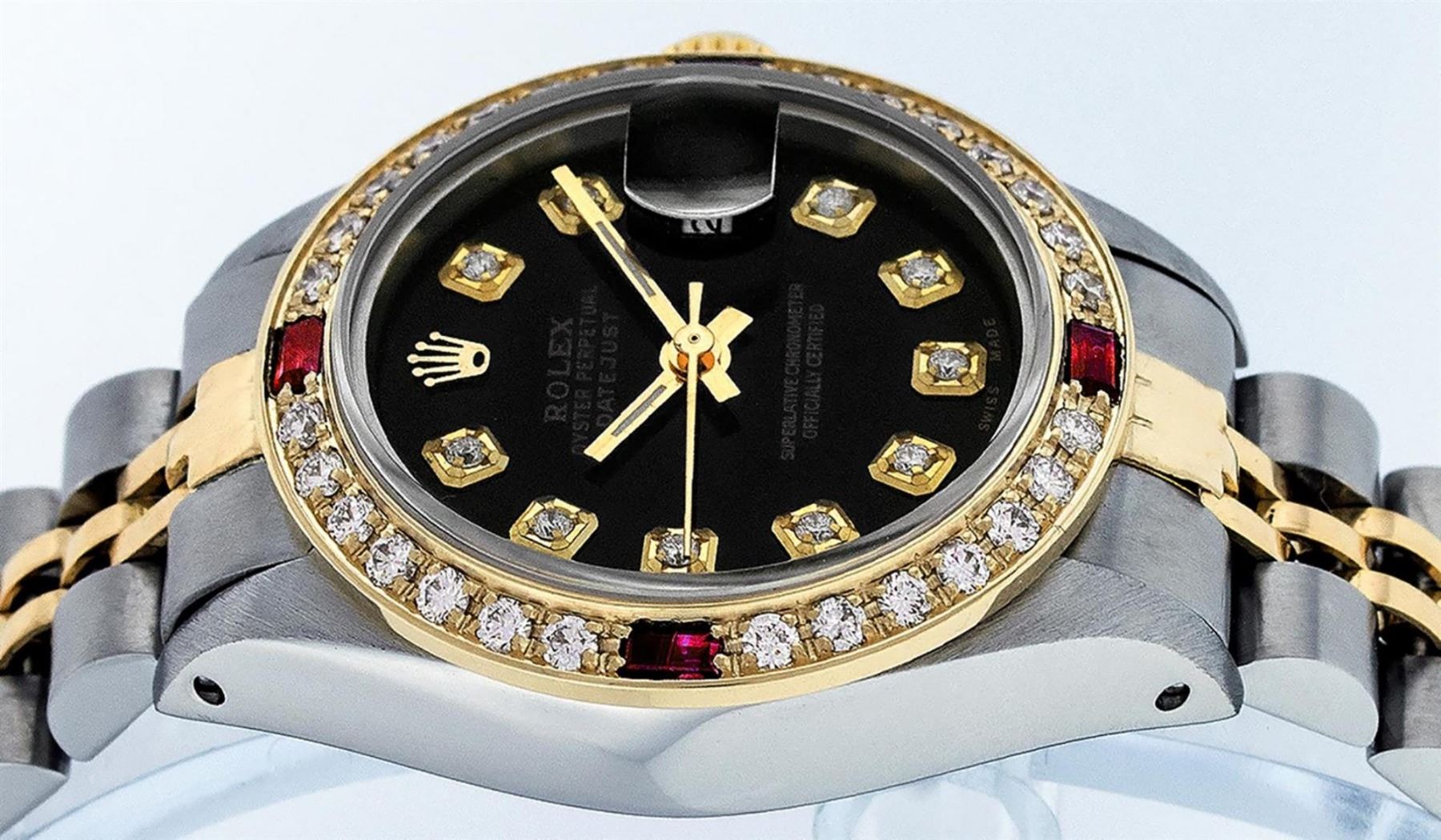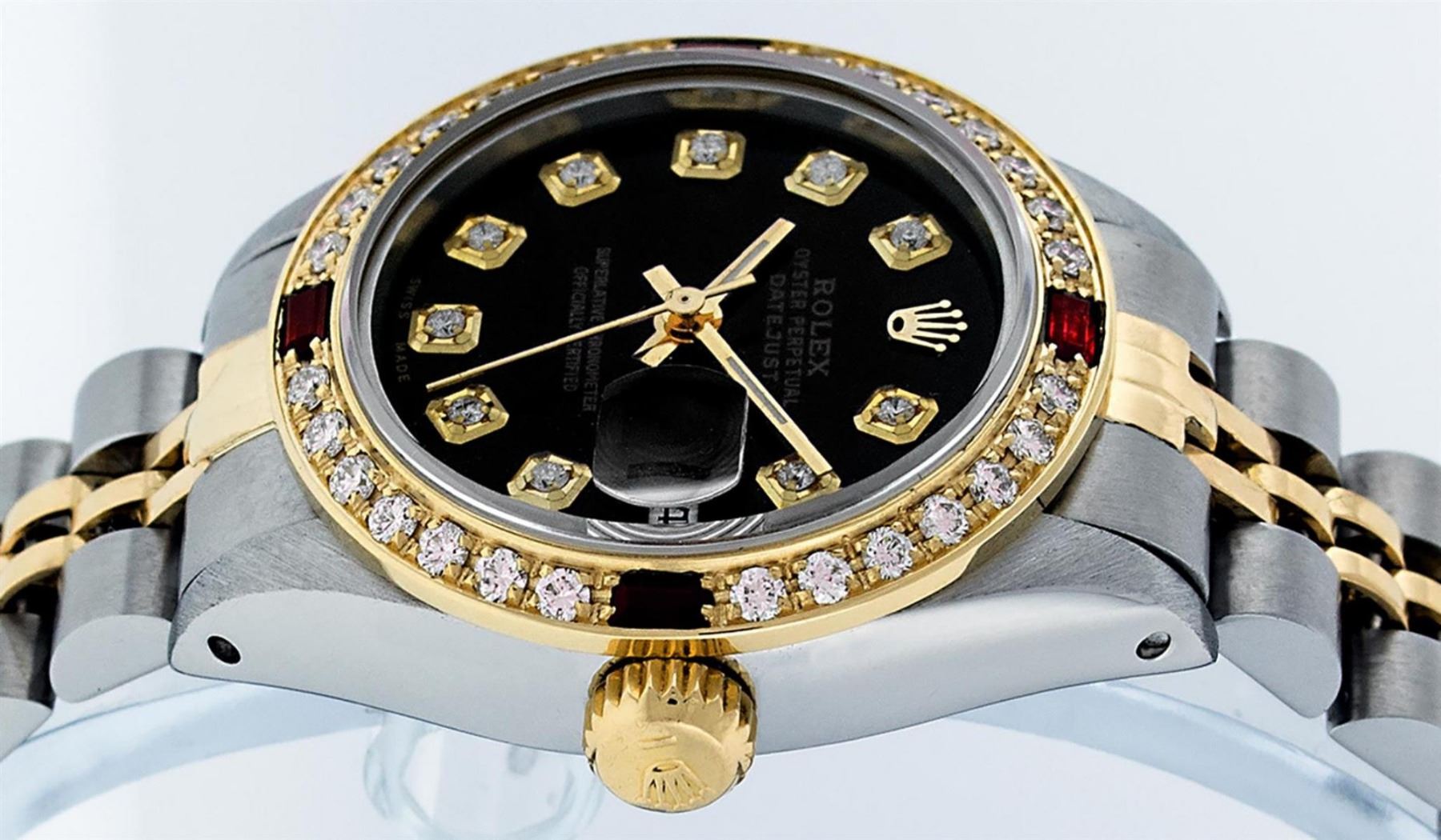 One Ladies 14K Two Tone Rolex Datejust Polished, Serviced & Electronically Tested, 14K Yellow Gold & Stainless Steel Case: 26mm, 14K Yellow Gold Crown, Custom Bezel: New 18K Yellow Gold Ruby Beadset Diamond Bezel, Diamond + Gem Count: 28 Diamonds + 4 Rubies, Total Weight .70 Carat, Clarity: SI-VS, Color: G to H. Custom Crystal: New Scratch Resistant Synthetic Sapphire Cyclops Lens. Custom Hands: New Luminescent Hands. Movement: Automatic Winding Movement Caliber 2030. Custom Dial: Black Diamond Dial. Date Window: 3 O'Clock Position Date Display, Model: Datejust, Condition: G-6 Extra Fine. Bracelet: Two Tone 14K Yellow Gold & Stainless Steel Jubilee Band. Bright Polish. 6.0 Inch Length, Adjustable. Standard Clasp, With Rolex Logo. This Watch Has Been Serviced Time Tested And Is In Excellent Condition It Is Free Of All Scratches And Dents.