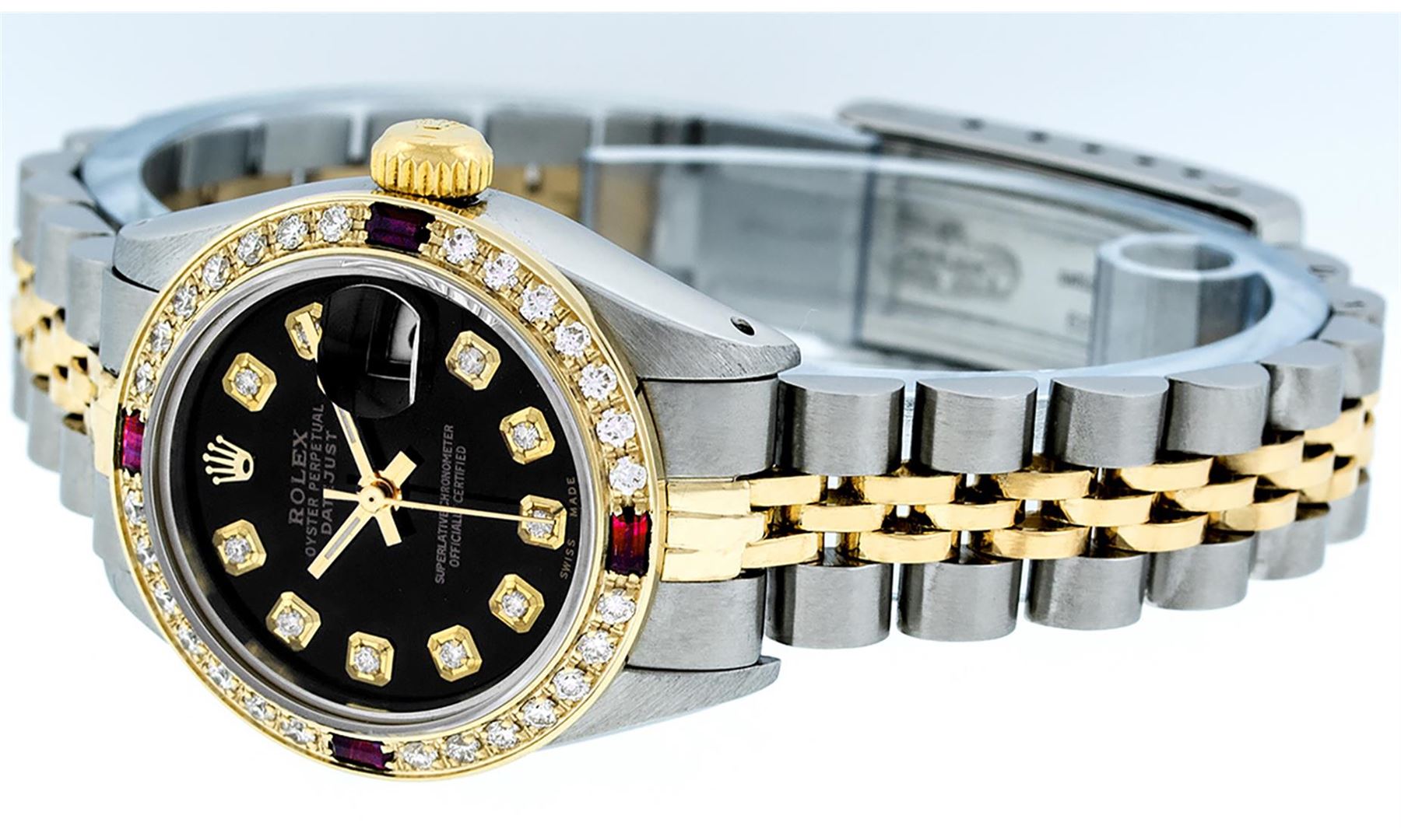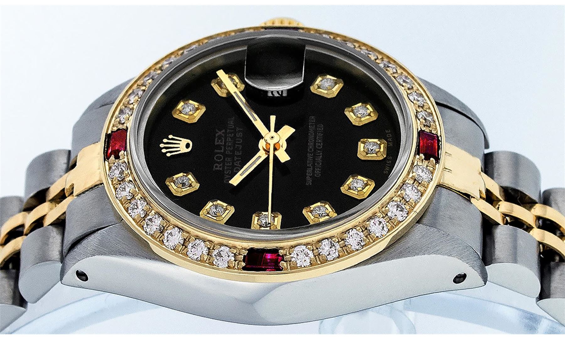 One Ladies 14K Two Tone Rolex Datejust Polished, Serviced & Electronically Tested, 14K Yellow Gold & Stainless Steel Case: 26mm, 14K Yellow Gold Crown, Custom Bezel: New 18K Yellow Gold Ruby Beadset Diamond Bezel, Diamond + Gem Count: 28 Diamonds + 4 Rubies, Total Weight .70 Carat, Clarity: SI-VS, Color: G to H. Custom Crystal: New Scratch Resistant Synthetic Sapphire Cyclops Lens. Custom Hands: New Luminescent Hands. Movement: Automatic Winding Movement Caliber 2030. Custom Dial: Black Diamond Dial. Date Window: 3 O'Clock Position Date Display, Model: Datejust, Condition: G-6 Extra Fine. Bracelet: Two Tone 14K Yellow Gold & Stainless Steel Jubilee Band. Bright Polish. 6.0 Inch Length, Adjustable. Standard Clasp, With Rolex Logo. This Watch Has Been Serviced Time Tested And Is In Excellent Condition It Is Free Of All Scratches And Dents.