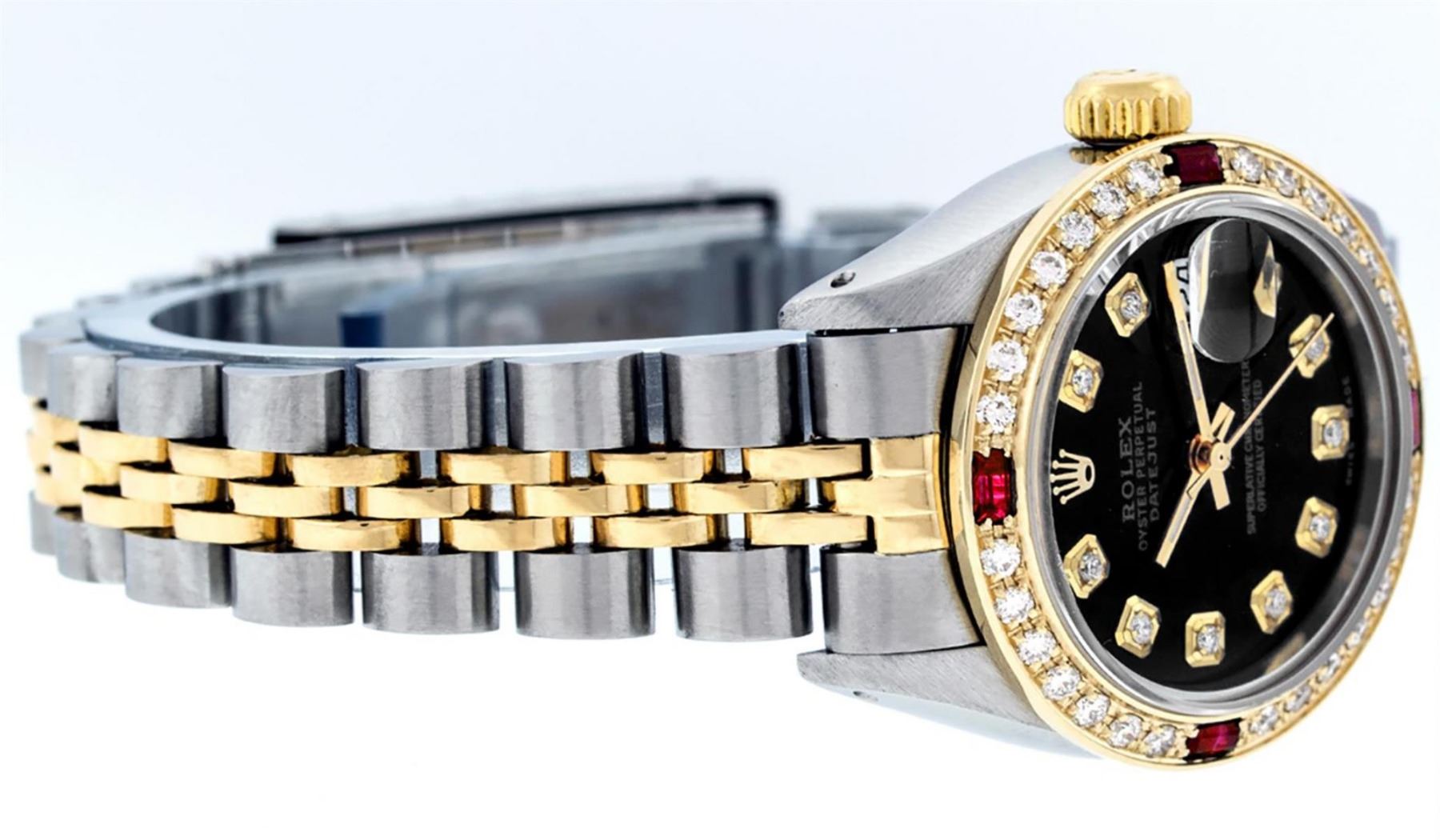 One Ladies Two Tone Rolex Datejust Polished, Serviced & Electronically Tested, Yellow Gold & Stainless Steel Case: 26mm, Yellow Gold Crown, Custom Bezel: New 18K Yellow Gold Ruby Beadset Diamond Bezel, Diamond + Gem Count: 28 Diamonds + 4 Rubies, Total Weight .70 Carat, Clarity: SI-VS, Color: G to H. Custom Crystal: New Scratch Resistant Synthetic Sapphire Cyclops Lens. Custom Hands: New Luminescent Hands. Movement: Automatic Winding Movement. Custom Dial: Black Diamond Dial. Date Window: 3 O'Clock Position Date Display, Model: Datejust, Condition: G-6 Extra Fine. Bracelet: Two Tone Yellow Gold & Stainless Steel Jubilee Band. Bright Polish. 6.0 Inch Length, Adjustable. Standard Clasp, With Rolex Logo. This Watch Has Been Serviced Time Tested And Is In Excellent Condition It Is Free Of All Scratches And Dents.