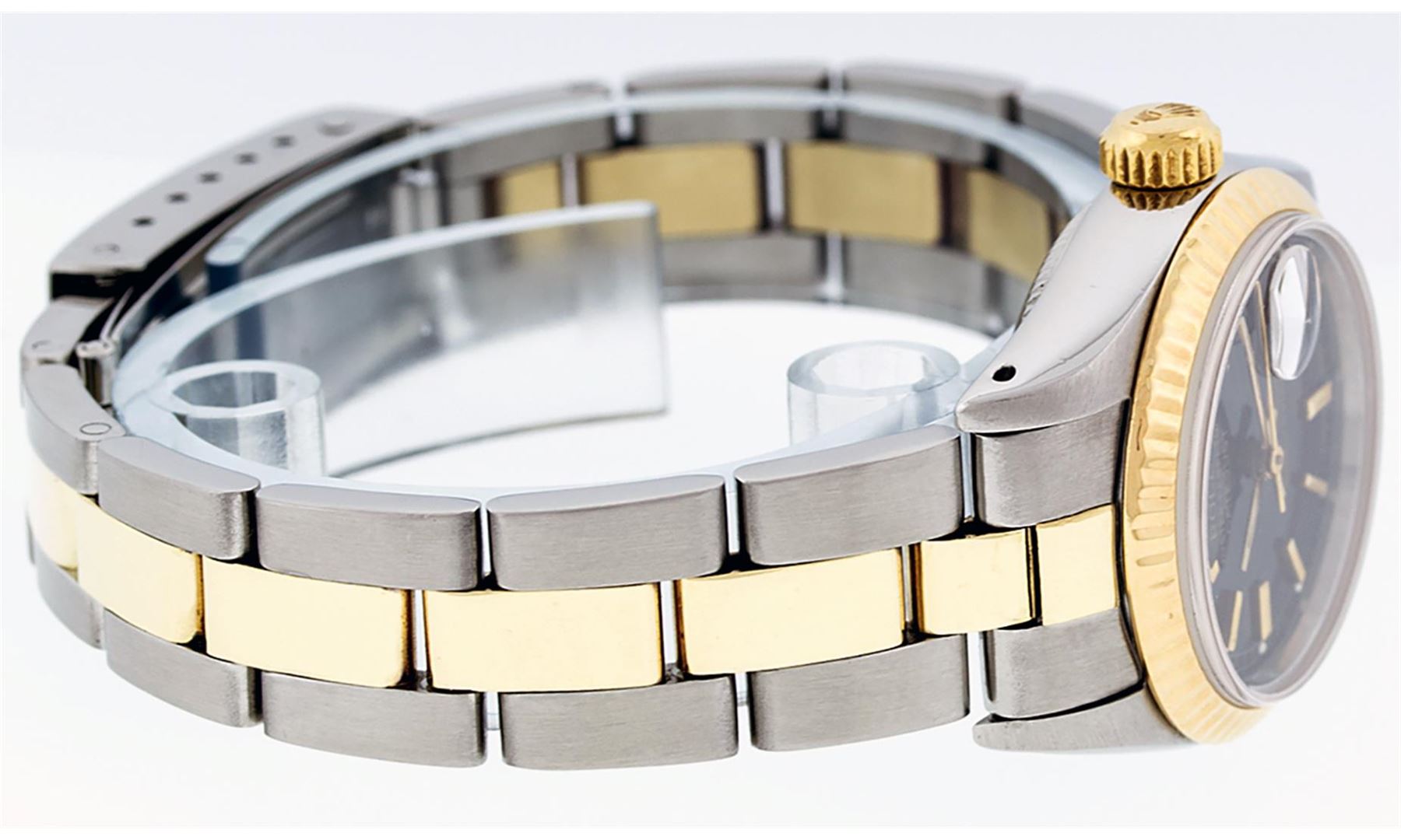 One Ladies Two Tone Rolex Datejust Polished, Serviced & Electronically Tested, Yellow Gold & Stainless Steel Case: 26mm, Yellow Gold Crown, Bezel: Yellow Gold Fluted Bezel. Custom Crystal: New Acrylic Cyclops Lens. Custom Hands: New Luminescent Hands. Movement: Automatic Winding Movement. Custom Dial: Black Index With Dash Track & Lumi Dots. Date Window: 3 O'Clock Position Date Display, Model: Datejust. Condition: G-6 Extra Fine. Bracelet: Two Tone Yellow Gold & Stainless Steel Oyster Band. Bright Polish. 6.0 Inch Length, Adjustable. Standard Clasp, With Rolex Logo. This Watch Has Been Serviced Time Tested And Is In Excellent Condition It Is Free Of All Scratches And Dents.