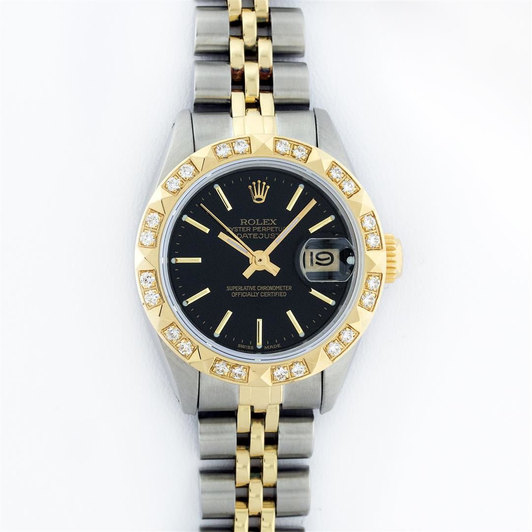 One Ladies Two Tone Rolex Oyster Perpetual Datejust Polished, Serviced & Electronically Tested, Yellow Gold & Stainless Steel Case: 26mm, Yellow Gold Crown, Custom Bezel: New 18K Yellow Gold Pyramid Diamond Bezel, Diamond Count: 24 Diamonds In Bezel. Total Weight .50 Carat, Clarity: SI-VS, Color: G to H. Custom Crystal: New Synthetic Sapphire Cyclops Lens. Custom Hands: New Luminescent Hands. Movement: Automatic Winding Movement. Custom Dial: Black Index With Dash Track & Lumi Dots. Date Window: 3 O'Clock Position Date Display, Model: Datejust. Condition: G-6 Extra Fine. Bracelet: Two Tone Yellow Gold & Stainless Steel Jubilee. Bright Polish. 6.0 Inch Length, Adjustable. Standard Clasp, With Rolex Logo. This Watch Has Been Serviced Time Tested And Is In Excellent Condition It Is Free Of All Scratches And Dents.