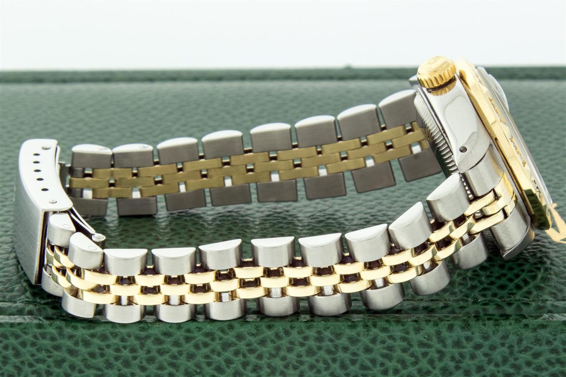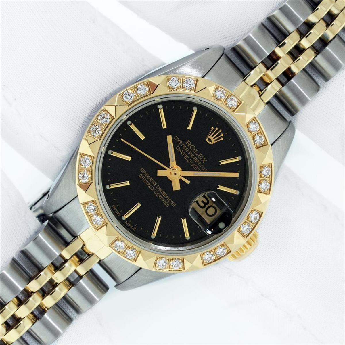One Ladies Two Tone Rolex Oyster Perpetual Datejust Polished, Serviced & Electronically Tested, Yellow Gold & Stainless Steel Case: 26mm, Yellow Gold Crown, Custom Bezel: New 18K Yellow Gold Pyramid Diamond Bezel, Diamond Count: 24 Diamonds In Bezel. Total Weight .50 Carat, Clarity: SI-VS, Color: G to H. Custom Crystal: New Synthetic Sapphire Cyclops Lens. Custom Hands: New Luminescent Hands. Movement: Automatic Winding Movement. Custom Dial: Black Index With Dash Track & Lumi Dots. Date Window: 3 O'Clock Position Date Display, Model: Datejust. Condition: G-6 Extra Fine. Bracelet: Two Tone Yellow Gold & Stainless Steel Jubilee. Bright Polish. 6.0 Inch Length, Adjustable. Standard Clasp, With Rolex Logo. This Watch Has Been Serviced Time Tested And Is In Excellent Condition It Is Free Of All Scratches And Dents. This Watch Comes With A Rolex Box.