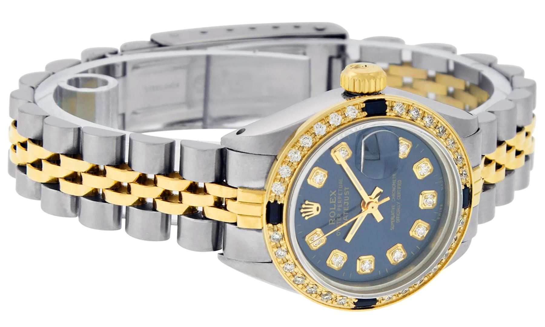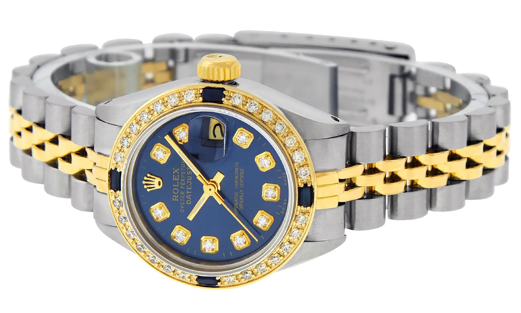 One Ladies 14K Two Tone Rolex Datejust Polished, Serviced & Electronically Tested, 14K Yellow Gold & Stainless Steel Case: 26mm, 14K Yellow Gold Crown, Custom Bezel: New 18K Yellow Gold Sapphire Beadset Diamond Bezel, Diamond + Gem Count: 28 Diamonds + 4 Sapphires Total Weight .70 Carat, Clarity: SI-VS, Color: G to H. Custom Crystal: New Scratch Resistant Synthetic Sapphire Cyclops Lens. Custom Hands: New Luminescent Hands. Movement: Automatic Winding Movement Caliber 2030. Custom Dial: Blue Dial Set With Single Cut Diamond Hour Markers & Dash Track, Diamond Count: 10 Diamond in Dial, G To H In Color, SI-VS Clarity. Date Window: 3 O'Clock Position Date Display, Model: Datejust, Condition: G-6 Extra Fine. Bracelet: Two Tone 14K Yellow Gold & Stainless Steel Jubilee Band. Bright Polish. 6.0 Inch Length, Adjustable. Standard Clasp, With Rolex Logo. This Watch Has Been Serviced Time Tested And Is In Excellent Condition It Is Free Of All Scratches And Dents.