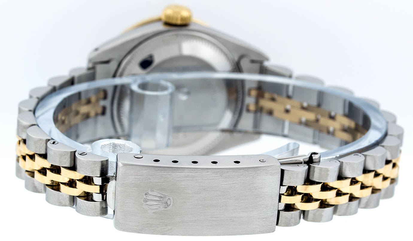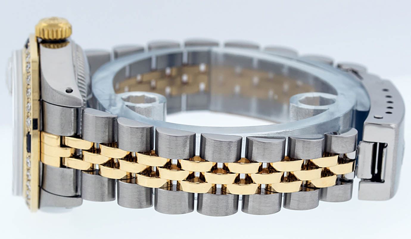 One Ladies 14K Two Tone Rolex Datejust Polished, Serviced & Electronically Tested, 14K Yellow Gold & Stainless Steel Case: 26mm, 14K Yellow Gold Crown, Custom Bezel: 18K Yellow Gold Sapphire Beadset Diamond Bezel, Diamond Count: 28 Diamonds + 4 Sapphires. Total Weight .70 Carat, Clarity: Si-VS, Color: G to H. Custom Crystal: New Synthetic Sapphire Cyclops Lens. Custom Hands: New Luminescent Hands. Movement: Automatic Winding Movement Caliber 2030. Custom Dial: Blue Mother Of Pearl With String Diamond Hour Markers. Diamond Count: 43 Diamonds In Dial, Clarity: Si-VS, Color: G to H. Date Window: 3 O'Clock Position Date Display, Non Quickset, Model: Datejust. Condition: G-6 Extra Fine. Bracelet: Two Tone 14K Yellow Gold & Stainless Steel Jubilee. Bright Polish. 6.0 Inch Length, Adjustable. Standard Clasp, With Rolex Logo.