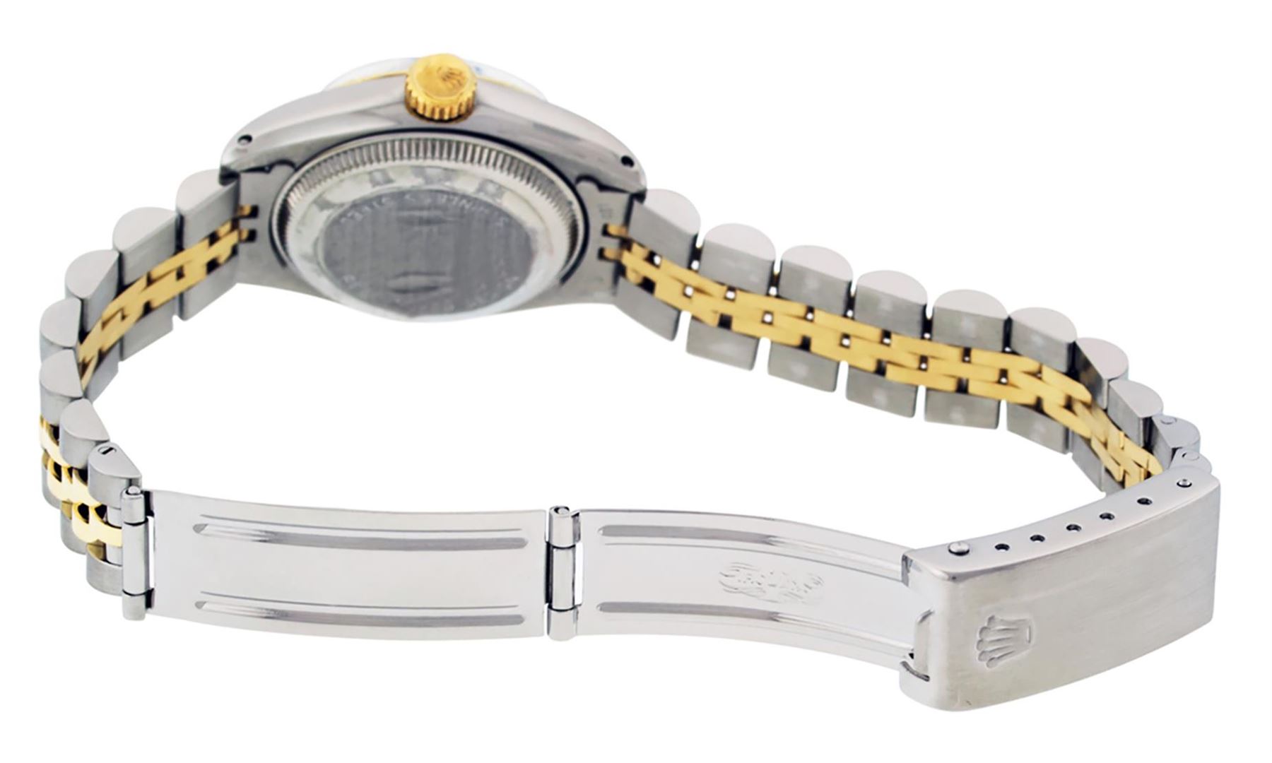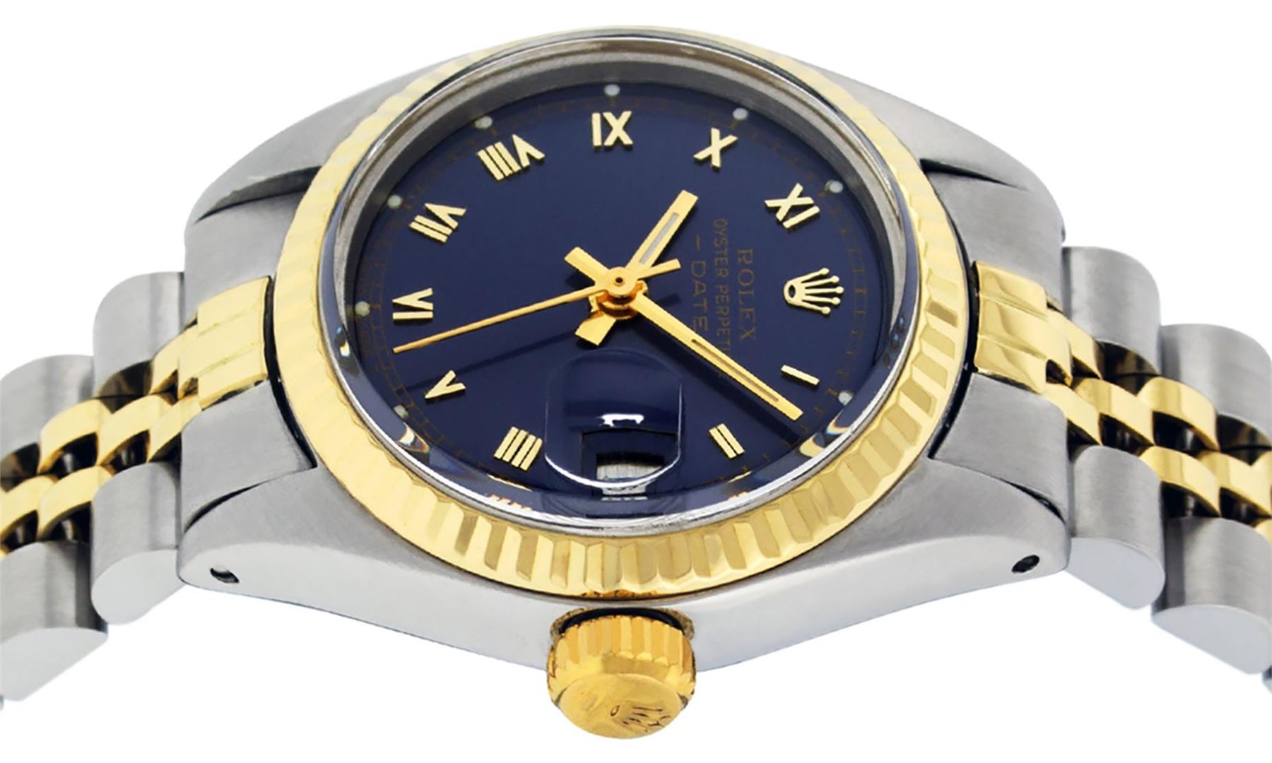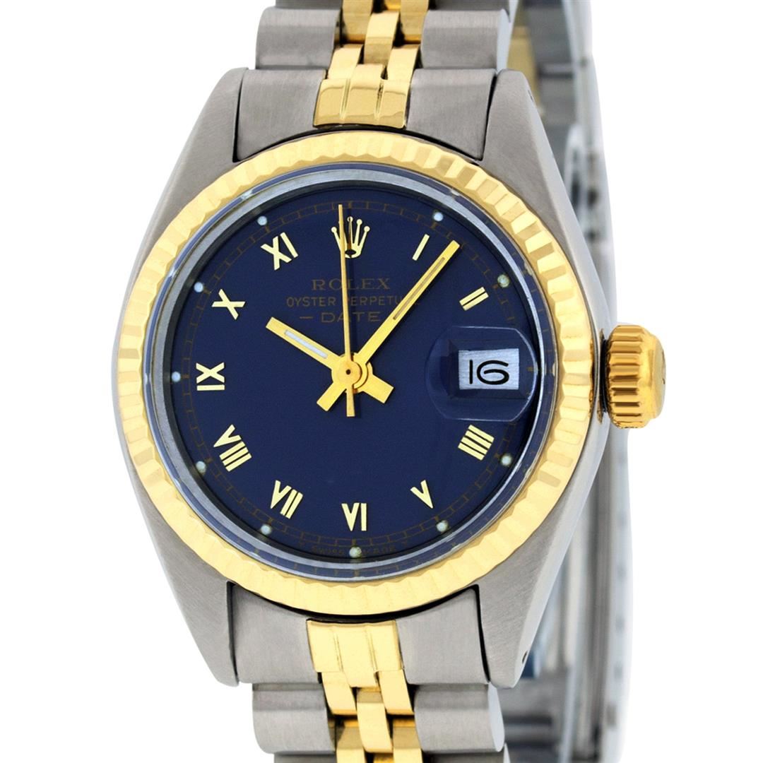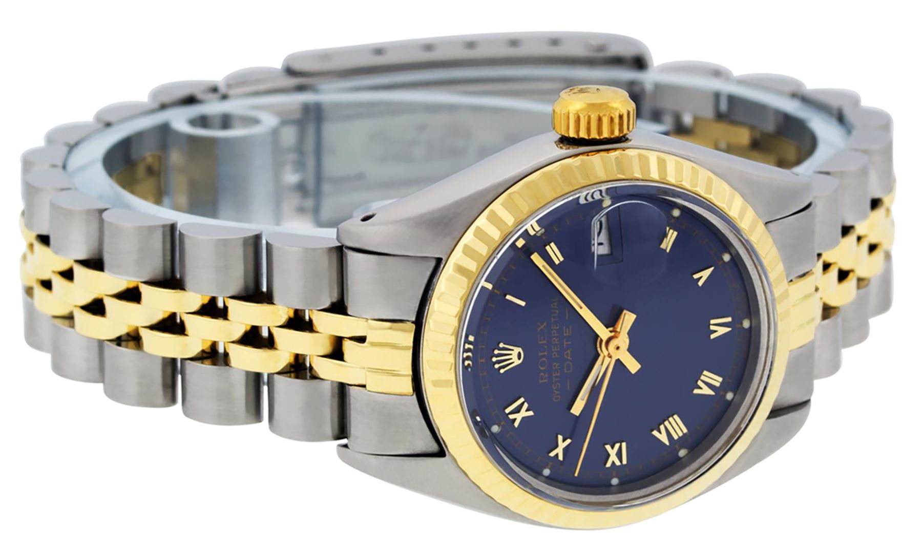 One Ladies Two Tone Rolex Datejust Polished, Serviced & Electronically Tested, Yellow Gold & Stainless Steel Case: 26mm, Yellow Gold Crown, Bezel: Yellow Gold Fluted Bezel. Custom Crystal: New Acrylic Cyclops Lens. Hands: Luminescent Hands. Movement: Automatic Winding Movement. Dial: Blue Arabic With Square Track And Lumi Dots. Date Window: 3 O'Clock Position Date Display, Model: Datejust. Condition: G-6 Extra Fine. Bracelet: Two Tone Yellow Gold & Stainless Steel Jubilee Band. Bright Polish. 6.0 Inch Length, Adjustable. Standard Clasp, With Rolex Logo. This Watch Has Been Serviced Time Tested And Is In Excellent Condition It Is Free Of All Scratches And Dents.