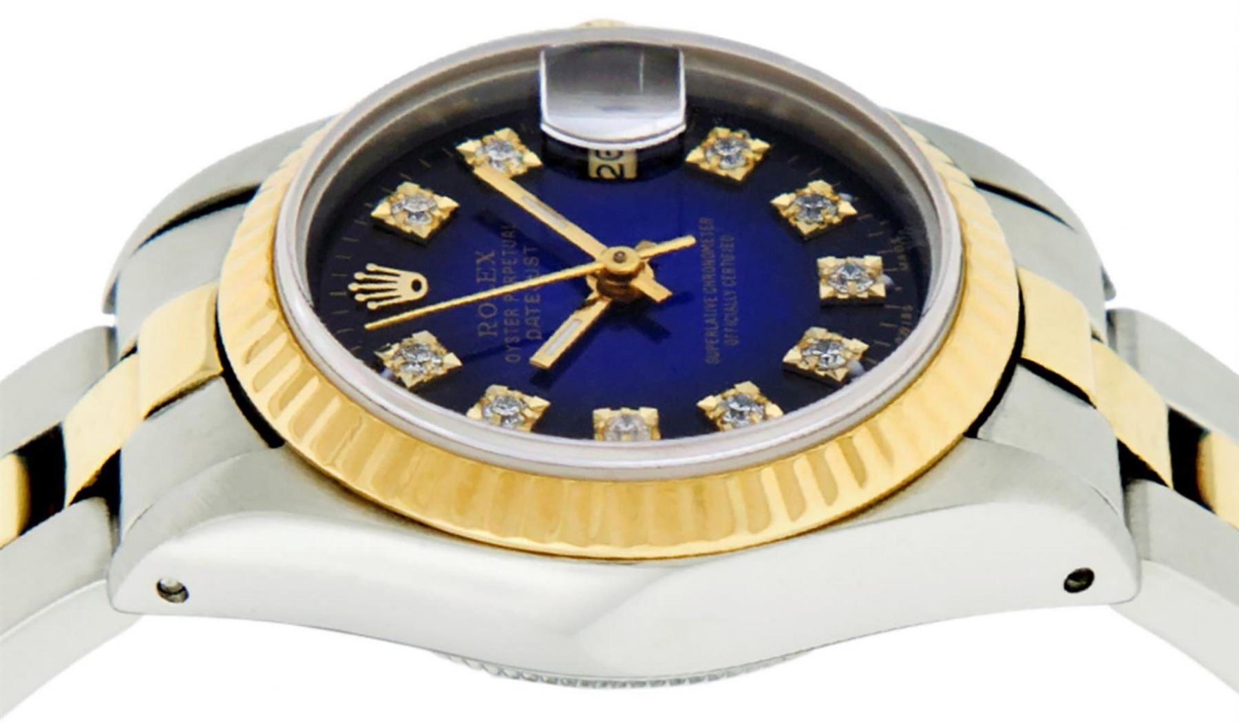 One Ladies Two Tone Rolex Datejust Polished, Serviced & Electronically Tested, Yellow Gold & Stainless Steel Case: 26mm, Yellow Gold Crown, Bezel: Yellow Gold Fluted Bezel. Custom Crystal: New Acrylic Cyclops Lens. Custom Hands: New Luminescent Hands. Movement: Automatic Winding Movement. Custom Dial: Blue Vignette With Diamond Hour Markers, Diamond Count: 10 Single Cut Diamonds, Color: G to H, Clarity: VS. Date Window: 3 O'Clock Position Date Display, Model: Datejust. Condition: G-6 Extra Fine. Bracelet: Two Tone Yellow Gold & Stainless Steel Jubilee. Bright Polish. 6.0 Inch Length, Adjustable. Standard Clasp, With Rolex Logo. This Watch Has Been Serviced Time Tested And Is In Excellent Condition It Is Free Of All Scratches And Dents.