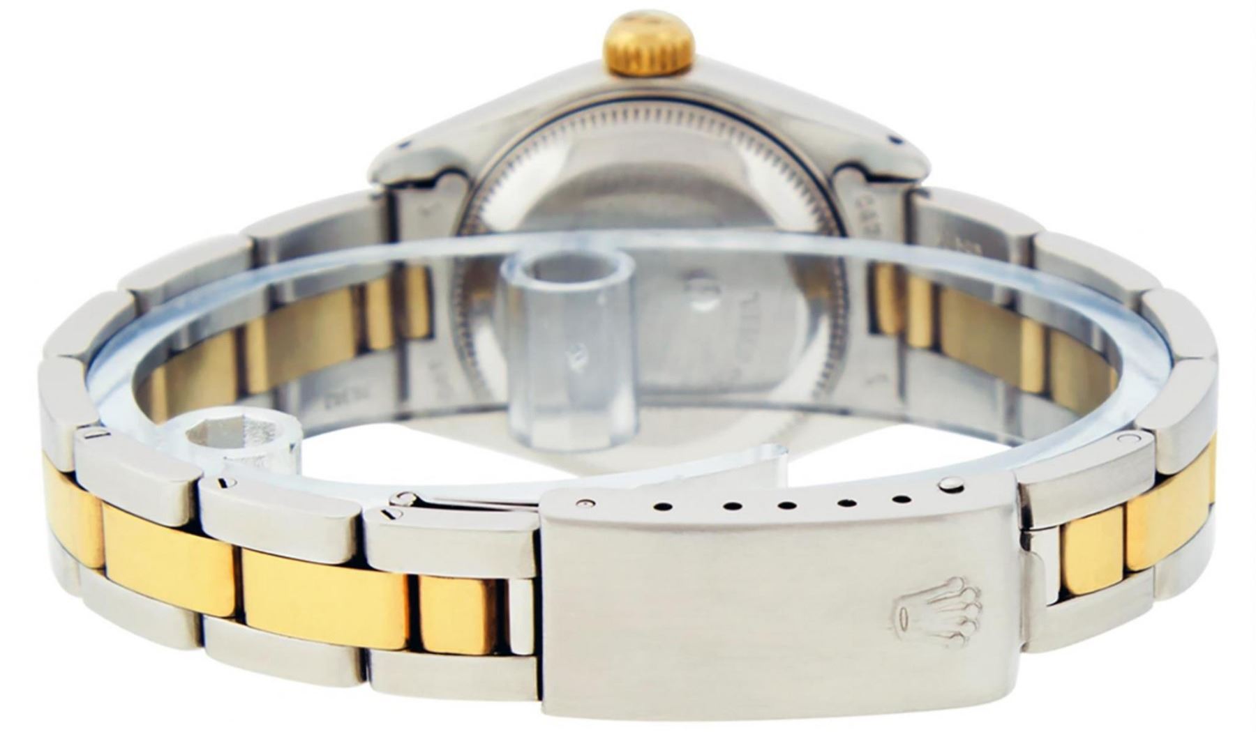 One Ladies Two Tone Rolex Datejust Polished, Serviced & Electronically Tested, Yellow Gold & Stainless Steel Case: 26mm, Yellow Gold Crown, Bezel: Yellow Gold Fluted Bezel. Custom Crystal: New Acrylic Cyclops Lens. Custom Hands: New Luminescent Hands. Movement: Automatic Winding Movement. Custom Dial: Blue Vignette With Diamond Hour Markers, Diamond Count: 10 Single Cut Diamonds, Color: G to H, Clarity: VS. Date Window: 3 O'Clock Position Date Display, Model: Datejust. Condition: G-6 Extra Fine. Bracelet: Two Tone Yellow Gold & Stainless Steel Jubilee. Bright Polish. 6.0 Inch Length, Adjustable. Standard Clasp, With Rolex Logo. This Watch Has Been Serviced Time Tested And Is In Excellent Condition It Is Free Of All Scratches And Dents.