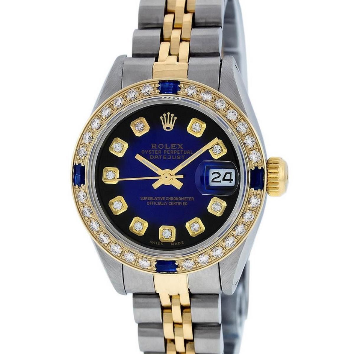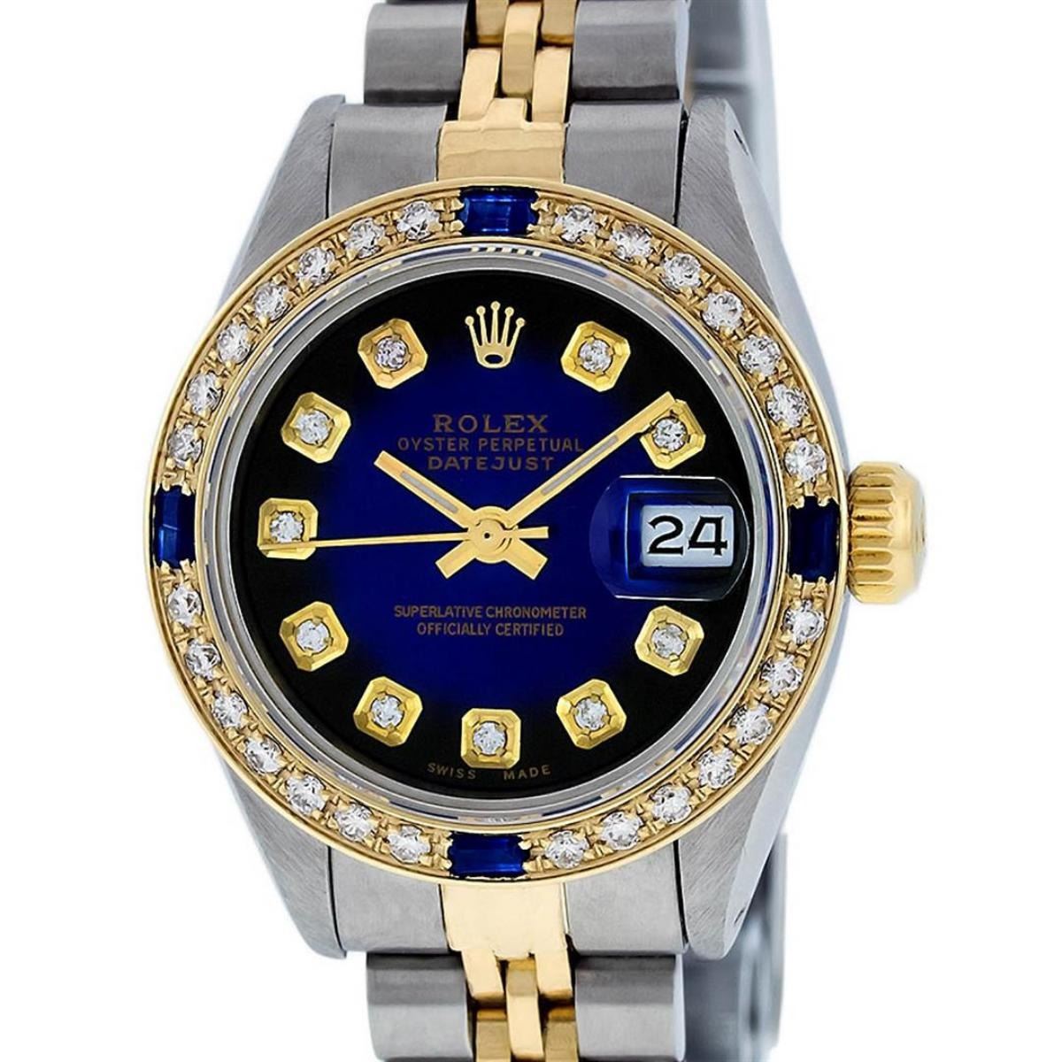 One Ladies 14K Two Tone Rolex Datejust Polished, Serviced & Electronically Tested, 14K Yellow Gold & Stainless Steel Case: 26mm, 14K Yellow Gold Crown, Custom Bezel: New 18K Yellow Gold Sapphire Beadset Diamond Bezel, Diamond + Gem Count: 28 Diamonds + 4 Sapphires Total Weight .70 Carat, Clarity: Si-VS, Color: G to H. Custom Crystal: New Synthetic Sapphire Cyclops Lens. Custom Hands: New Luminescent Hands. Movement: Automatic Winding Movement Caliber 2030. Custom Dial: Blue Vignette Dial Set With Diamond Hour Markers, Diamond Count: 10 Diamond in Dial, G To H In Color, SI-VS Clarity. Date Window: 3 O'Clock Position Date Display, Model: Datejust, Condition: G-6 Extra Fine. Bracelet: Two Tone 14K Yellow Gold & Stainless Steel Jubilee. Bright Polish. 6.0 Inch Length, Adjustable. Standard Clasp, With Rolex Logo. This Watch Has Been Serviced Time Tested And Is In Excellent Condition It Is Free Of All Scratches And Dents.