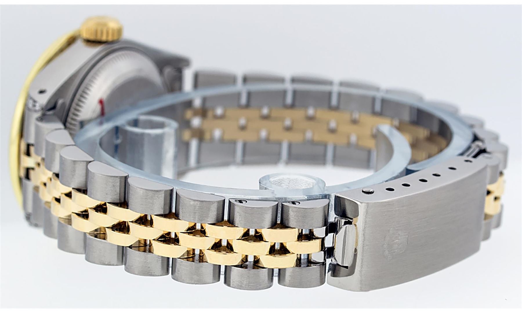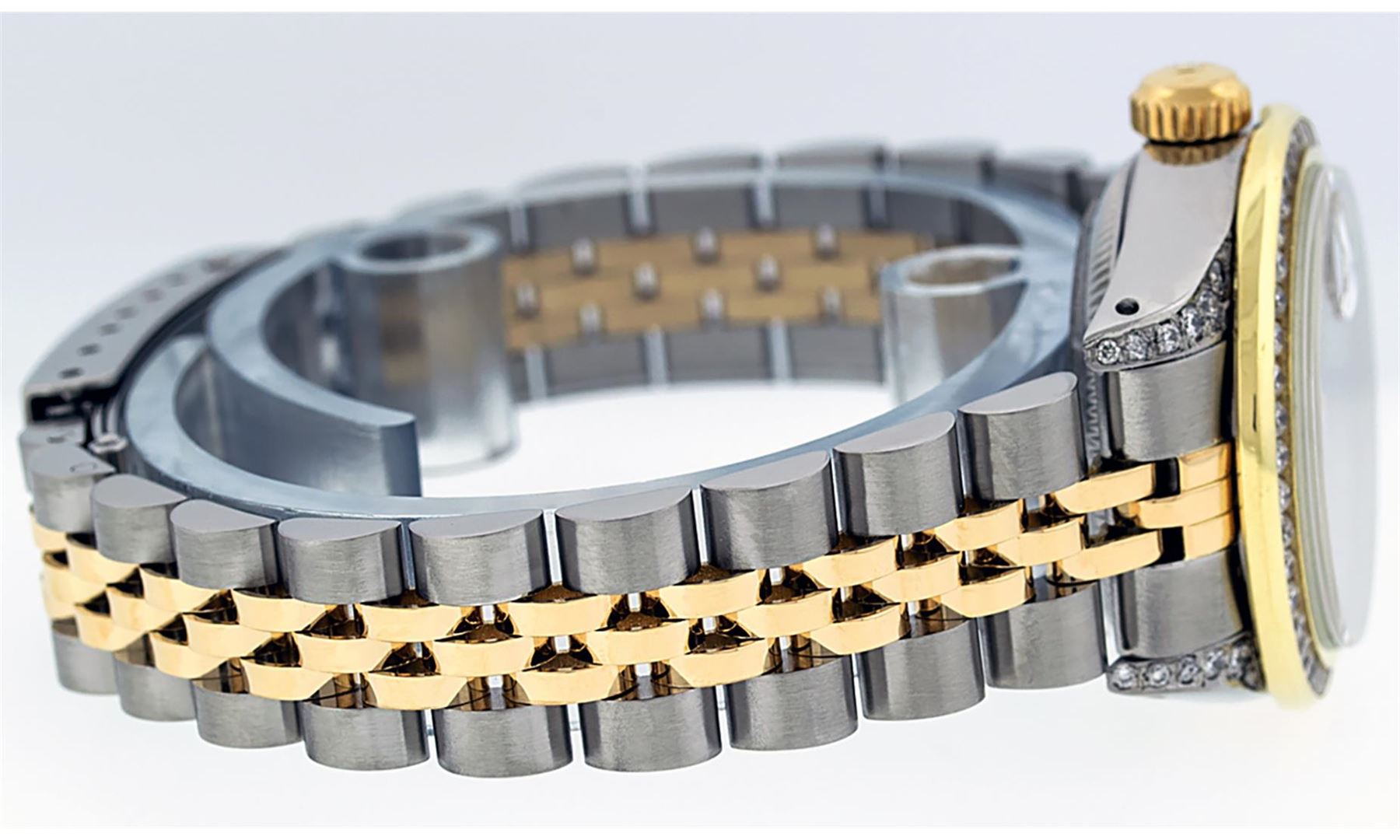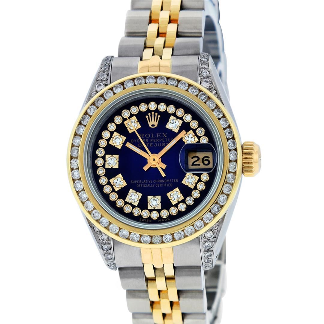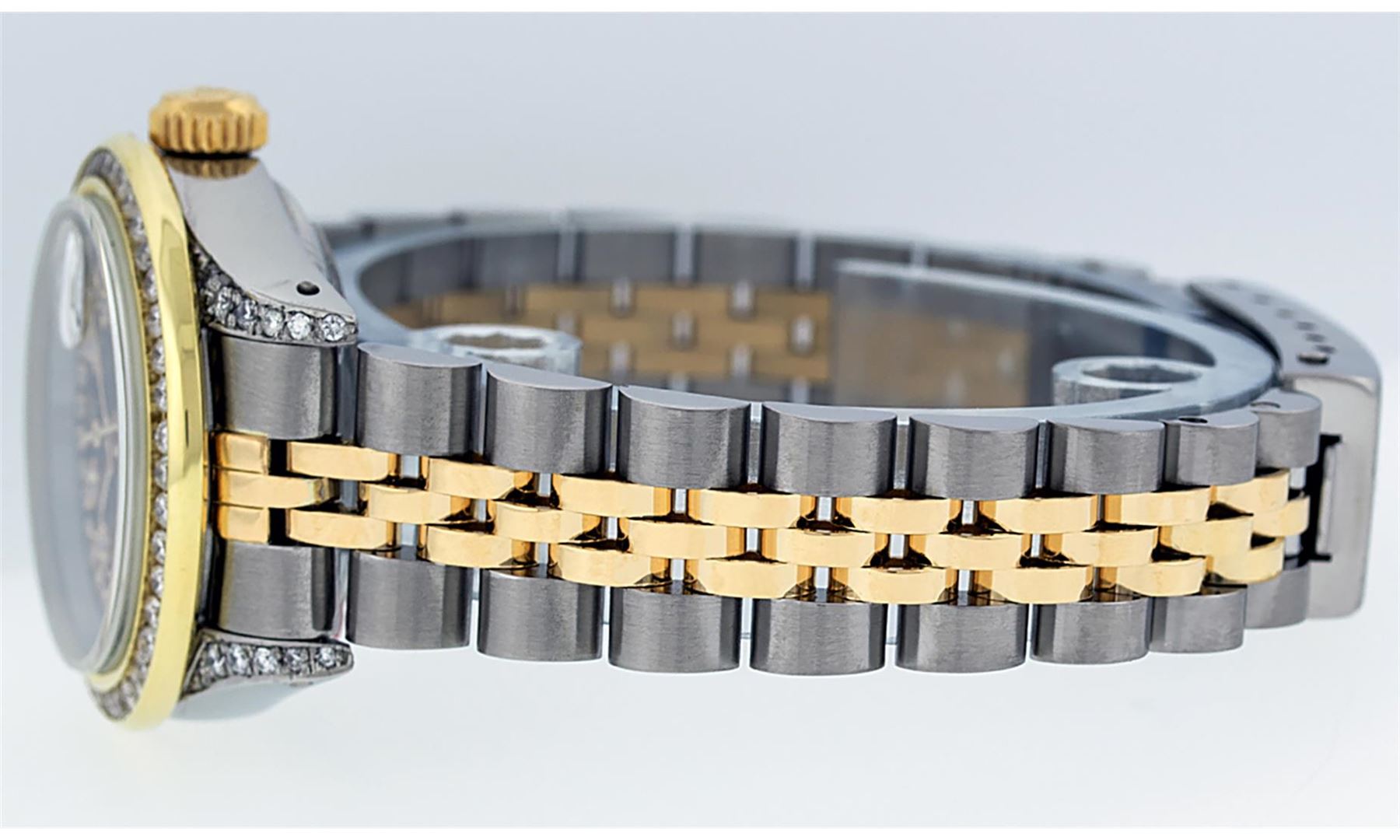 One Ladies Pre Owned Two Tone Rolex Datejust Polished, Serviced & Electronically Tested, Yellow Gold & Stainless Steel Case: 26mm, Yellow Gold Crown, Diamond Lugs: 24 Diamonds On Lugs, Clarity: SI-VS, Color: G to H. Custom Bezel: New 1ctw 18K Yellow Gold