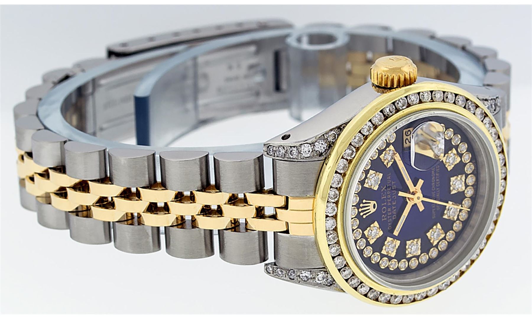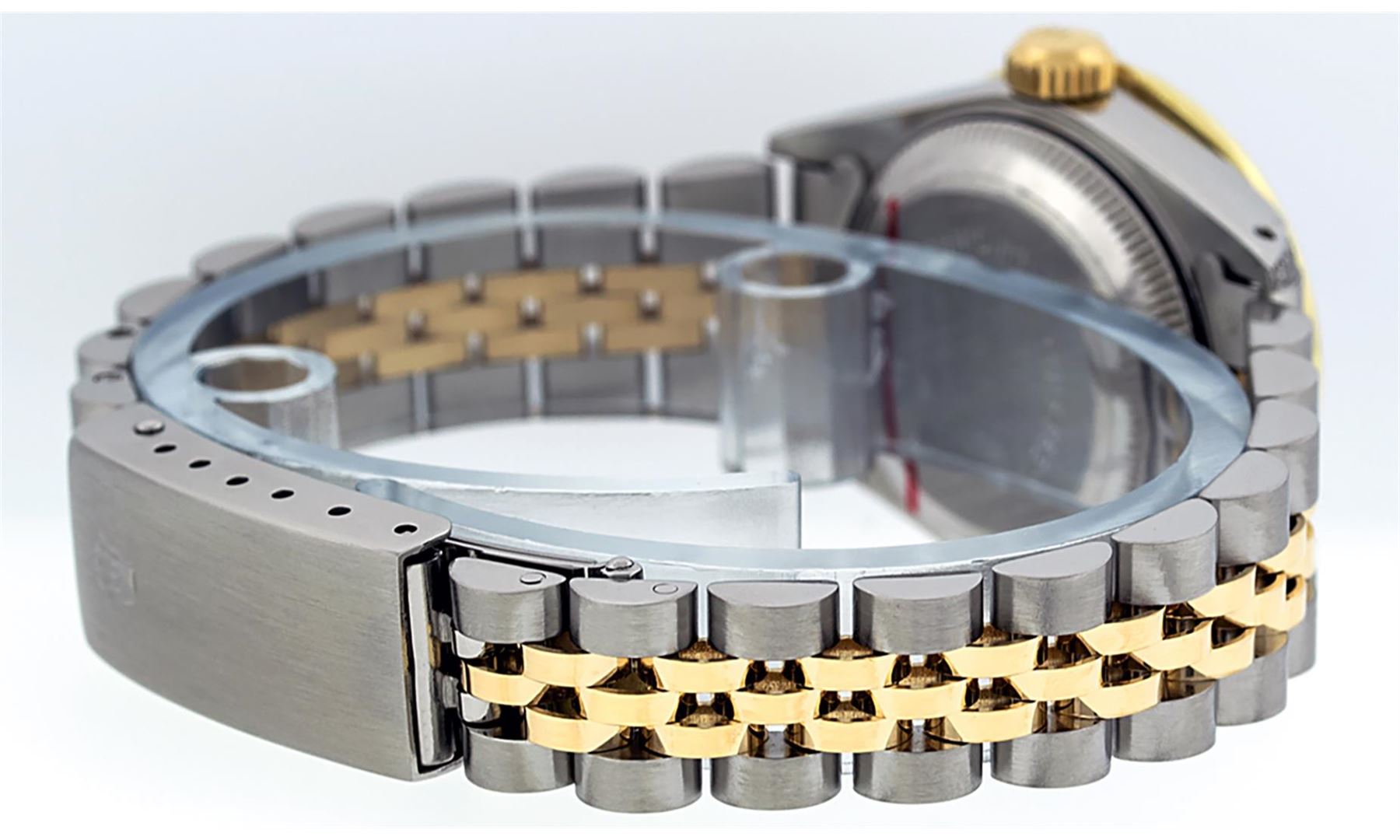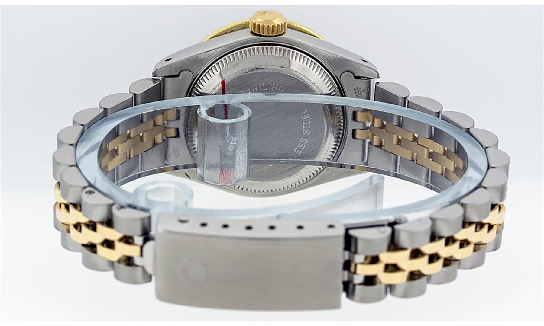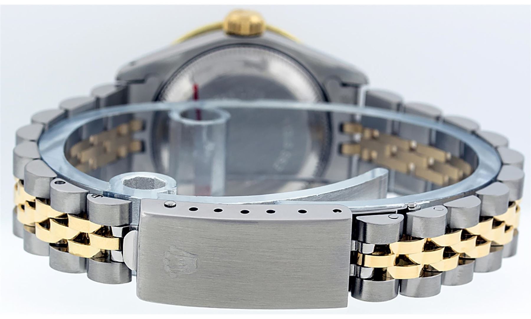 One Ladies Pre Owned Two Tone Rolex Datejust Polished, Serviced & Electronically Tested, Yellow Gold & Stainless Steel Case: 26mm, Yellow Gold Crown, Diamond Lugs: 24 Diamonds On Lugs, Clarity: SI-VS, Color: G to H. Custom Bezel: New 1ctw 18K Yellow Gold