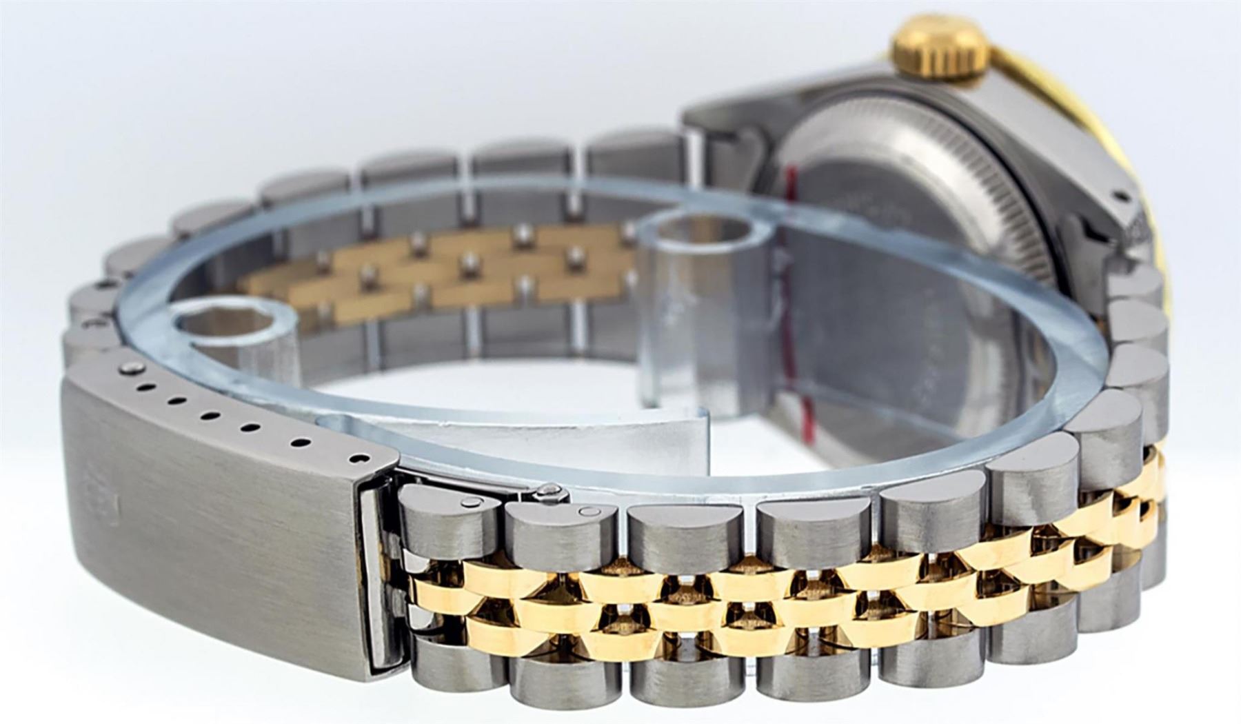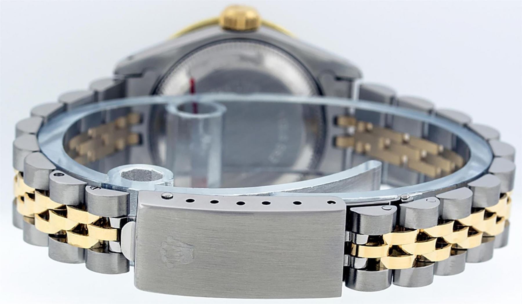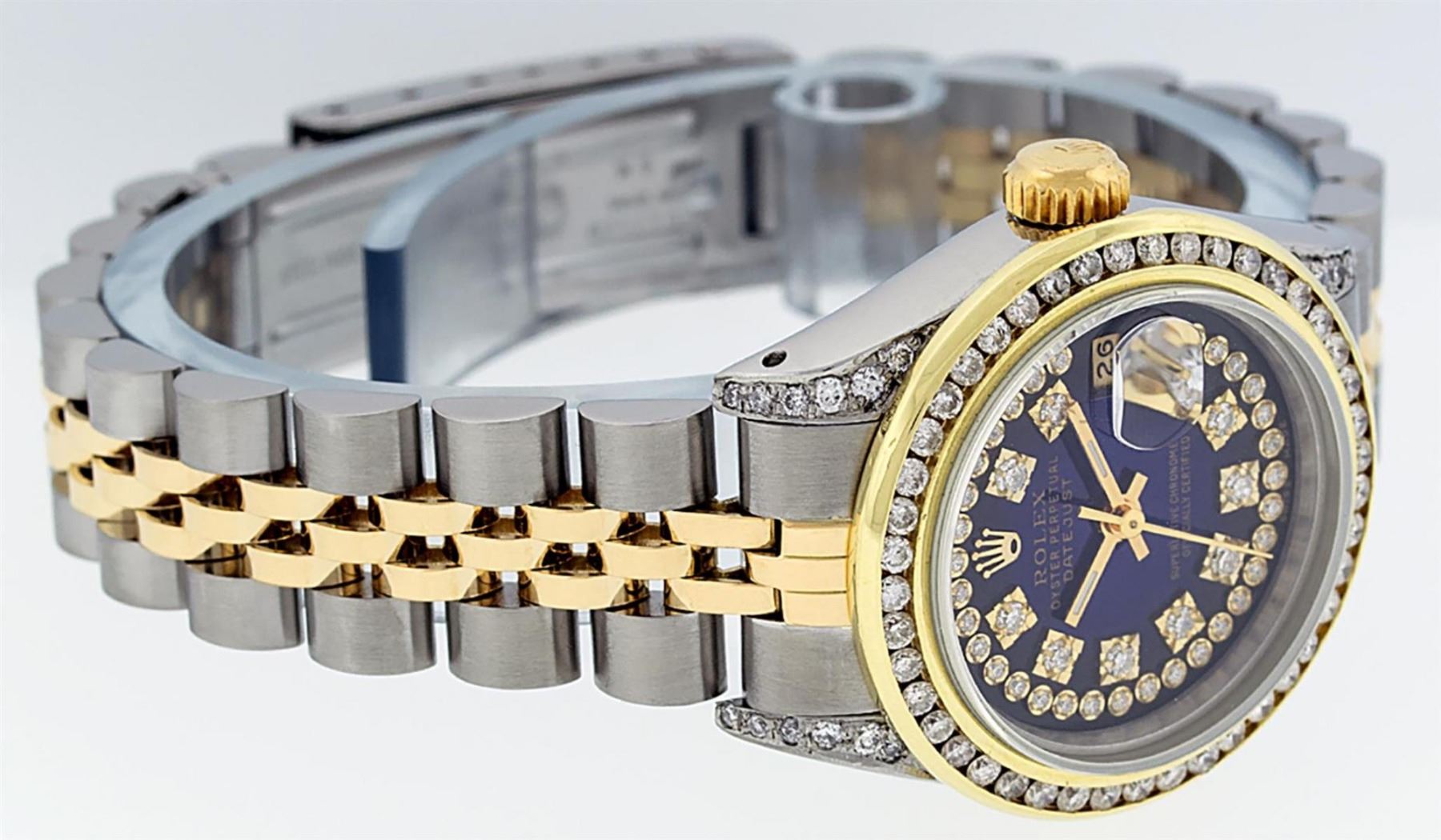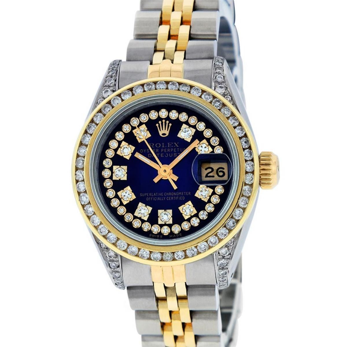 One Ladies Two Tone Rolex Datejust Polished, Serviced & Electronically Tested, Yellow Gold & Stainless Steel Case: 26mm, Yellow Gold Crown, Diamond Lugs: 24 Diamonds On Lugs, Clarity: SI-VS, Color: G to H. Custom Bezel: New 1ctw 18K Yellow Gold Channel Set Diamond Bezel, Diamond Count: 44 Diamonds In Bezel, Total Weight 1.00 Carat, Clarity: SI-VS, Color: G to H. Custom Crystal: New Scratch Resistant Synthetic Sapphire Cyclops Lens. Custom Hands: New Luminescent Hands. Movement: Automatic Winding Movement. Custom Dial: Blue Vignette String Diamond Dial With Single Cut Diamond Hour Markers, Diamond Count: 43 Diamonds In Dial, Clarity: SI-VS, Color: G to H. Date Window: 3 O'Clock Position Date Display, Model: Datejust. Condition: G-6 Extra Fine. Bracelet: Two Tone Yellow Gold & Stainless Steel Jubilee Band. Bright Polish. 6.0 Inch Length, Adjustable. Standard Clasp, With Rolex Logo. This Watch Has Been Serviced Time Tested And Is In Excellent Condition It Is Free Of All Scratches And Dents.
