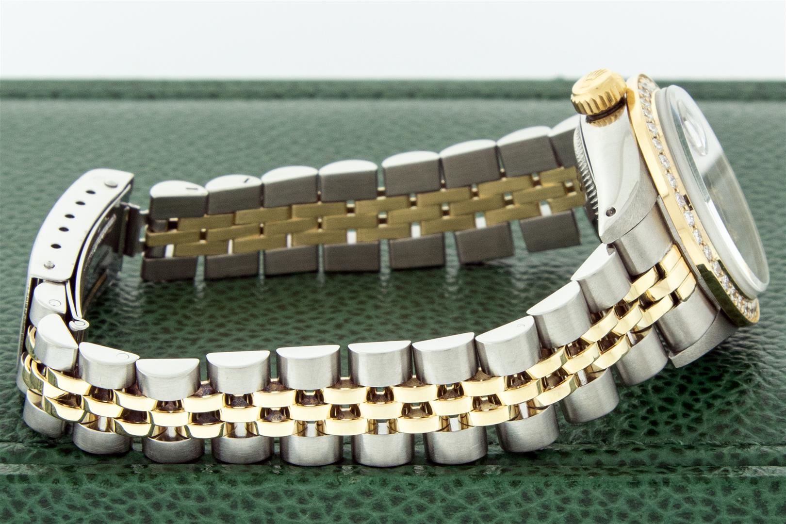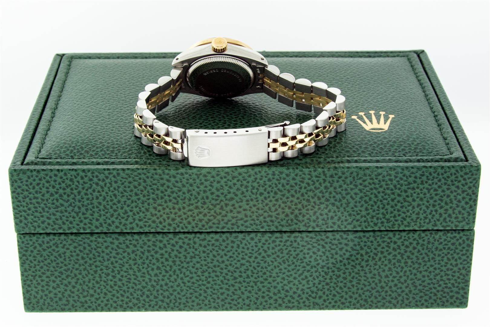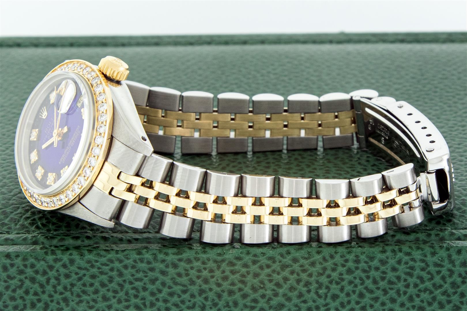 One Ladies Two Tone Rolex Datejust Polished, Serviced & Electronically Tested, Yellow Gold & Stainless Steel Case: 26mm, Yellow Gold Crown, Custom Bezel: New 18K 1ctw Yellow Gold Beadset Diamond Bezel, Diamond Count: 42 Diamonds, Total Weight 1.00 Carat, Clarity: SI-VS, Color: G to H. Custom Crystal: New Synthetic Sapphire Cyclops Lens. Custom Hands: New Luminescent Hands. Movement: Automatic Winding Movement. Custom Dial: Blue Vignette VS Diamond Dial, Diamond Count: 10 Single Cut Diamonds in Dial, G To H In Color, VS Clarity. Date Window: 3 O'Clock Position Date Display, Model: Datejust, Condition: G-6 Extra Fine. Bracelet: Two Tone Yellow Gold & Stainless Steel Jubilee. Bright Polish. 6.0 Inch Length, Adjustable. Standard Clasp, With Rolex Logo. This Watch Has Been Serviced Time Tested And Is In Excellent Condition It Is Free Of All Scratches And Dents.