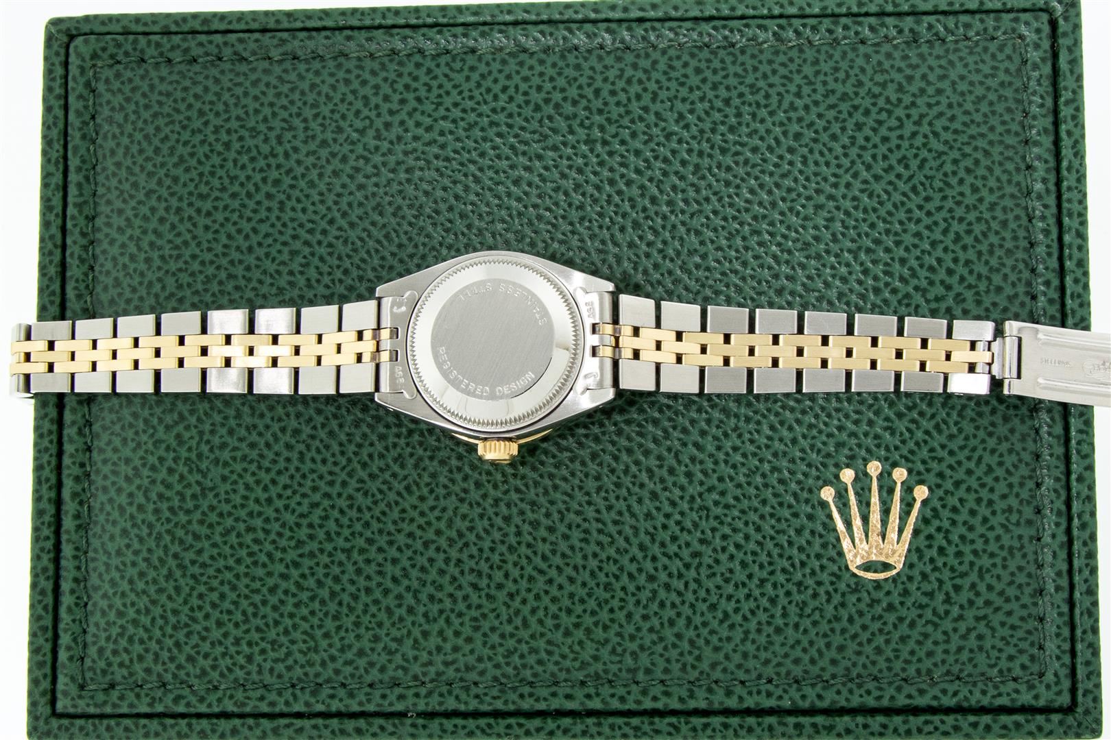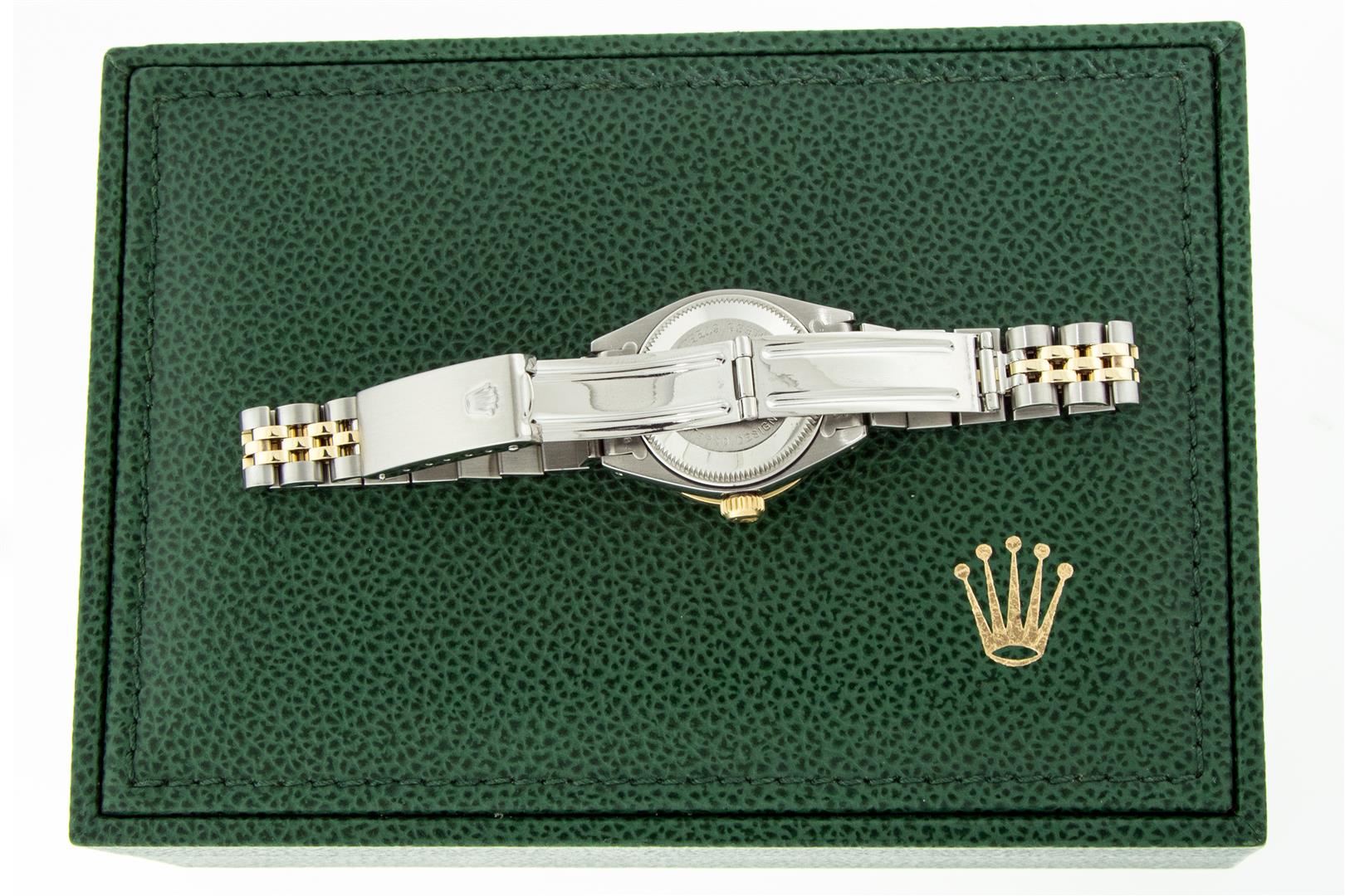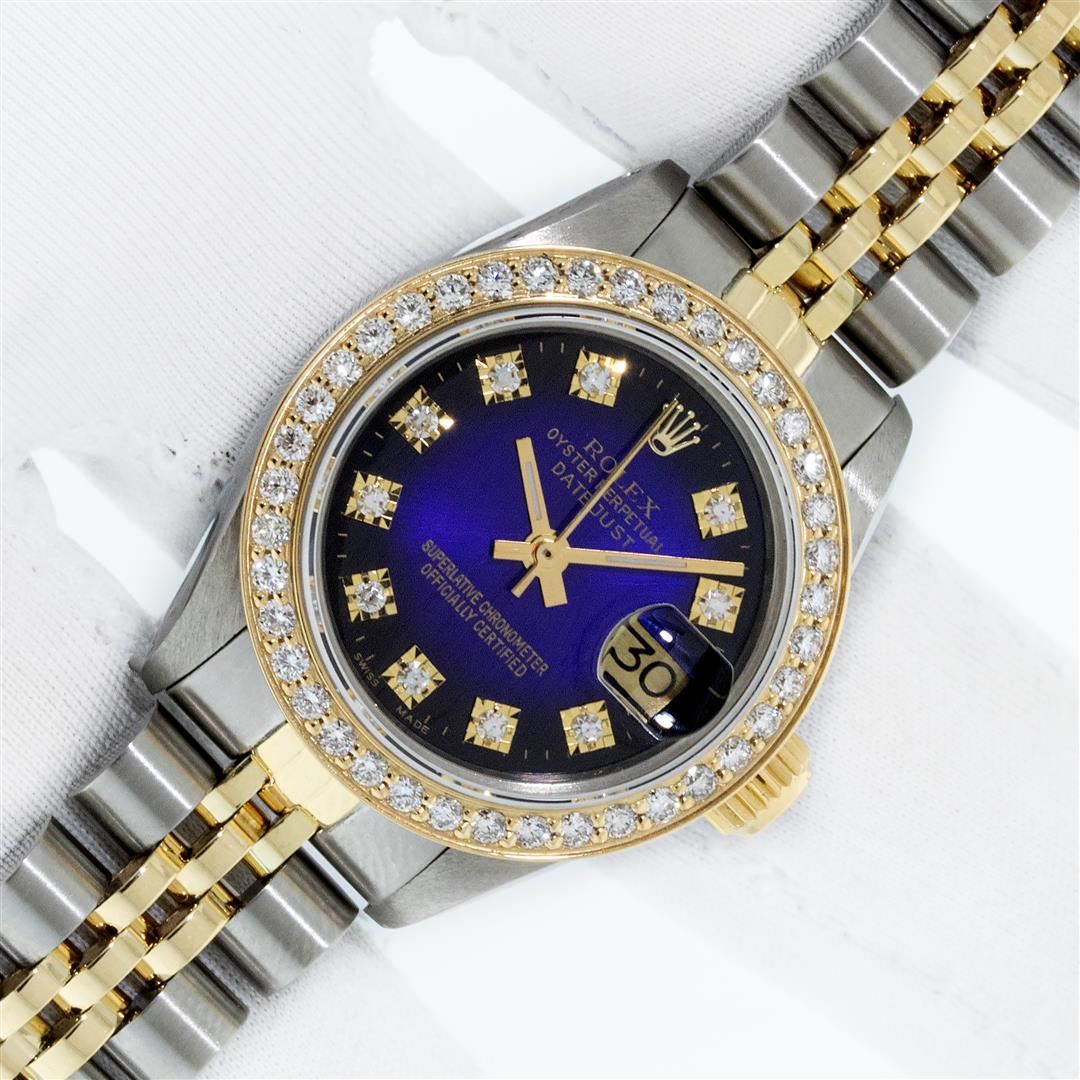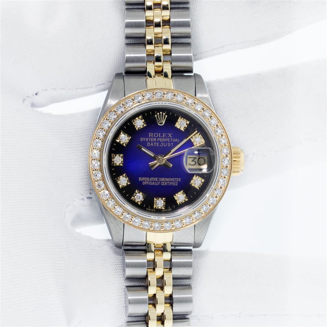 One Ladies Two Tone Rolex Datejust Polished, Serviced & Electronically Tested, Yellow Gold & Stainless Steel Case: 26mm, Yellow Gold Crown, Custom Bezel: New 18K 1ctw Yellow Gold Beadset Diamond Bezel, Diamond Count: 42 Diamonds, Total Weight 1.00 Carat, Clarity: SI-VS, Color: G to H. Custom Crystal: New Synthetic Sapphire Cyclops Lens. Custom Hands: New Luminescent Hands. Movement: Automatic Winding Movement. Custom Dial: Blue Vignette VS Diamond Dial, Diamond Count: 10 Single Cut Diamonds in Dial, G To H In Color, VS Clarity. Date Window: 3 O'Clock Position Date Display, Model: Datejust, Condition: G-6 Extra Fine. Bracelet: Two Tone Yellow Gold & Stainless Steel Jubilee. Bright Polish. 6.0 Inch Length, Adjustable. Standard Clasp, With Rolex Logo. This Watch Has Been Serviced Time Tested And Is In Excellent Condition It Is Free Of All Scratches And Dents.