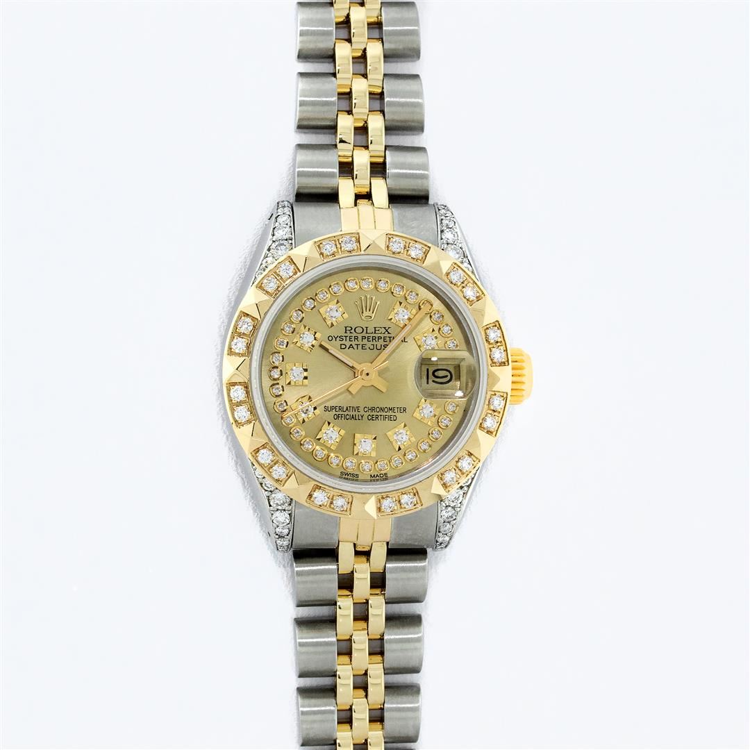 One Ladies Two Tone Rolex Datejust Polished, Serviced & Electronically Tested, Yellow Gold & Stainless Steel Case: 26mm, Yellow Gold Crown, Diamond Lugs: 24 Diamonds On Lugs, Clarity: SI-VS, Color: G to H, Clarity SI-VS. Custom Bezel: New 18K Yellow Gold Pyramid Diamond Bezel, Diamond Count: 24 Diamonds, Total Weight For Bezel .50 Carat, Clarity: SI-VS, Color: G to H. Custom Crystal: New Scratch Resistant Synthetic Sapphire Cyclops Lens. Custom Hands: New Luminescent Hands. Movement: Automatic Winding Movement. Custom Dial: Champagne With Single Cut Diamond Hour Markers, Diamond Count: 43 Diamonds In Dial, Clarity: SI-VS, Color: G to H. Date Window: 3 O'Clock Position Date Display, Model: Datejust. Condition: G-6 Extra Fine. Bracelet: Two Tone Yellow Gold & Stainless Steel Jubilee. Bright Polish. 6.0 Inch Length, Adjustable. Standard Clasp, With Rolex Logo. This Watch Has Been Serviced Time Tested And Is In Excellent Condition It Is Free Of All Scratches And Dents.