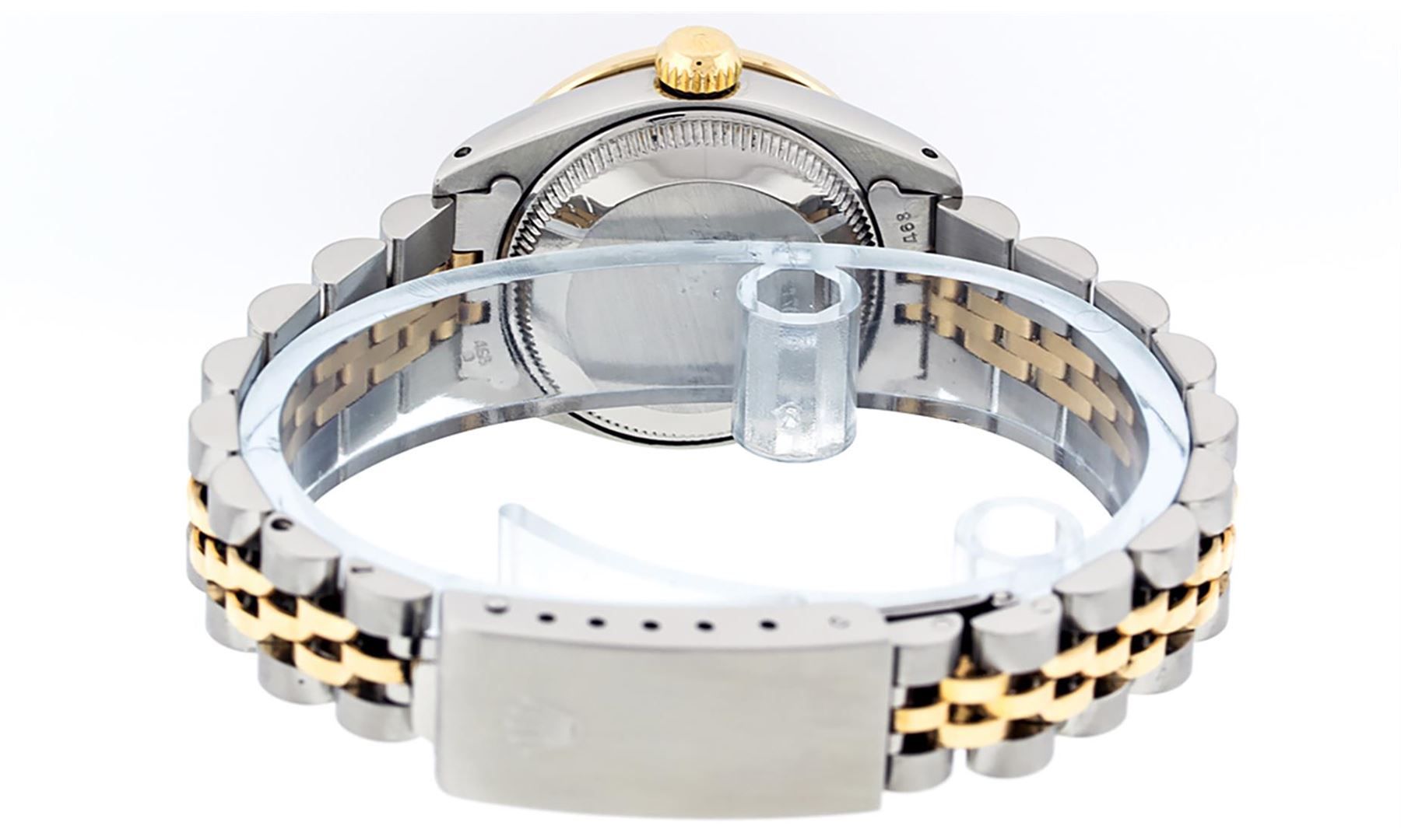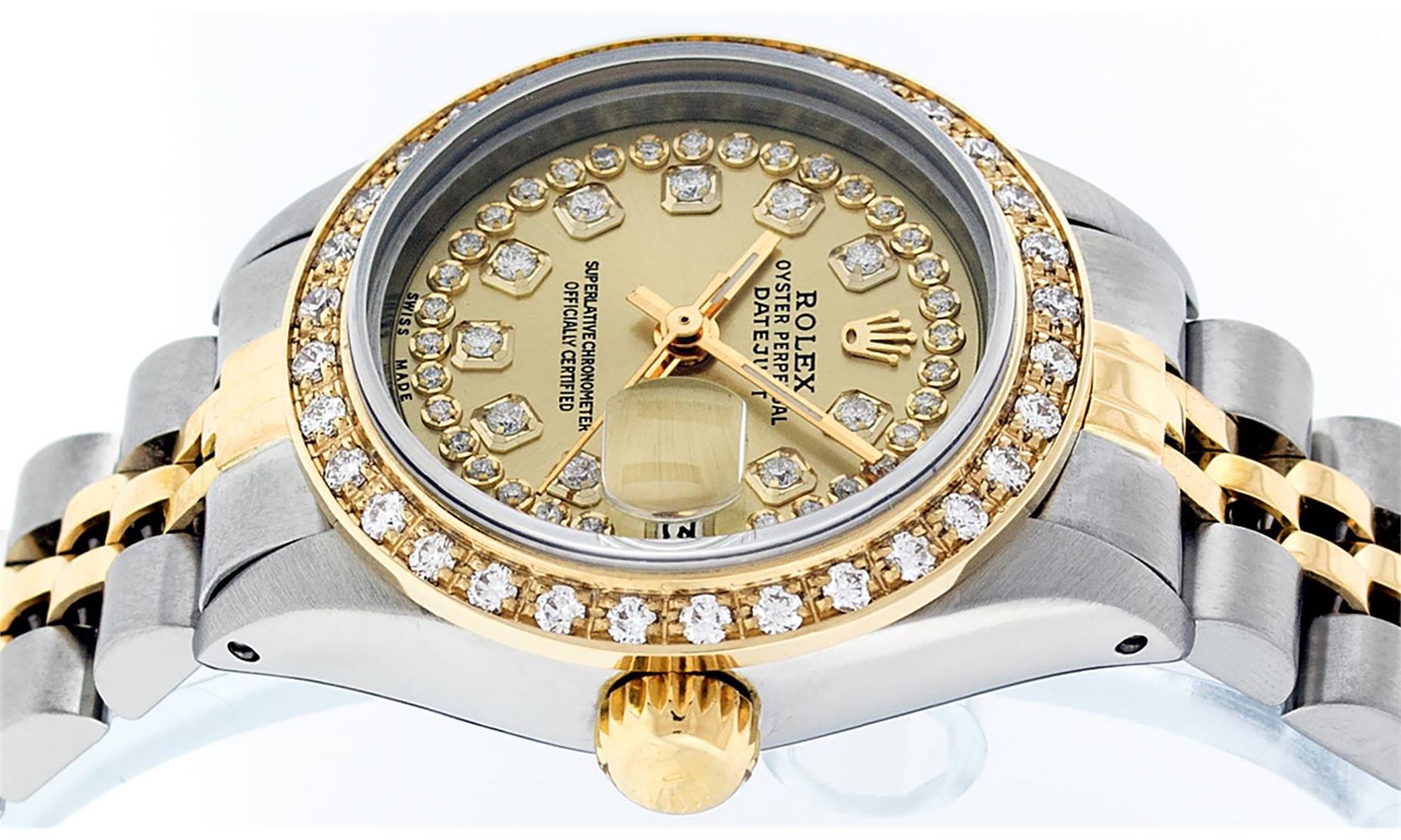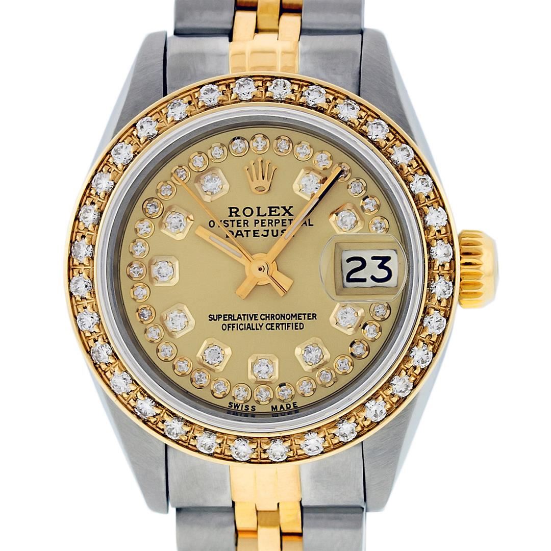 One Ladies Two Tone Rolex Datejust Polished, Serviced & Electronically Tested, Yellow Gold & Stainless Steel Case: 26mm, Yellow Gold Crown, Custom Bezel: New 18K Yellow Gold Beadset Diamond Bezel, Diamond Count: 32 Diamonds Total Weight .70 Carat, Clarity: SI-VS, Color: G to H. Custom Crystal: New Synthetic Sapphire Cyclops Lens. Custom Hands: New Luminescent Hands. Movement: Automatic Winding Movement. Custom Dial: Champagne String Diamond Dial, Diamond Count: 43 Diamonds, Clarity: SI-VS, Color: G to H. Date Window: 3 O'Clock Position Date Display, Model: Datejust. Condition: G-6 Extra Fine. Bracelet:Two Tone Yellow Gold & Stainless Steel Jubilee. Bright Polish. 6.0 Inch Length, Adjustable. Standard Clasp, With Rolex Logo. This Watch Has Been Serviced Time Tested And Is In Excellent Condition It Is Free Of All Scratches And Dents.