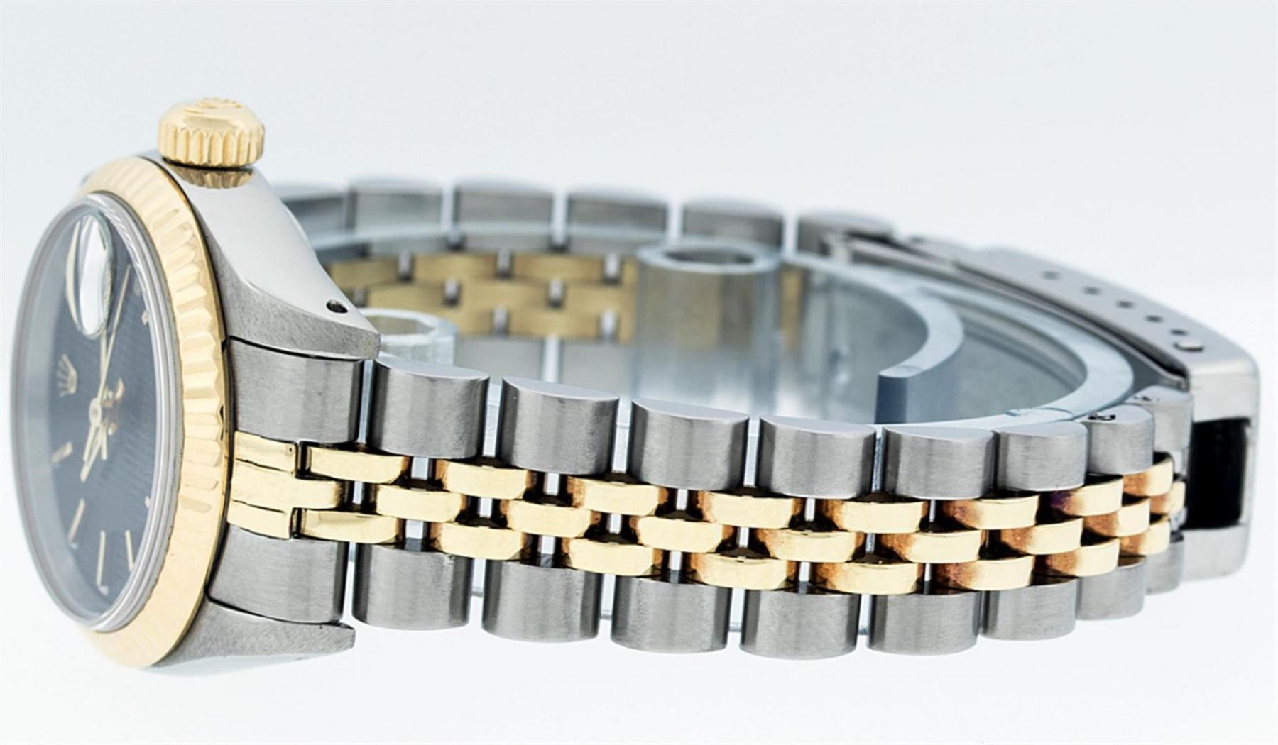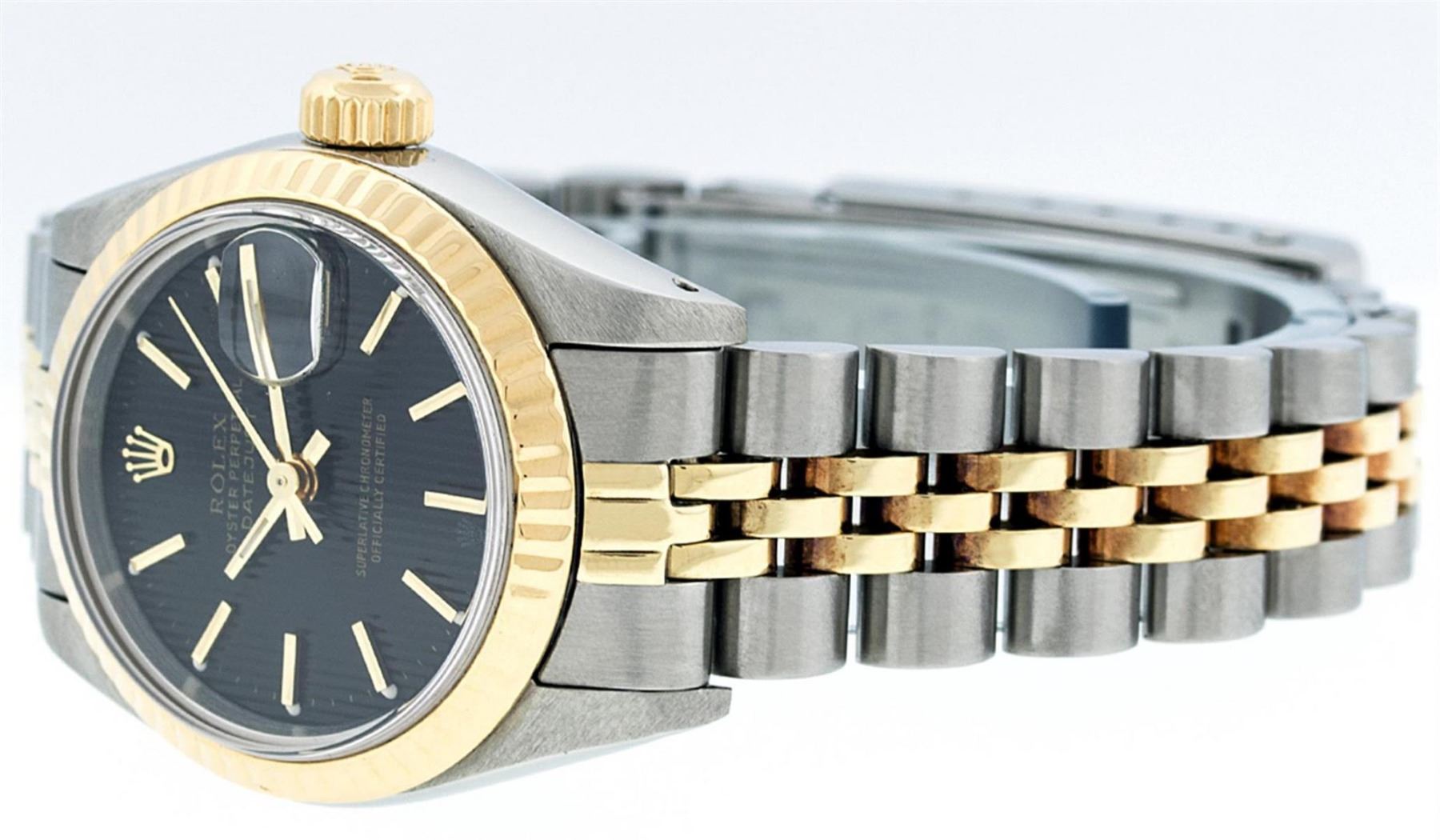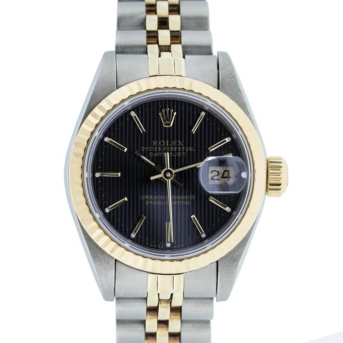 One Ladies Two Tone Rolex Datejust Polished, Serviced & Electronically Tested, Yellow Gold & Stainless Steel Case: 26mm, Yellow Gold Crown, Bezel: Yellow Gold Fluted Bezel. Custom Crystal: New Acrylic Cyclops Lens. Hands: Luminescent Hands. Movement: Automatic Winding Movement. Dial: Black Tapestry With Index Hour Markers. Date Window: 3 O'Clock Position Date Display, Model: Datejust. Condition: G-6 Extra Fine. Bracelet: Two Tone Yellow Gold & Stainless Steel Jubilee Band. Bright Polish. 6.0 Inch Length, Adjustable. Standard Clasp, With Rolex Logo. This Watch Has Been Serviced Time Tested And Is In Excellent Condition It Is Free Of All Scratches And Dents.
