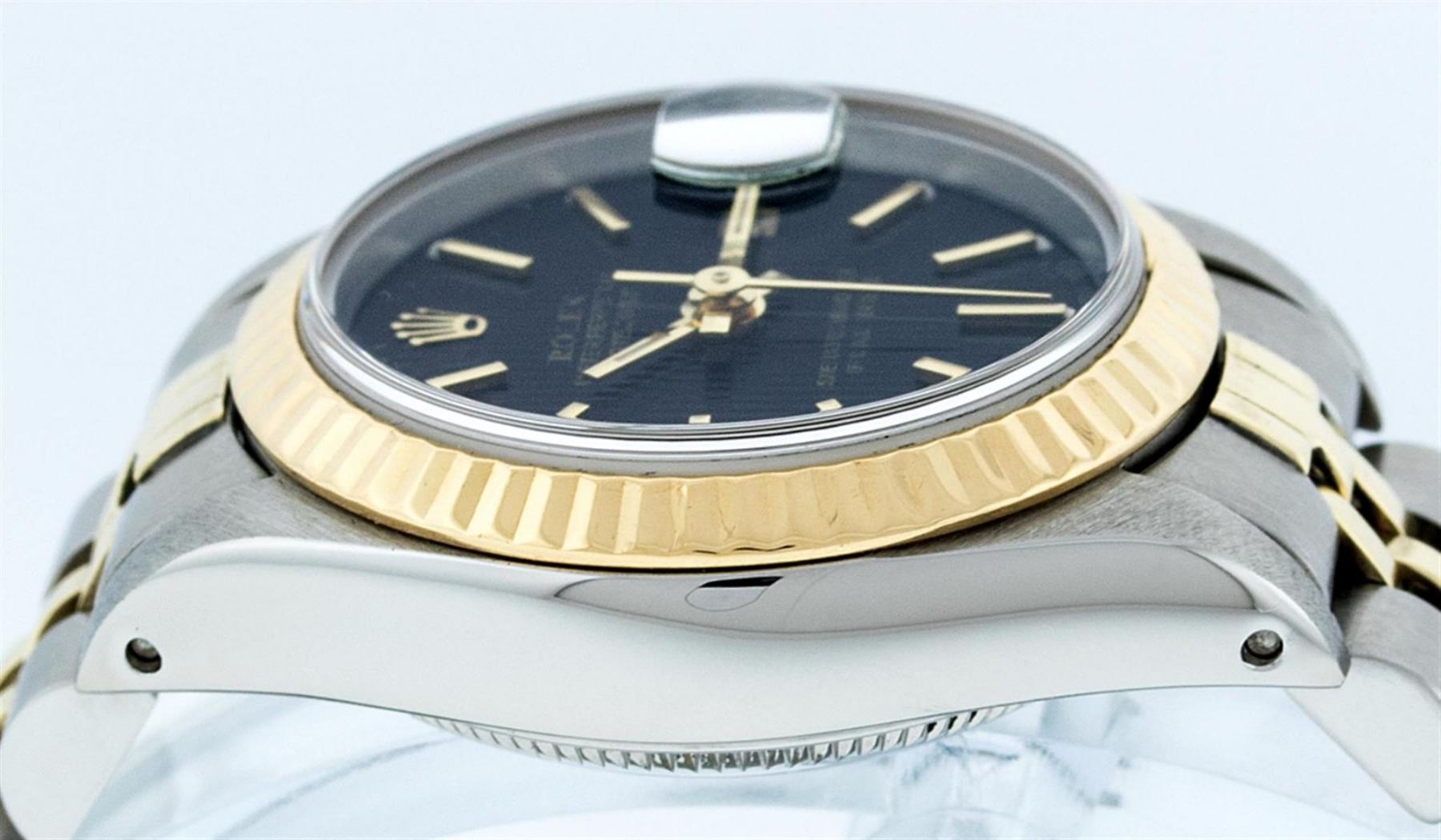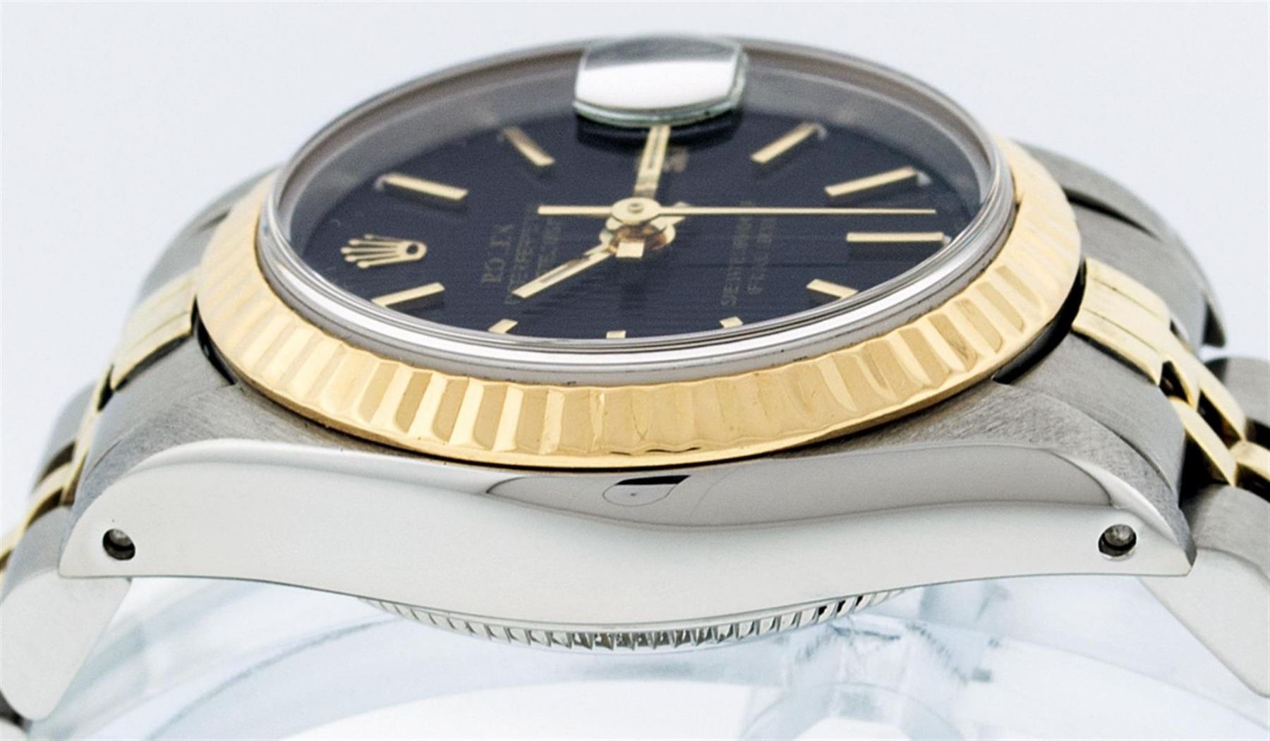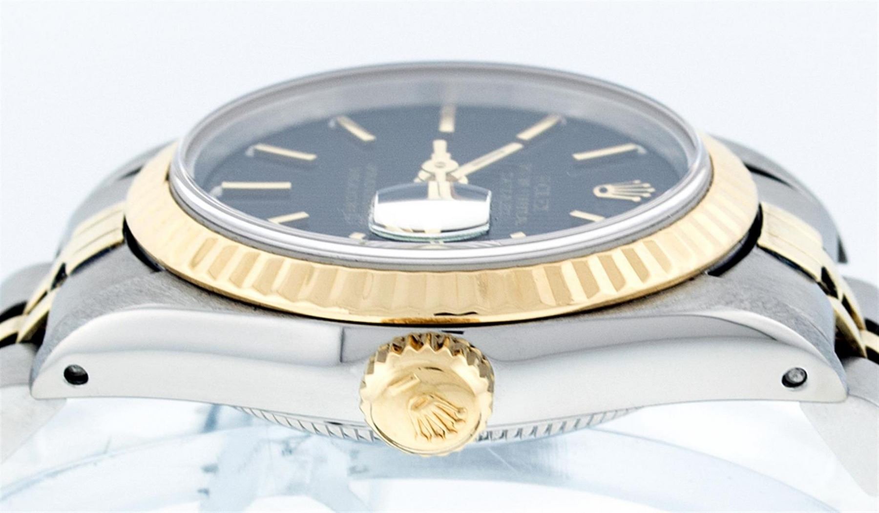 One Ladies Two Tone Rolex Datejust Polished, Serviced & Electronically Tested, Yellow Gold & Stainless Steel Case: 26mm, Yellow Gold Crown, Bezel: Yellow Gold Fluted Bezel. Custom Crystal: New Acrylic Cyclops Lens. Hands: Luminescent Hands. Movement: Automatic Winding Movement. Dial: Black Tapestry With Index Hour Markers. Date Window: 3 O'Clock Position Date Display, Model: Datejust. Condition: G-6 Extra Fine. Bracelet: Two Tone Yellow Gold & Stainless Steel Jubilee Band. Bright Polish. 6.0 Inch Length, Adjustable. Standard Clasp, With Rolex Logo. This Watch Has Been Serviced Time Tested And Is In Excellent Condition It Is Free Of All Scratches And Dents.