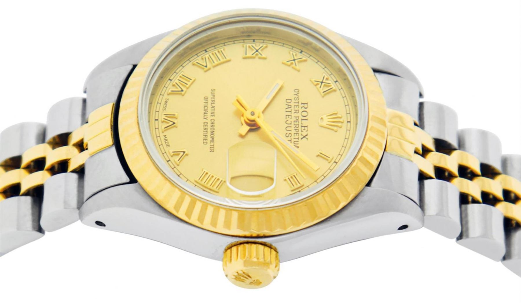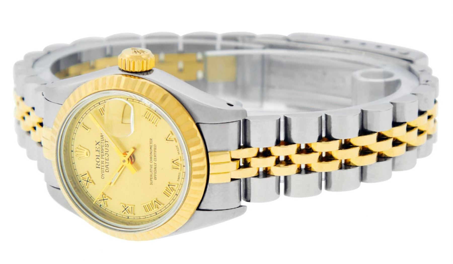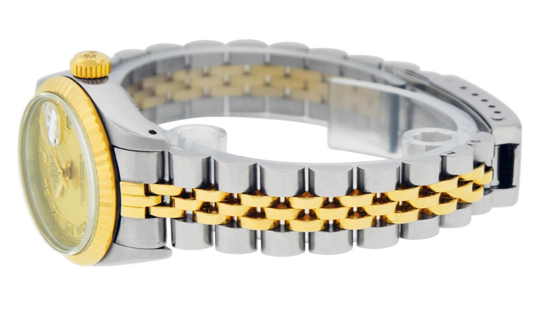 One Ladies Two Tone Rolex Datejust Polished, Serviced & Electronically Tested, Yellow Gold & Stainless Steel Case: 26mm, Yellow Gold Crown, Bezel: Yellow Gold Fluted Bezel. Custom Crystal: New Acrylic Cyclops Lens. Custom Hands: New Luminescent Hands. Movement: Automatic Winding Movement. Dial: Champagne Roman With Square Track. Date Window: 3 O'Clock Position Date Display, Model: Datejust. Condition: G-6 Extra Fine. Bracelet: Two Tone Yellow Gold & Stainless Steel Jubilee Band. Bright Polish. 6.0 Inch Length, Adjustable. Standard Clasp, With Rolex Logo. This Watch Has Been Serviced Time Tested And Is In Excellent Condition It Is Free Of All Scratches And Dents.