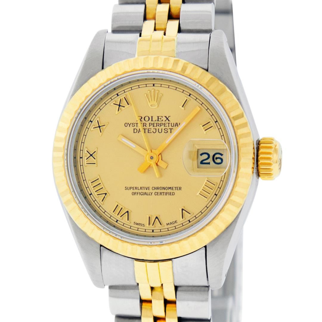 One Ladies Pre Owned Two Tone Rolex Datejust Polished, Serviced & Electronically Tested, Rolex Yellow Gold & Stainless Steel Case: 26mm, Rolex Yellow Gold Crown, Rolex Bezel: Yellow Gold Fluted Bezel. Custom Crystal: New Acrylic Cyclops Lens. Hands: Luminescent Hands. Rolex Movement: Automatic Winding Movement. Rolex Dial: Champagne Roman With Square Track. Date Window: 3 O'Clock Position Date Display, Model: Datejust. Condition: G-6 Extra Fine. Rolex Bracelet: Two Tone Yellow Gold & Stainless Steel Jubilee Band. Bright Polish. 6.0 Inch Length, Adjustable. Standard Clasp, With Rolex Logo. This Watch Has Been Serviced Time Tested And Is In Excellent Condition It Is Free Of All Scratches And Dents.