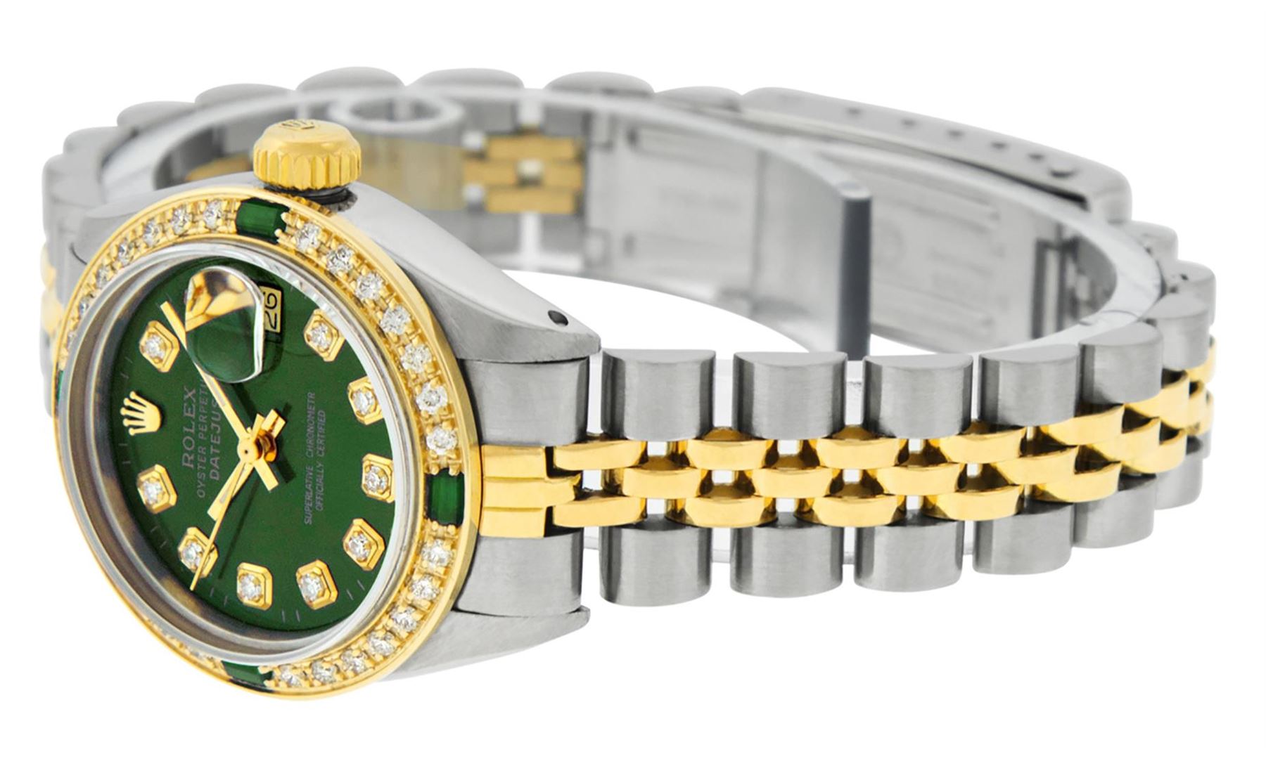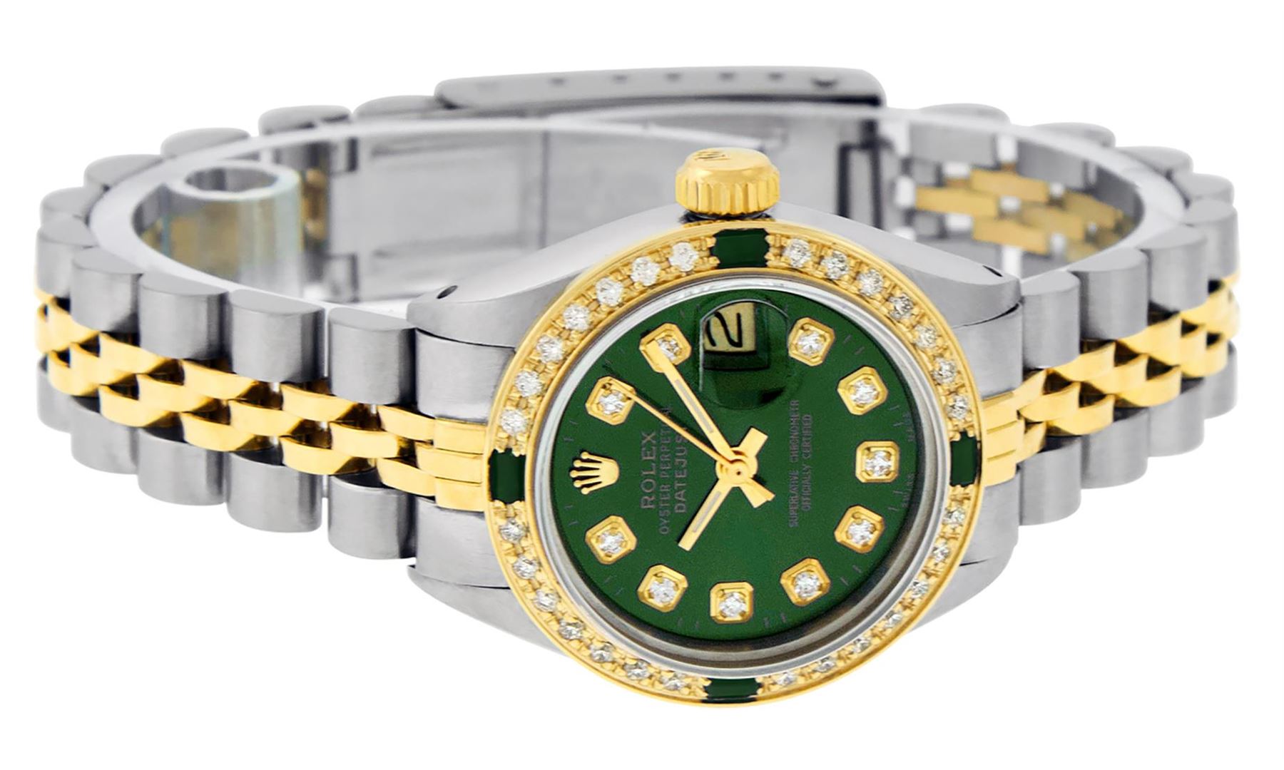 One Ladies 14K Two Tone Rolex Datejust Polished, Serviced & Electronically Tested, 14K Yellow Gold & Stainless Steel Case: 26mm, 14K Yellow Gold Crown, Custom Bezel: New 18K Yellow Gold Emerald Beadset Diamond Bezel, Diamond + Gem Count: 28 Diamonds + 4 Emeralds Total Weight .70 Carat, Clarity: SI-VS, Color: G to H. Custom Crystal: New Scratch Resistant Synthetic Sapphire Cyclops Lens. Custom Hands: New Luminescent Hands. Movement: Automatic Winding Movement Caliber 2030. Custom Dial: Green Dial Set With Diamond Hour Markers & Dash Track, Diamond Count: 10 Diamonds in Dial, G To H In Color, SI-VS Clarity. Date Window: 3 O'Clock Position Date Display, Model: Datejust, Condition: G-6 Extra Fine. Bracelet: Two Tone 14K Yellow Gold & Stainless Steel Jubilee. Bright Polish. 6.0 Inch Length, Adjustable. Standard Clasp, With Rolex Logo. This Watch Has Been Serviced Time Tested And Is In Excellent Condition It Is Free Of All Scratches And Dents.