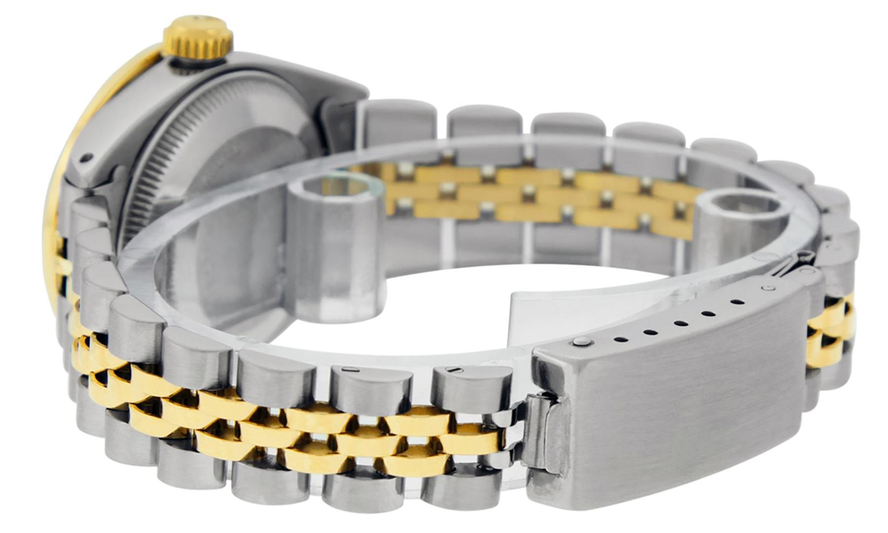 One Ladies Two Tone Rolex Datejust Polished, Serviced & Electronically Tested, Yellow Gold & Stainless Steel Case: 26mm, Yellow Gold Crown, Custom Bezel: New 18K Yellow Gold Emerald Beadset Diamond Bezel, Diamond + Gem Count: 28 Diamonds + 4 Emeralds Total Weight .70 Carat, Clarity: SI-VS, Color: G to H. Custom Crystal: New Scratch Resistant Synthetic Sapphire Cyclops Lens. Custom Hands: New Luminescent Hands. Movement: Automatic Winding Movement. Custom Dial: Green Dial Set With Diamond Hour Markers & Dash Track, Diamond Count: 10 Diamonds in Dial, G To H In Color, SI-VS Clarity. Date Window: 3 O'Clock Position Date Display, Model: Datejust, Condition: G-6 Extra Fine. Bracelet: Two Tone Yellow Gold & Stainless Steel Jubilee. Bright Polish. 6.0 Inch Length, Adjustable. Standard Clasp, With Rolex Logo. This Watch Has Been Serviced Time Tested And Is In Excellent Condition It Is Free Of All Scratches And Dents.