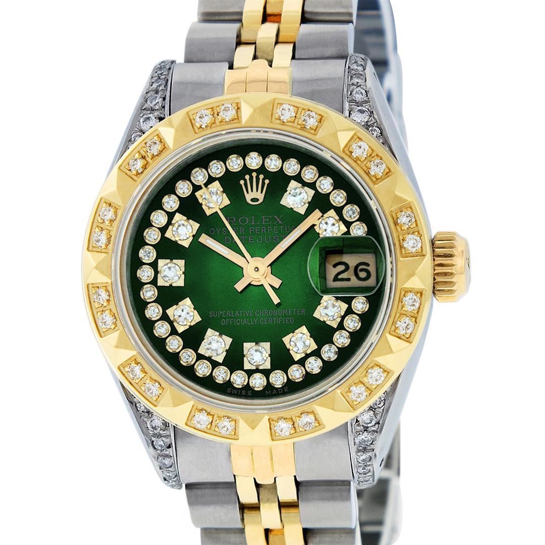 One Ladies Two Tone Rolex Datejust Polished, Serviced & Electronically Tested, Yellow Gold & Stainless Steel Case: 26mm, Yellow Gold Crown, Custom Bezel: New 18K Yellow Gold Emerald Beadset Diamond Bezel, Diamond + Gem Count: 28 Diamonds + 4 Emeralds, Total Weight .70 Carat, Clarity: SI-VS, Color: G to H. Custom Crystal: New Synthetic Sapphire Cyclops Lens. Custom Hands: New Luminescent Hands. Movement: Automatic Winding Movement. Custom Dial: Green Mother Of Pearl String Diamond Dial, Diamond Count: 43 Diamond in Dial, G To H In Color, VS Clarity. Date Window: 3 O'Clock Position Date Display, Model: Datejust, Condition: G-6 Extra Fine. Bracelet: Two Tone Yellow Gold & Stainless Steel Jubilee. Bright Polish. 6.0 Inch Length, Adjustable. Standard Clasp, With Rolex Logo. This Watch Has Been Serviced Time Tested And Is In Excellent Condition It Is Free Of All Scratches And Dents.