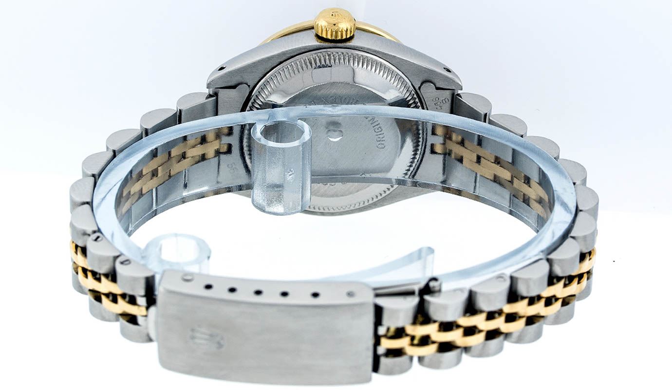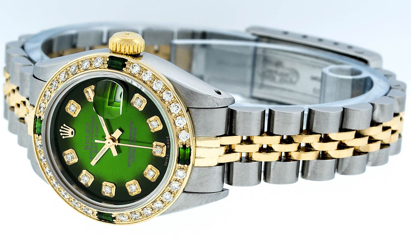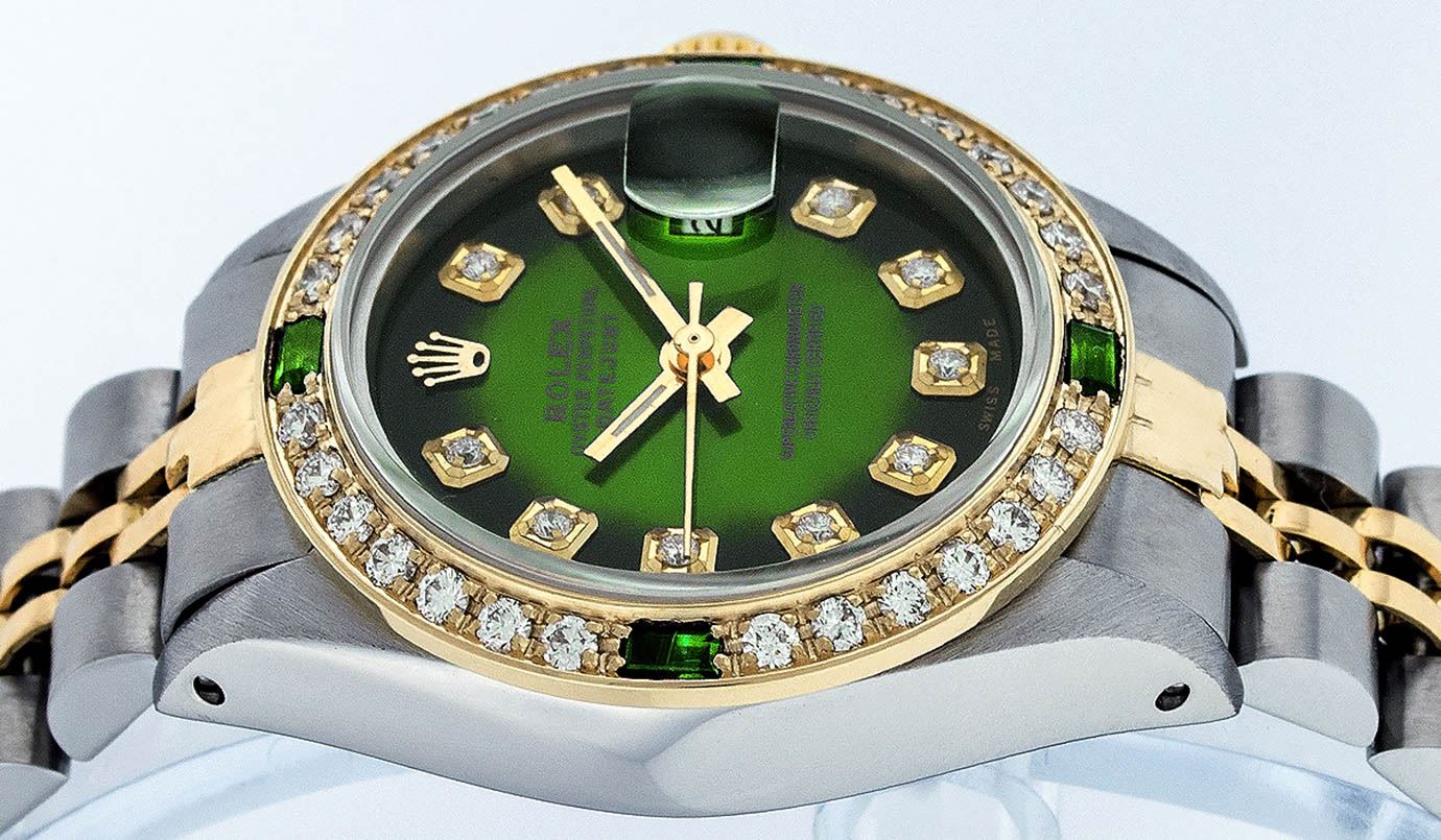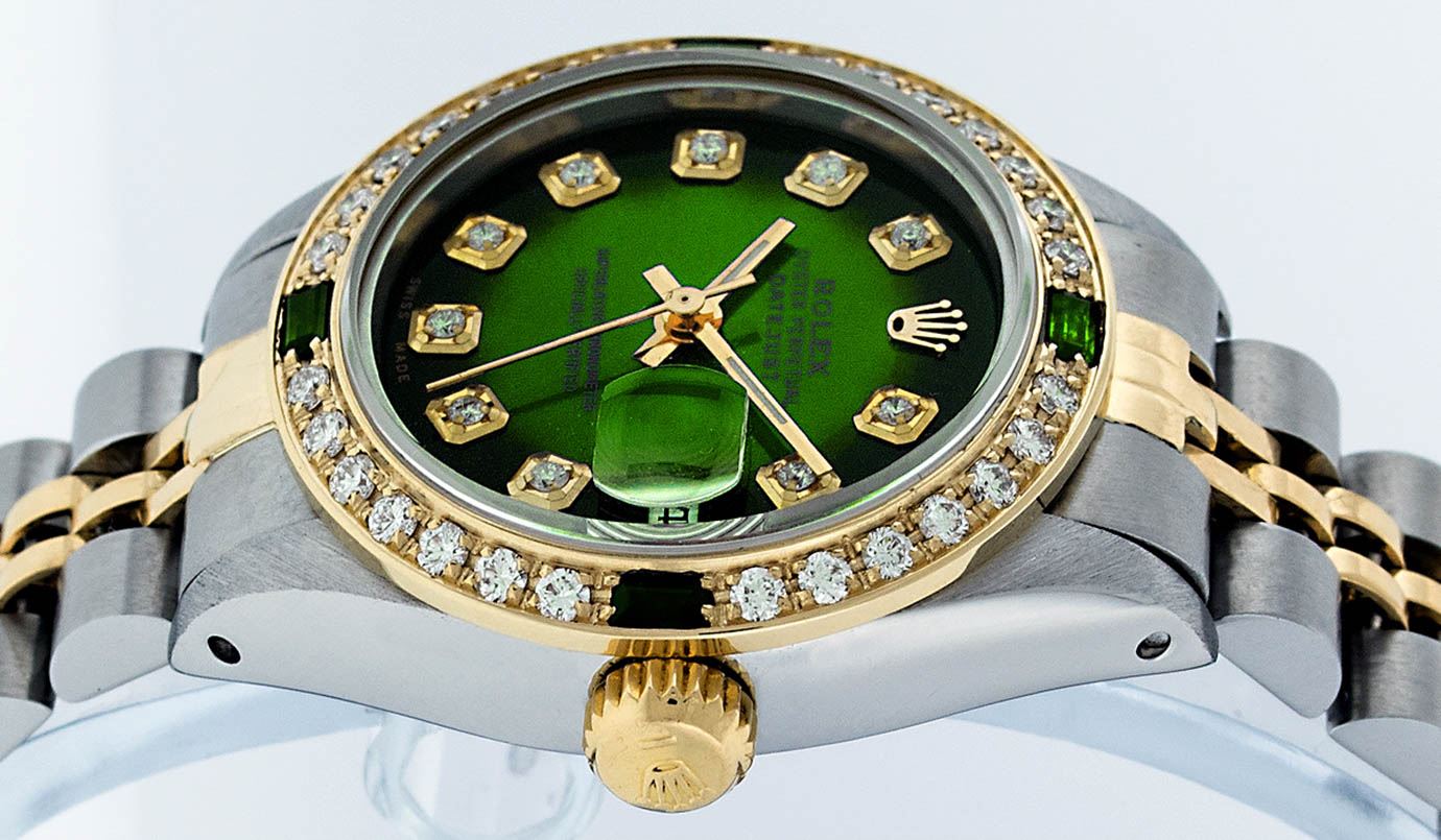One Ladies 14K Two Tone Rolex Datejust Polished, Serviced & Electronically Tested, 14K Yellow Gold & Stainless Steel Case: 26mm, 14K Yellow Gold Crown, Custom Bezel: New 18K Yellow Gold Synthetic Emerald Beadset Diamond Bezel, Diamond + Gem Count: 28 Diamonds + 4 Synthetic Emeralds, Total Weight .70 Carat, Clarity: SI-VS, Color: G to H. Custom Crystal: New Synthetic Sapphire Cyclops Lens. Custom Hands: New Luminescent Hands. Movement: Automatic Winding Movement Caliber 2030. Custom Dial: Green Vignette Dial Set With Diamond Hour Markers, Diamond Count: 10 Diamond in Dial, G To H In Color, SI-VS Clarity. Date Window: 3 O'Clock Position Date Display, Model: Datejust, Condition: G-6 Extra Fine. Bracelet: Two Tone 14K Yellow Gold & Stainless Steel Jubilee. Bright Polish. 6.0 Inch Length, Adjustable. Standard Clasp, With Rolex Logo. This Watch Has Been Serviced Time Tested And Is In Excellent Condition It Is Free Of All Scratches And Dents.