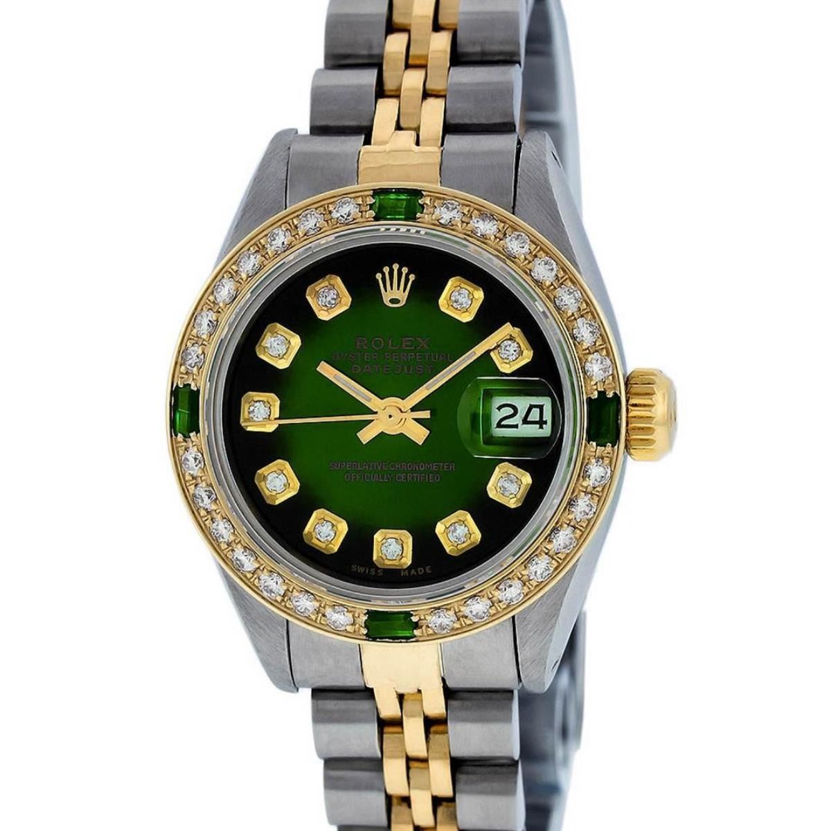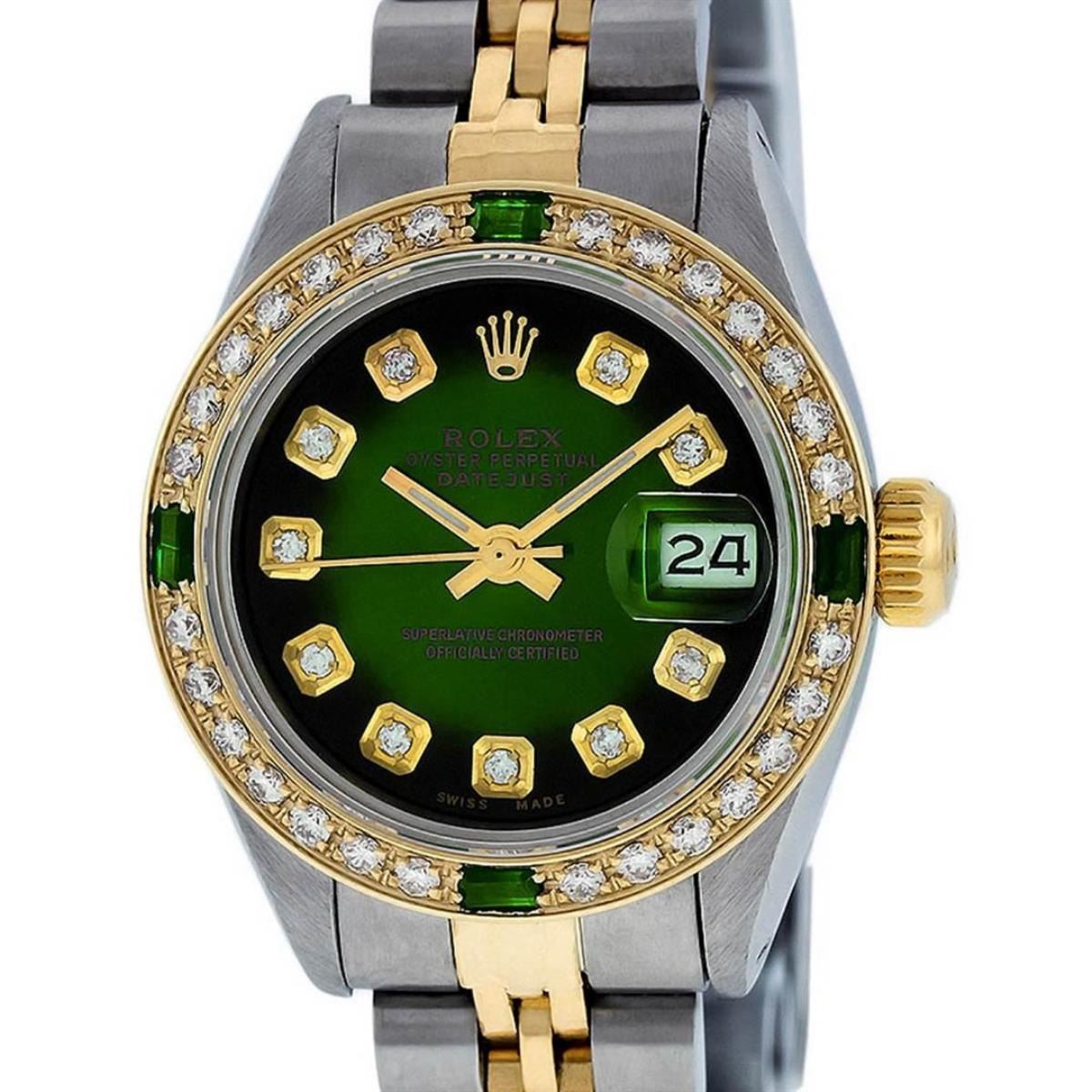 One Ladies 14K Two Tone Rolex Datejust Polished, Serviced & Electronically Tested, 14K Yellow Gold & Stainless Steel Case: 26mm, 14K Yellow Gold Crown, Custom Bezel: New 18K Yellow Gold Synthetic Emerald Beadset Diamond Bezel, Diamond + Gem Count: 28 Diamonds + 4 Synthetic Emeralds, Total Weight .70 Carat, Clarity: SI-VS, Color: G to H. Custom Crystal: New Synthetic Sapphire Cyclops Lens. Custom Hands: New Luminescent Hands. Movement: Automatic Winding Movement Caliber 2030. Custom Dial: Green Vignette Dial Set With Diamond Hour Markers, Diamond Count: 10 Diamond in Dial, G To H In Color, SI-VS Clarity. Date Window: 3 O'Clock Position Date Display, Model: Datejust, Condition: G-6 Extra Fine. Bracelet: Two Tone 14K Yellow Gold & Stainless Steel Jubilee. Bright Polish. 6.0 Inch Length, Adjustable. Standard Clasp, With Rolex Logo. This Watch Has Been Serviced Time Tested And Is In Excellent Condition It Is Free Of All Scratches And Dents.