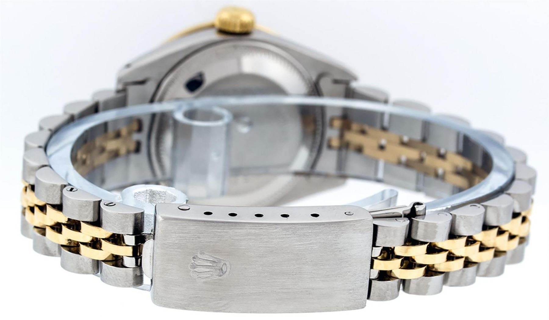 One Ladies Two Tone Rolex Datejust Polished, Serviced & Electronically Tested, Yellow Gold & Stainless Steel Case: 26mm, Yellow Gold Crown, Custom Bezel: New 18K Yellow Gold Synthetic Emerald Beadset Diamond Bezel, Diamond + Gem Count: 28 Diamonds + 4 Emeralds, Total Weight .70 Carat, Clarity: SI-VS, Color: G to H. Custom Crystal: New Synthetic Sapphire Cyclops Lens. Custom Hands: New Luminescent Hands. Movement: Automatic Winding Movement. Custom Dial: Green Vignette Dial Set With Diamond Hour Markers, Diamond Count: 10 Diamond in Dial, G To H In Color, SI-VS Clarity. Date Window: 3 O'Clock Position Date Display, Model: Datejust, Condition: G-6 Extra Fine. Bracelet: Two Tone Yellow Gold & Stainless Steel Jubilee. Bright Polish. 6.0 Inch Length, Adjustable. Standard Clasp, With Rolex Logo. This Watch Has Been Serviced Time Tested And Is In Excellent Condition It Is Free Of All Scratches And Dents.