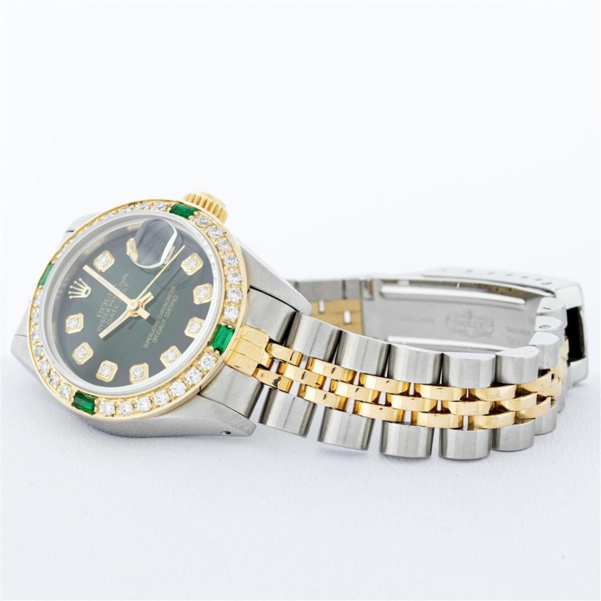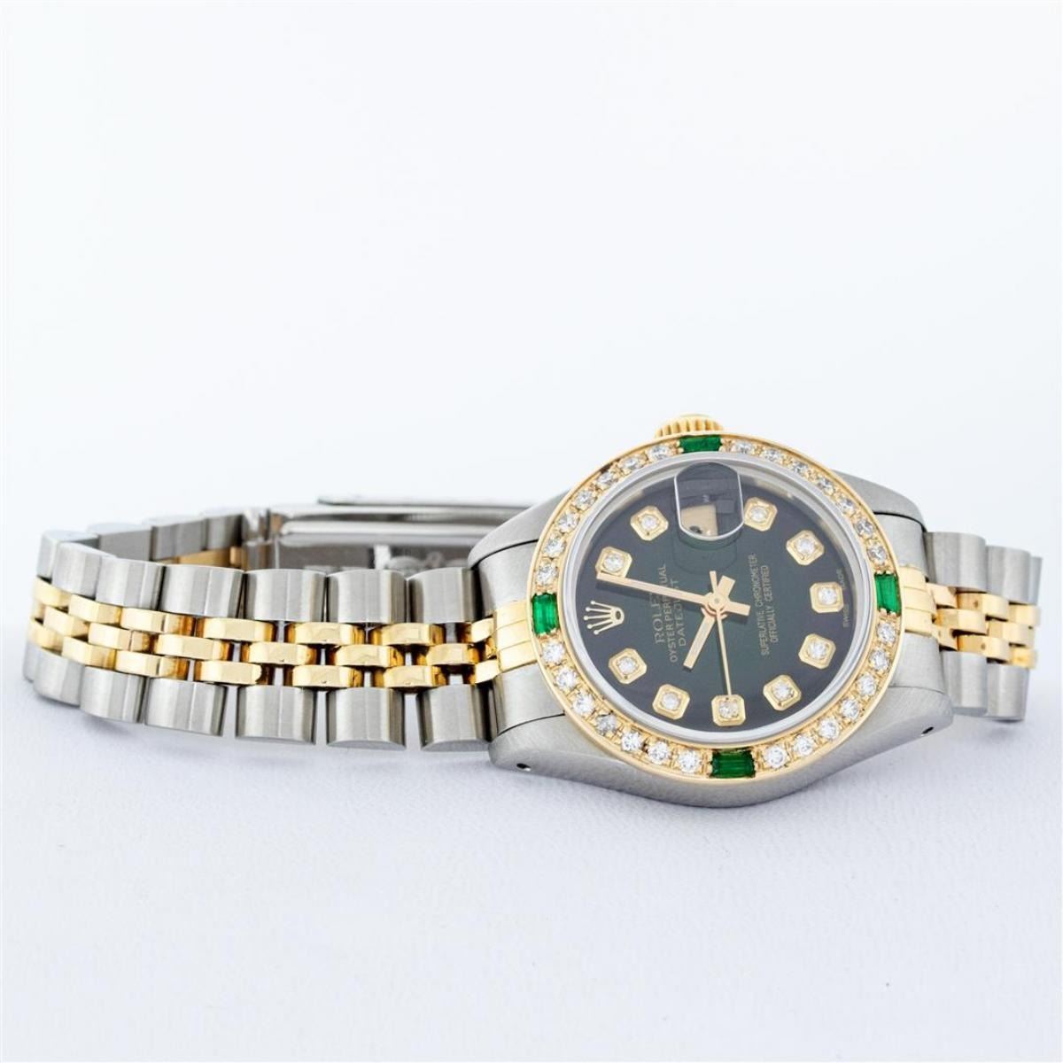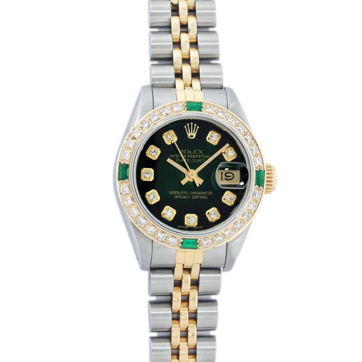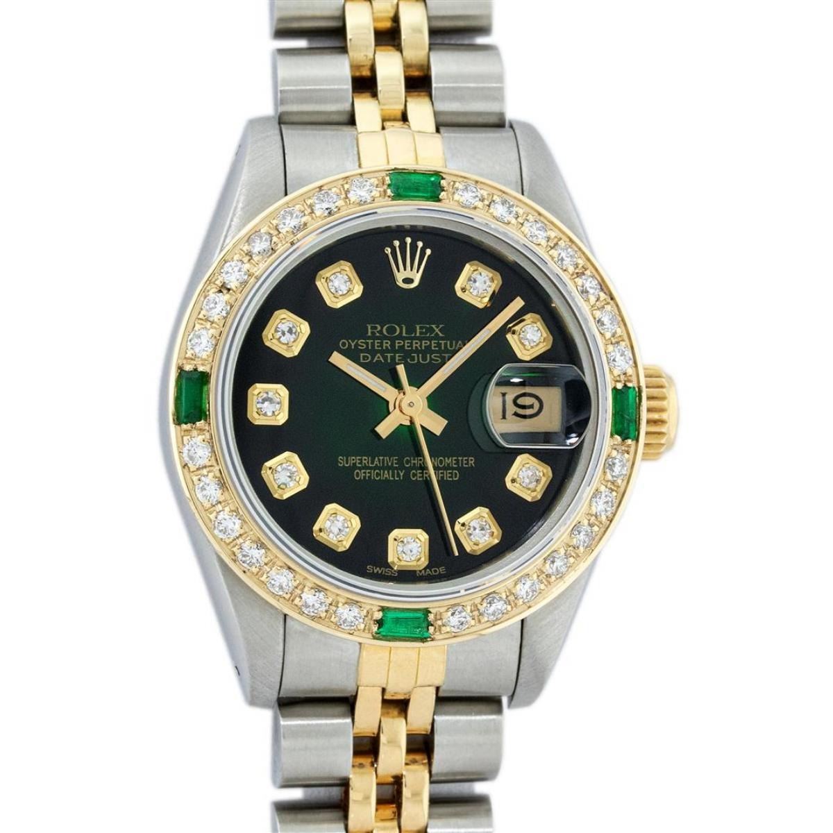 One Ladies Two Tone Rolex Datejust Polished, Serviced & Electronically Tested, Yellow Gold & Stainless Steel Case: 26mm, Yellow Gold Crown, Custom Bezel: New 18K Yellow Gold Synthetic Emerald Beadset Diamond Bezel, Diamond + Gem Count: 28 Diamonds + 4 Synthetic Emeralds, Total Weight .70 Carat, Clarity: SI-VS, Color: G to H. Custom Crystal: New Synthetic Sapphire Cyclops Lens. Custom Hands: New Luminescent Hands. Movement: Automatic Winding Movement. Custom Dial: Green Vignette Dial Set With Diamond Hour Markers, Diamond Count: 10 Diamond in Dial, G To H In Color, SI-VS Clarity. Date Window: 3 O'Clock Position Date Display, Model: Datejust, Condition: G-6 Extra Fine. Bracelet: Two Tone Yellow Gold & Stainless Steel Jubilee. Bright Polish. 6.0 Inch Length, Adjustable. Standard Clasp, With Rolex Logo. This Watch Has Been Serviced Time Tested And Is In Excellent Condition It Is Free Of All Scratches And Dents.