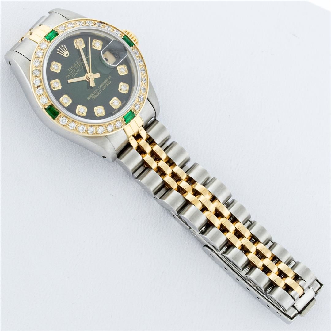 One Ladies Two Tone Rolex Datejust Polished, Serviced & Electronically Tested, Yellow Gold & Stainless Steel Case: 26mm, Yellow Gold Crown, Custom Bezel: New 18K Yellow Gold Synthetic Emerald Beadset Diamond Bezel, Diamond + Gem Count: 28 Diamonds + 4 Synthetic Emeralds, Total Weight .70 Carat, Clarity: SI-VS, Color: G to H. Custom Crystal: New Synthetic Sapphire Cyclops Lens. Custom Hands: New Luminescent Hands. Movement: Automatic Winding Movement. Custom Dial: Green Vignette Dial Set With Diamond Hour Markers, Diamond Count: 10 Diamond in Dial, G To H In Color, SI-VS Clarity. Date Window: 3 O'Clock Position Date Display, Model: Datejust, Condition: G-6 Extra Fine. Bracelet: Two Tone Yellow Gold & Stainless Steel Jubilee. Bright Polish. 6.0 Inch Length, Adjustable. Standard Clasp, With Rolex Logo. This Watch Has Been Serviced Time Tested And Is In Excellent Condition It Is Free Of All Scratches And Dents.