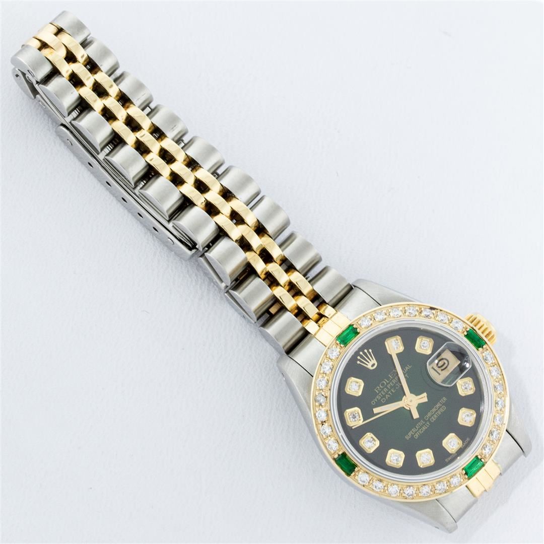 One Ladies Two Tone Rolex Datejust Polished, Serviced & Electronically Tested, Yellow Gold & Stainless Steel Case: 26mm, Yellow Gold Crown, Custom Bezel: New 18K Yellow Gold Synthetic Emerald Beadset Diamond Bezel, Diamond + Gem Count: 28 Diamonds + 4 Synthetic Emeralds, Total Weight .70 Carat, Clarity: SI-VS, Color: G to H. Custom Crystal: New Synthetic Sapphire Cyclops Lens. Custom Hands: New Luminescent Hands. Movement: Automatic Winding Movement. Custom Dial: Green Vignette Dial Set With Diamond Hour Markers, Diamond Count: 10 Diamond in Dial, G To H In Color, SI-VS Clarity. Date Window: 3 O'Clock Position Date Display, Model: Datejust, Condition: G-6 Extra Fine. Bracelet: Two Tone Yellow Gold & Stainless Steel Jubilee. Bright Polish. 6.0 Inch Length, Adjustable. Standard Clasp, With Rolex Logo. This Watch Has Been Serviced Time Tested And Is In Excellent Condition It Is Free Of All Scratches And Dents.