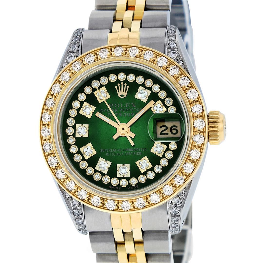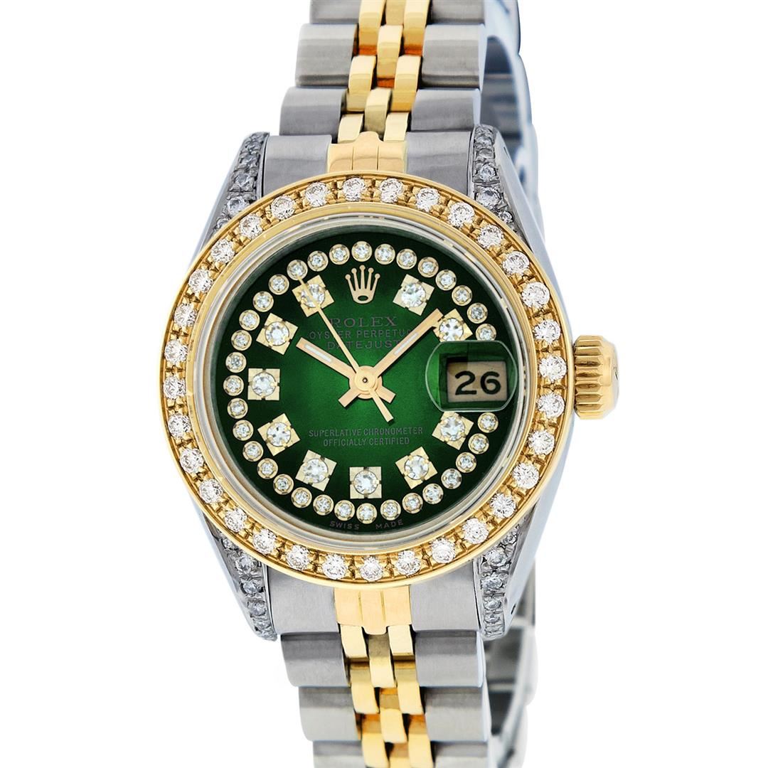One Ladies Pre Owned Two Tone Rolex Datejust Polished, Serviced & Electronically Tested, Yellow Gold & Stainless Steel Case: 26mm, Yellow Gold Crown, Custom Diamond Lugs: 24 Diamonds On Lugs, Clarity: SI-VS, Color: G to H. Custom Bezel: New 18K Yellow Gol