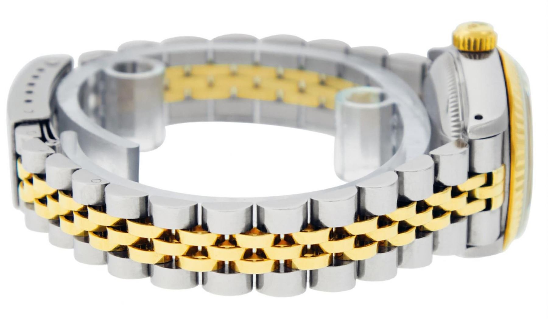 One Ladies Two Tone Rolex Datejust Polished, Serviced & Electronically Tested, Yellow Gold & Stainless Steel Case: 26mm, Yellow Gold Crown, Bezel: Yellow Gold Fluted Bezel. Custom Crystal: New Acrylic Cyclops Lens. Custom Hands: New Luminescent Hands. Movement: Automatic Winding Movement. Custom Dial: Mother Of Pearl With Diamond Hour Markers, Diamond Count: 10 Diamonds In Dial, Color: G to H, Clarity: VS2-SI1. Date Window: 3 O'Clock Position Date Display, Model: Datejust. Condition: G-6 Extra Fine. Bracelet: Two Tone Yellow Gold & Stainless Steel Jubilee Band. Bright Polish. 6.0 Inch Length, Adjustable. Standard Clasp, With Rolex Logo. This Watch Has Been Serviced Time Tested And Is In Excellent Condition It Is Free Of All Scratches And Dents.