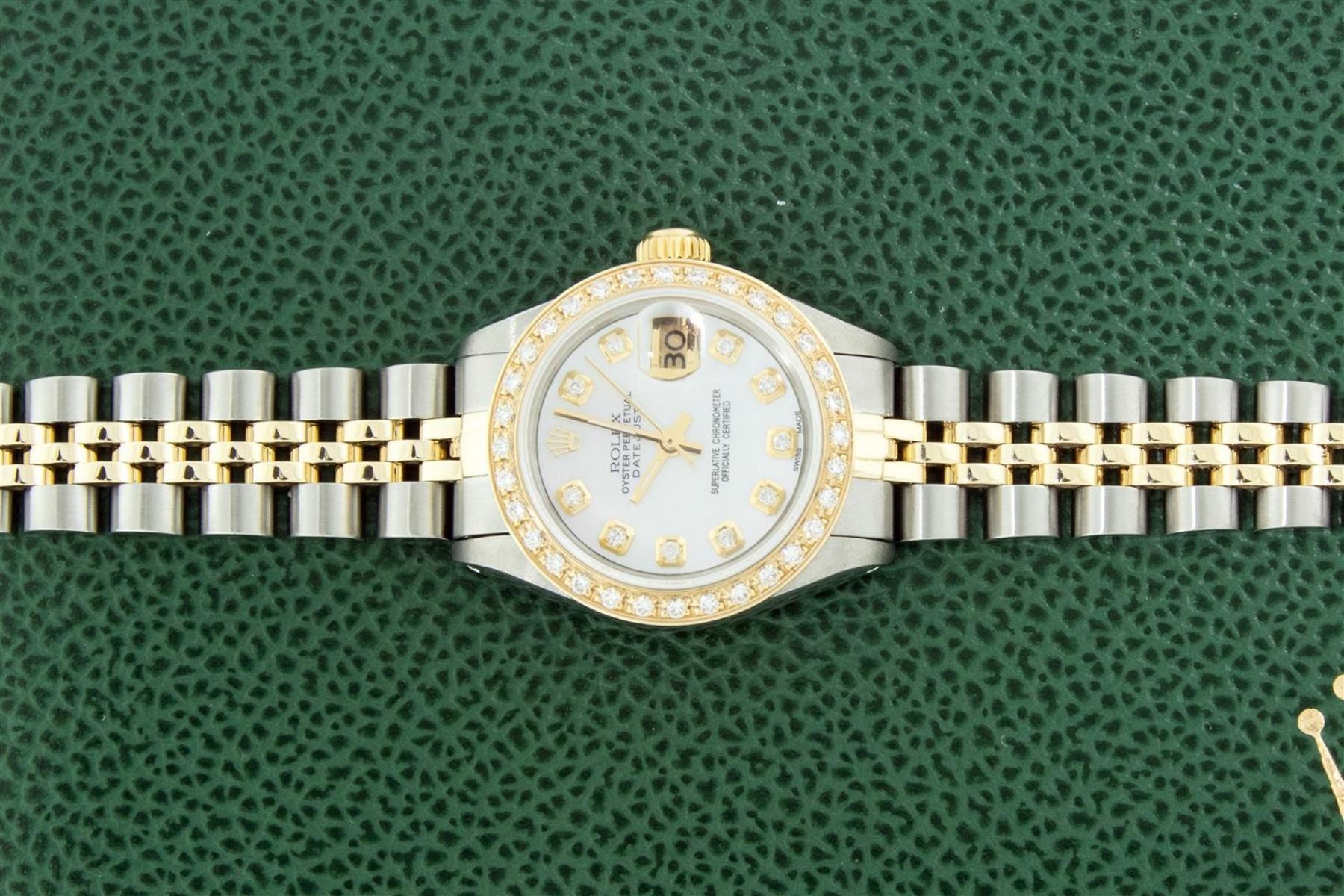 One Ladies Two Tone Rolex Datejust Polished, Serviced & Electronically Tested, Yellow Gold & Stainless Steel Case: 26mm, Yellow Gold Crown, Custom Bezel: 18K Yellow Gold Beadset Diamond Bezel, Diamond Count: 32 Diamonds Total Weight .70 Carat, Clarity: Si-VS, Color: G to H. Custom Crystal: Synthetic Sapphire Cyclops Lens. Custom Hands: New Luminescent Hands. Movement: Automatic Winding Movement Caliber. Custom Dial: Mother Of Pearl Dial Set With Diamond Hour Markers, 10 Diamond in Dial G To H In Color, SI-VS Clarity. Date Window: 3 O'Clock Position Date Display, Model: Datejust. Condition: G-6 Extra Fine. Bracelet: Two Tone Yellow Gold & Stainless Steel Jubilee. Bright Polish. 6.0 Inch Length, Adjustable. Standard Clasp, With Rolex Logo. This Watch Has Been Serviced Time Tested And Is In Excellent Condition It Is Free Of All Scratches And Dents. This Watch Comes With A Rolex Box.