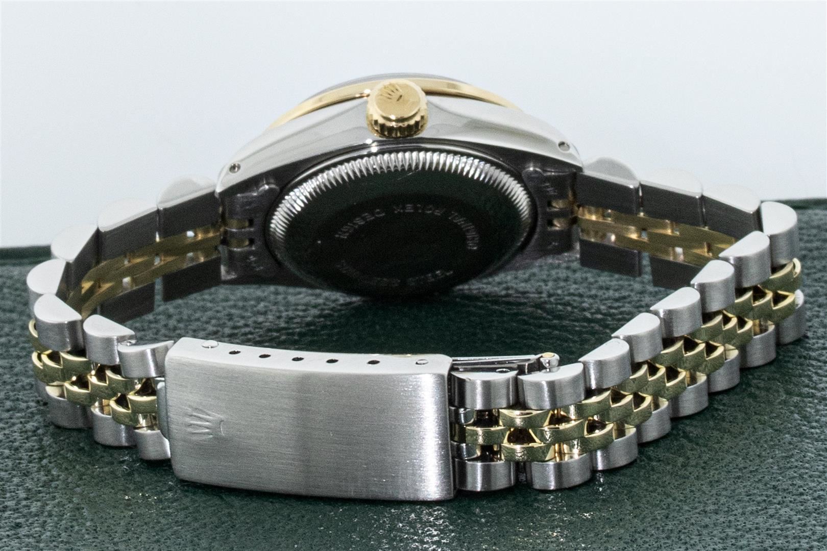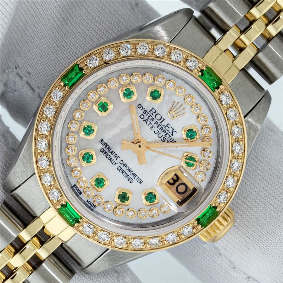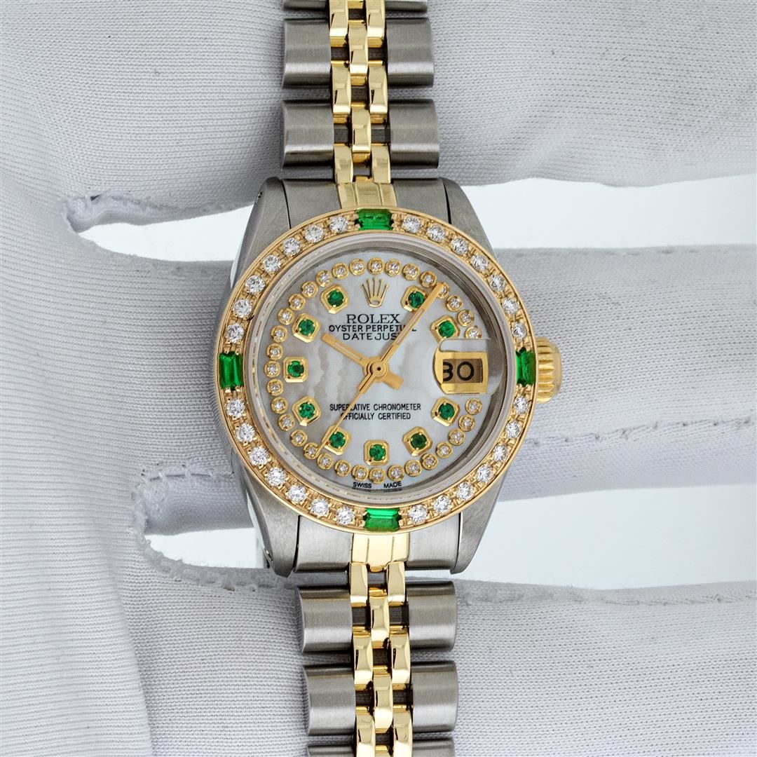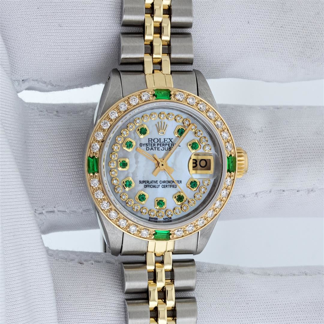 One Ladies Two Tone Rolex Datejust Polished, Serviced & Electronically Tested, Yellow Gold & Stainless Steel Case: 26mm, Yellow Gold Crown, Custom Bezel: New 18K Yellow Gold Synthetic Emerald Beadset Diamond Bezel, Diamond Count: 28 Diamonds + 4 Synthetic Emeralds . Total Weight .70 Carat, Clarity: SI-VS, Color: G to H. Custom Crystal: New Synthetic Sapphire Cyclops Lens. Custom Hands: New Luminescent Hands. Movement: Automatic Winding Movement. Custom Dial: Mother Of Pearl With Green Emerald String Diamond Hour Markers. 10 Emeralds + 33 Diamonds In Dial, Clarity: SI-VS, Color: G to H. Date Window: 3 O'Clock Position Date Display, Model: Datejust. Condition: G-6 Extra Fine. Bracelet: Two Tone Yellow Gold & Stainless Steel Jubilee. Bright Polish. 6.0 Inch Length, Adjustable. Standard Clasp, With Rolex Logo. This Watch Has Been Serviced Time Tested And Is In Excellent Condition It Is Free Of All Scratches And Dents. This Watch Comes With A Rolex Box.