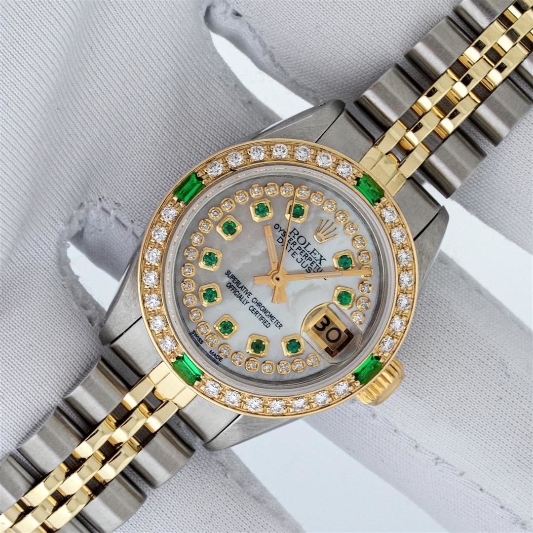 One Ladies Two Tone Rolex Datejust Polished, Serviced & Electronically Tested, Yellow Gold & Stainless Steel Case: 26mm, Yellow Gold Crown, Custom Bezel: New 18K Yellow Gold Synthetic Emerald Beadset Diamond Bezel, Diamond Count: 28 Diamonds + 4 Synthetic Emeralds . Total Weight .70 Carat, Clarity: SI-VS, Color: G to H. Custom Crystal: New Synthetic Sapphire Cyclops Lens. Custom Hands: New Luminescent Hands. Movement: Automatic Winding Movement. Custom Dial: Mother Of Pearl With Green Emerald String Diamond Hour Markers. 10 Emeralds + 33 Diamonds In Dial, Clarity: SI-VS, Color: G to H. Date Window: 3 O'Clock Position Date Display, Model: Datejust. Condition: G-6 Extra Fine. Bracelet: Two Tone Yellow Gold & Stainless Steel Jubilee. Bright Polish. 6.0 Inch Length, Adjustable. Standard Clasp, With Rolex Logo. This Watch Has Been Serviced Time Tested And Is In Excellent Condition It Is Free Of All Scratches And Dents. This Watch Comes With A Rolex Box.