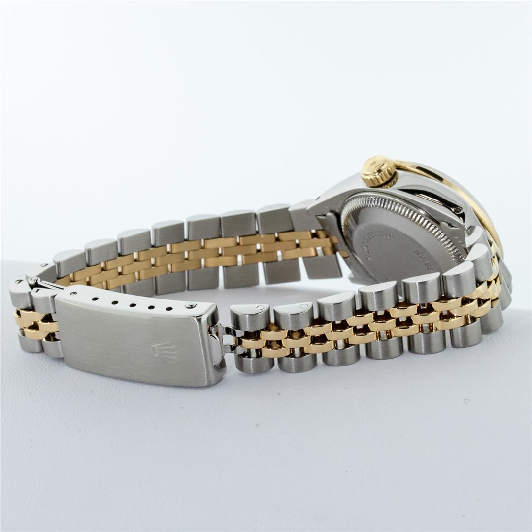One Ladies Two Tone Rolex Datejust Polished, Serviced & Electronically Tested, Yellow Gold & Stainless Steel Case: 26mm, Yellow Gold Crown, Custom Bezel: New 18K Yellow Gold Emerald Beadset Diamond Bezel, Diamond + Gem Count: 28 Diamonds + 4 Emeralds, Total Weight .70 Carat, Clarity: SI-VS, Color: G to H. Custom Crystal: New Scratch Resistant Synthetic Sapphire Cyclops Lens. Custom Hands: New Luminescent Hands. Movement: Automatic Winding Movement. Custom Dial: Mother Of Pearl Set With Diamond Hour Markers & Dash Track, Diamond Count: 10 Diamond in Dial, G To H In Color, SI-VS Clarity. Date Window: 3 O'Clock Position Date Display, Model: Datejust, Condition: G-6 Extra Fine. Bracelet: Two Tone Yellow Gold & Stainless Steel Jubilee Band. Bright Polish. 6.0 Inch Length, Adjustable. Standard Clasp, With Rolex Logo. This Watch Has Been Serviced Time Tested And Is In Excellent Condition It Is Free Of All Scratches And Dents.