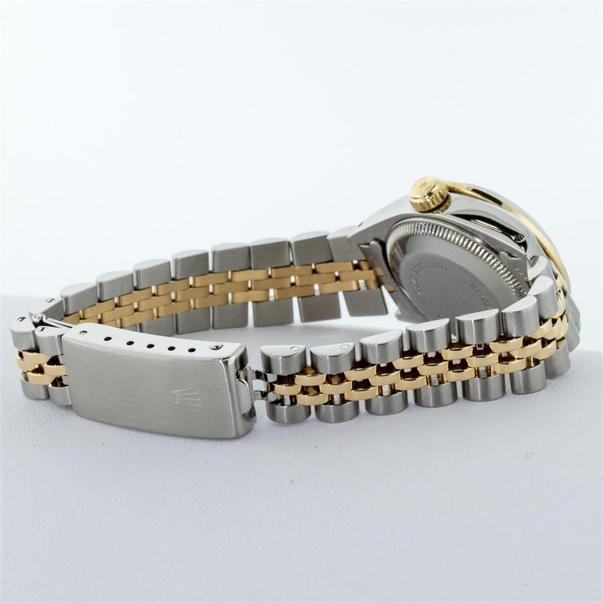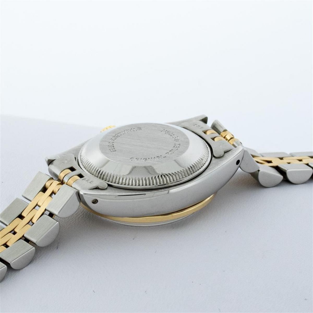 One Ladies Two Tone Rolex Datejust Polished, Serviced & Electronically Tested, Yellow Gold & Stainless Steel Case: 26mm, Yellow Gold Crown, Custom Bezel: New 18K Yellow Gold Emerald Beadset Diamond Bezel, Diamond + Gem Count: 28 Diamonds + 4 Emeralds, Total Weight .70 Carat, Clarity: SI-VS, Color: G to H. Custom Crystal: New Scratch Resistant Synthetic Sapphire Cyclops Lens. Custom Hands: New Luminescent Hands. Movement: Automatic Winding Movement. Custom Dial: Mother Of Pearl Set With Diamond Hour Markers & Dash Track, Diamond Count: 10 Diamond in Dial, G To H In Color, SI-VS Clarity. Date Window: 3 O'Clock Position Date Display, Model: Datejust, Condition: G-6 Extra Fine. Bracelet: Two Tone Yellow Gold & Stainless Steel Jubilee Band. Bright Polish. 6.0 Inch Length, Adjustable. Standard Clasp, With Rolex Logo. This Watch Has Been Serviced Time Tested And Is In Excellent Condition It Is Free Of All Scratches And Dents.
