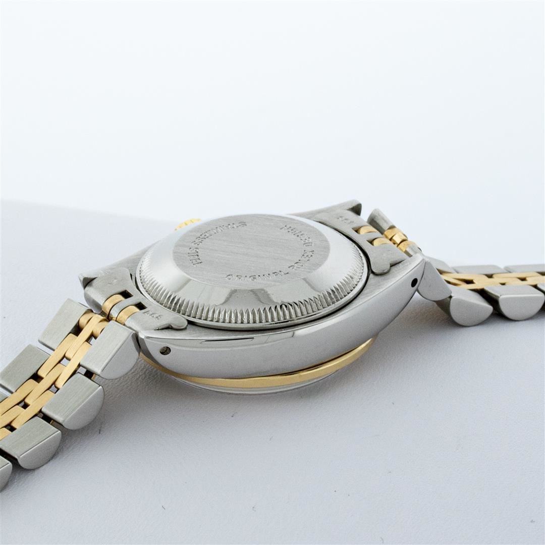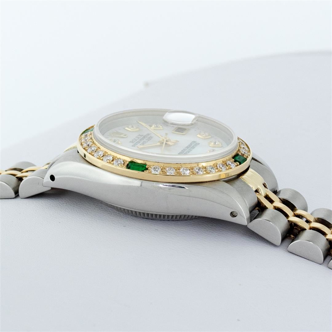 One Ladies Two Tone Rolex Datejust Polished, Serviced & Electronically Tested, Yellow Gold & Stainless Steel Case: 26mm, Yellow Gold Crown, Custom Bezel: New 18K Yellow Gold Emerald Beadset Diamond Bezel, Diamond + Gem Count: 28 Diamonds + 4 Emeralds, Total Weight .70 Carat, Clarity: SI-VS, Color: G to H. Custom Crystal: New Scratch Resistant Synthetic Sapphire Cyclops Lens. Custom Hands: New Luminescent Hands. Movement: Automatic Winding Movement. Custom Dial: Mother Of Pearl Set With Diamond Hour Markers & Dash Track, Diamond Count: 10 Diamond in Dial, G To H In Color, SI-VS Clarity. Date Window: 3 O'Clock Position Date Display, Model: Datejust, Condition: G-6 Extra Fine. Bracelet: Two Tone Yellow Gold & Stainless Steel Jubilee Band. Bright Polish. 6.0 Inch Length, Adjustable. Standard Clasp, With Rolex Logo. This Watch Has Been Serviced Time Tested And Is In Excellent Condition It Is Free Of All Scratches And Dents.