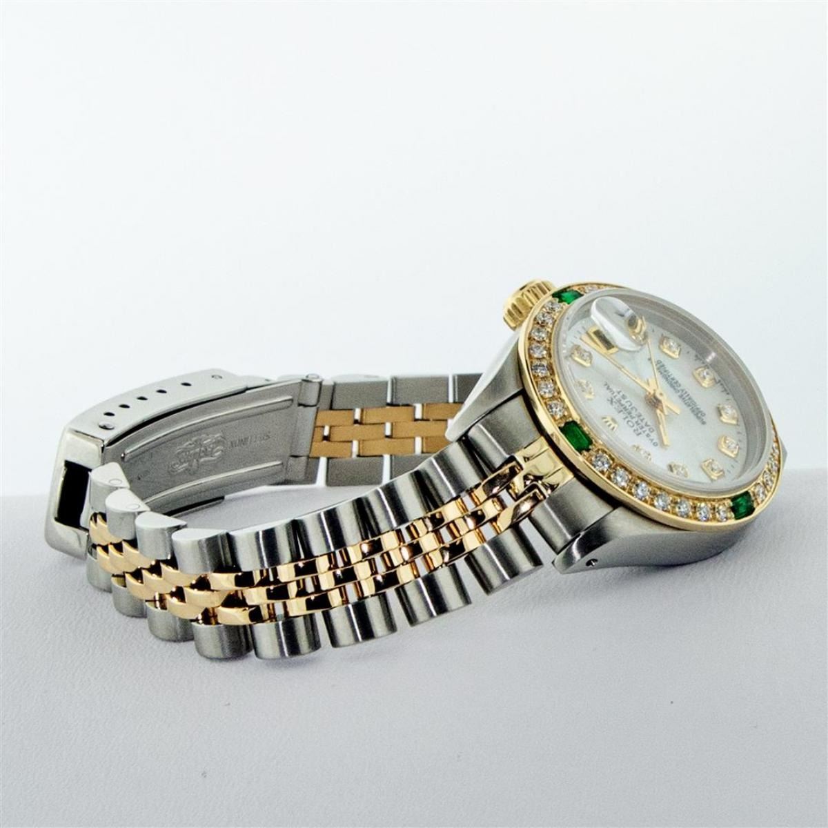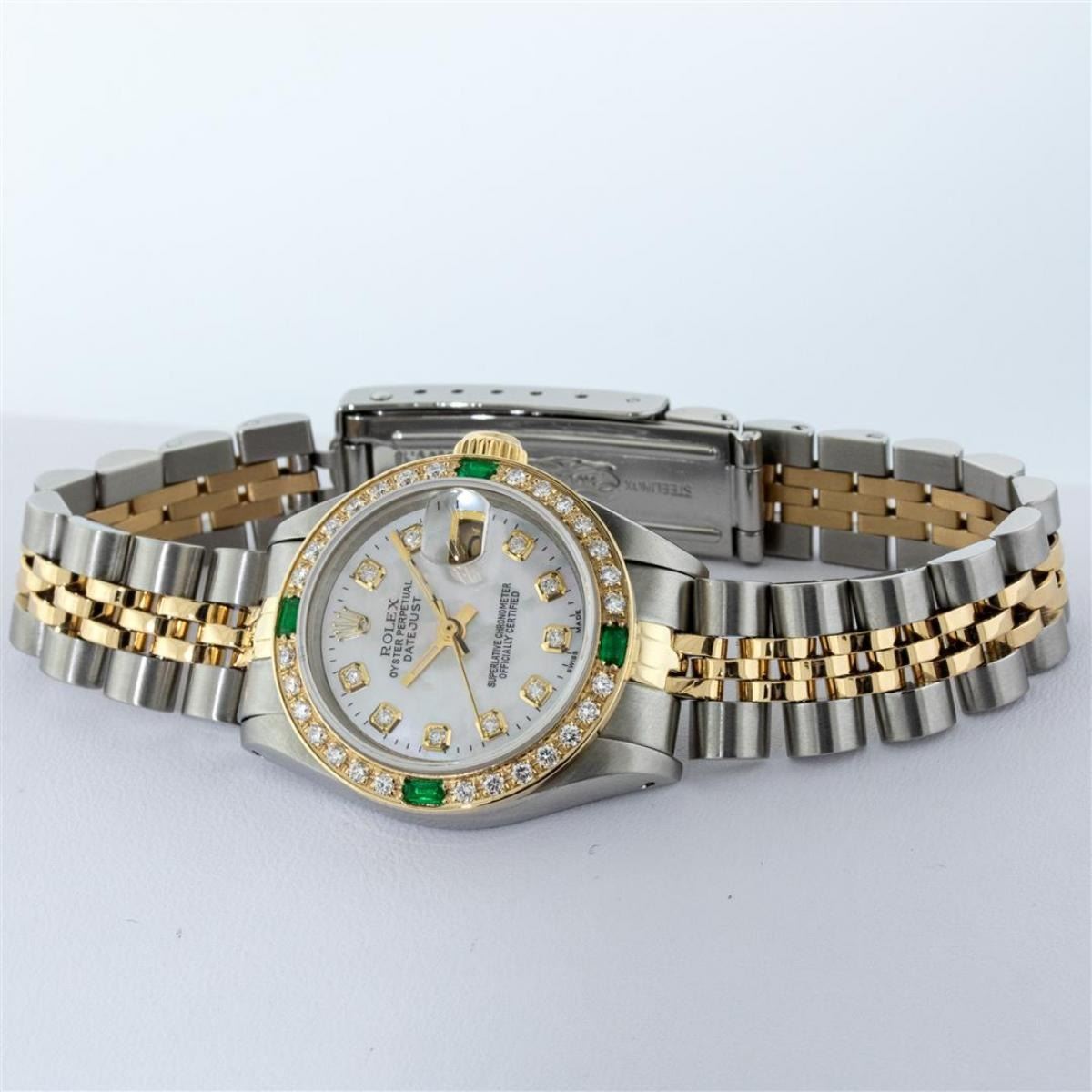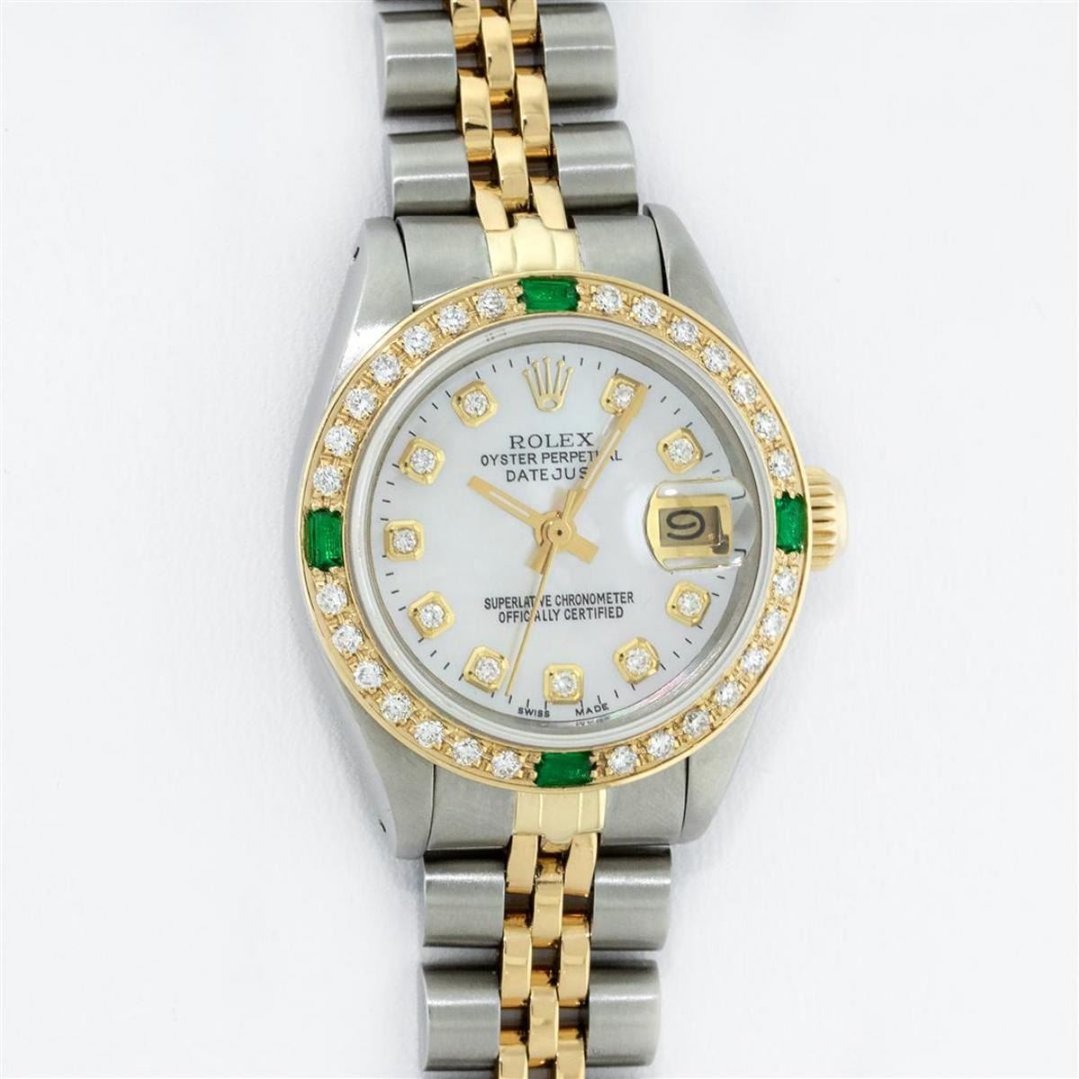 One Ladies Two Tone Rolex Datejust Polished, Serviced & Electronically Tested, Yellow Gold & Stainless Steel Case: 26mm, Yellow Gold Crown, Custom Bezel: New 18K Yellow Gold Emerald Beadset Diamond Bezel, Diamond + Gem Count: 28 Diamonds + 4 Emeralds, Total Weight .70 Carat, Clarity: SI-VS, Color: G to H. Custom Crystal: New Scratch Resistant Synthetic Sapphire Cyclops Lens. Custom Hands: New Luminescent Hands. Movement: Automatic Winding Movement. Custom Dial: Mother Of Pearl Set With Diamond Hour Markers & Dash Track, Diamond Count: 10 Diamond in Dial, G To H In Color, SI-VS Clarity. Date Window: 3 O'Clock Position Date Display, Model: Datejust, Condition: G-6 Extra Fine. Bracelet: Two Tone Yellow Gold & Stainless Steel Jubilee Band. Bright Polish. 6.0 Inch Length, Adjustable. Standard Clasp, With Rolex Logo. This Watch Has Been Serviced Time Tested And Is In Excellent Condition It Is Free Of All Scratches And Dents.