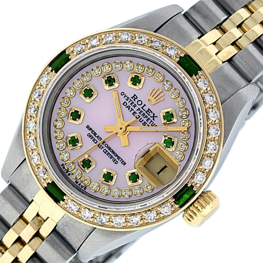 One Ladies Two Tone Rolex Datejust Polished, Serviced & Electronically Tested, Yellow Gold & Stainless Steel Case: 26mm, Yellow Gold Crown, Custom Bezel: New 18K Yellow Gold Emerald Beadset Diamond Bezel, Diamond + Gem Count: 28 Diamonds + 4 Emeralds, Total Weight .70 Carat, Clarity: SI-VS, Color: G to H. Custom Crystal: New Scratch Resistant Synthetic Sapphire Cyclops Lens. Custom Hands: New Luminescent Hands. Movement: Automatic Winding Movement. Custom Dial: Pink Mother Of Pearl Emerald String. Diamond + Stone Count: 10 Emeralds + 33 Diamonds, Color: G To H, Clarity: SI-VS. Date Window: 3 O'Clock Position Date Display, Model: Datejust, Condition: G-6 Extra Fine. Bracelet: Two Tone Yellow Gold & Stainless Steel Jubilee. Bright Polish. 6.0 Inch Length, Adjustable. Standard Clasp, With Rolex Logo. This Watch Has Been Serviced Time Tested And Is In Excellent Condition It Is Free Of All Scratches And Dents.