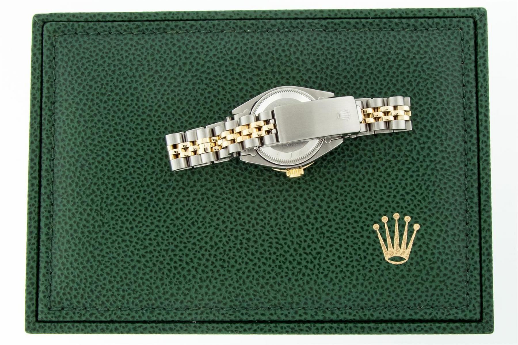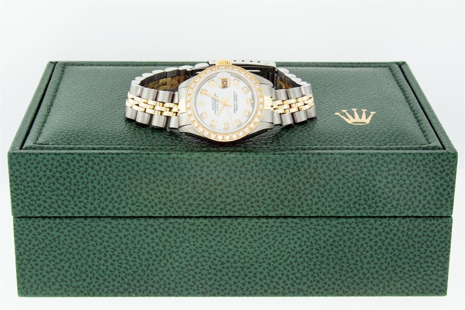 One Ladies Two Tone Rolex Datejust Polished, Serviced & Electronically Tested, Yellow Gold & Stainless Steel Case: 26mm, Yellow Gold Crown, Custom Bezel: 18K Yellow Gold Beadset Diamond Bezel, Diamond Count: 32 Diamonds Total Weight .70 Carat, Clarity: Si-VS, Color: G to H. Custom Crystal: Synthetic Sapphire Cyclops Lens. Custom Hands: New Luminescent Hands. Movement: Automatic Winding Movement Caliber. Custom Dial: Mother Of Pearl Dial Set With Diamond Hour Markers, 10 Diamond in Dial G To H In Color, SI-VS Clarity. Date Window: 3 O'Clock Position Date Display, Model: Datejust. Condition: G-6 Extra Fine. Bracelet: Two Tone Yellow Gold & Stainless Steel Jubilee. Bright Polish. 6.0 Inch Length, Adjustable. Standard Clasp, With Rolex Logo. This Watch Has Been Serviced Time Tested And Is In Excellent Condition It Is Free Of All Scratches And Dents. This Watch Comes With A Rolex Box.