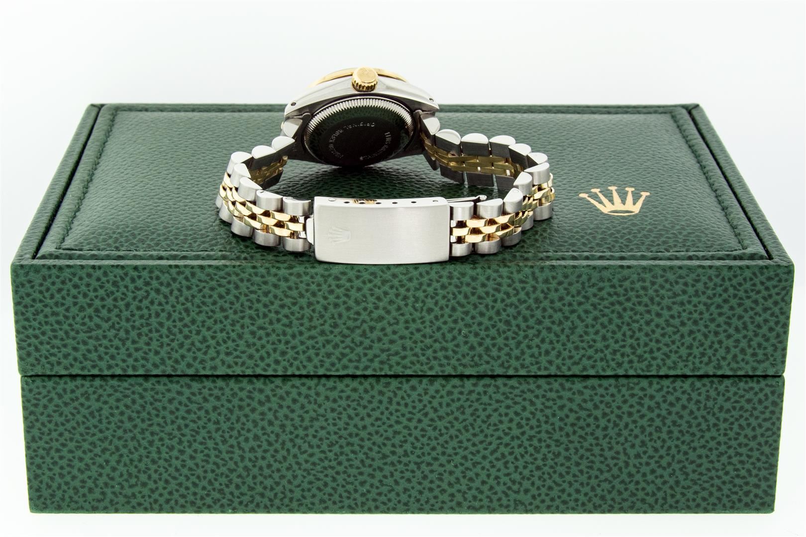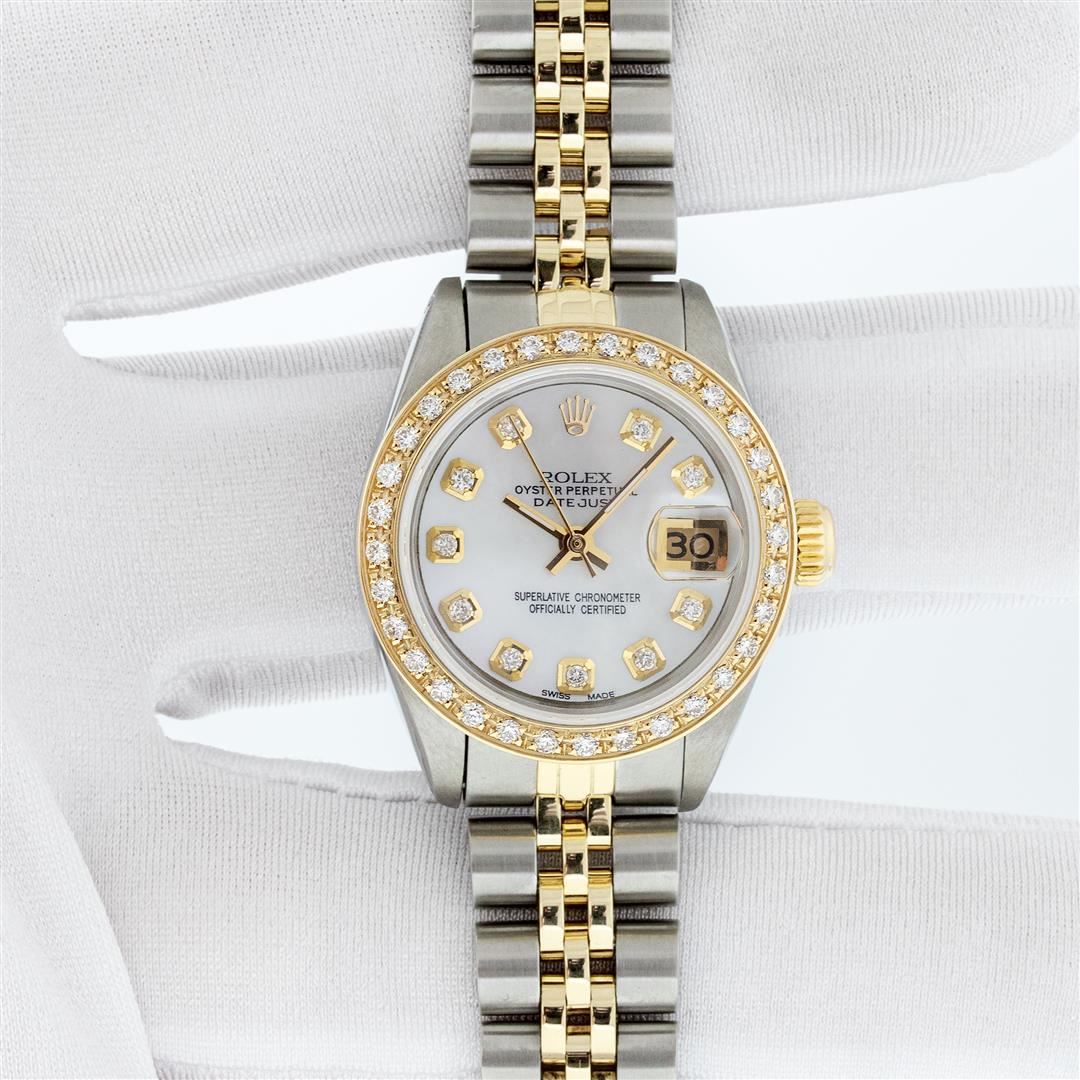 One Ladies Two Tone Rolex Datejust Polished, Serviced & Electronically Tested, Yellow Gold & Stainless Steel Case: 26mm, Yellow Gold Crown, Custom Bezel: 18K Yellow Gold Beadset Diamond Bezel, Diamond Count: 32 Diamonds Total Weight .70 Carat, Clarity: Si-VS, Color: G to H. Custom Crystal: Synthetic Sapphire Cyclops Lens. Custom Hands: New Luminescent Hands. Movement: Automatic Winding Movement Caliber. Custom Dial: Mother Of Pearl Dial Set With Diamond Hour Markers, 10 Diamond in Dial G To H In Color, SI-VS Clarity. Date Window: 3 O'Clock Position Date Display, Model: Datejust. Condition: G-6 Extra Fine. Bracelet: Two Tone Yellow Gold & Stainless Steel Jubilee. Bright Polish. 6.0 Inch Length, Adjustable. Standard Clasp, With Rolex Logo. This Watch Has Been Serviced Time Tested And Is In Excellent Condition It Is Free Of All Scratches And Dents. This Watch Comes With A Rolex Box.