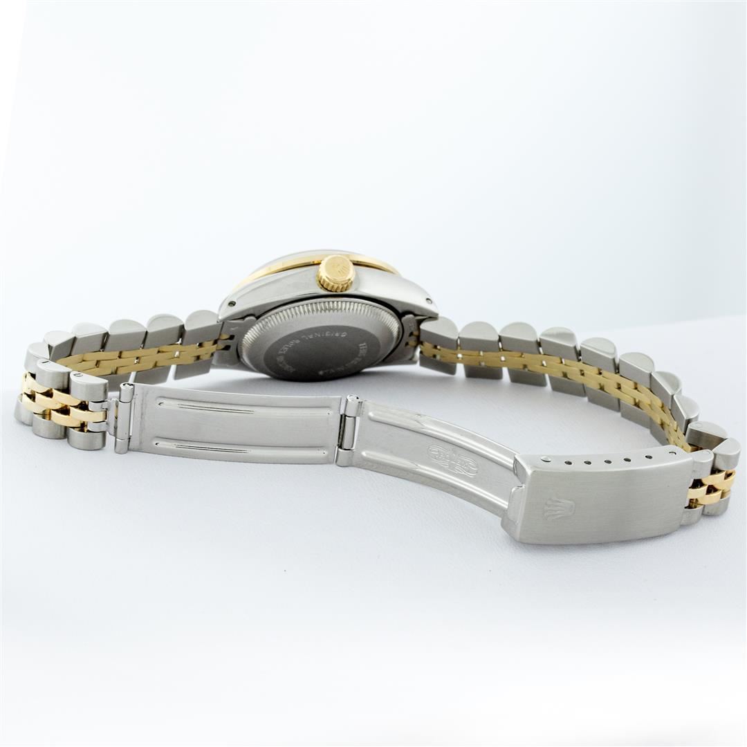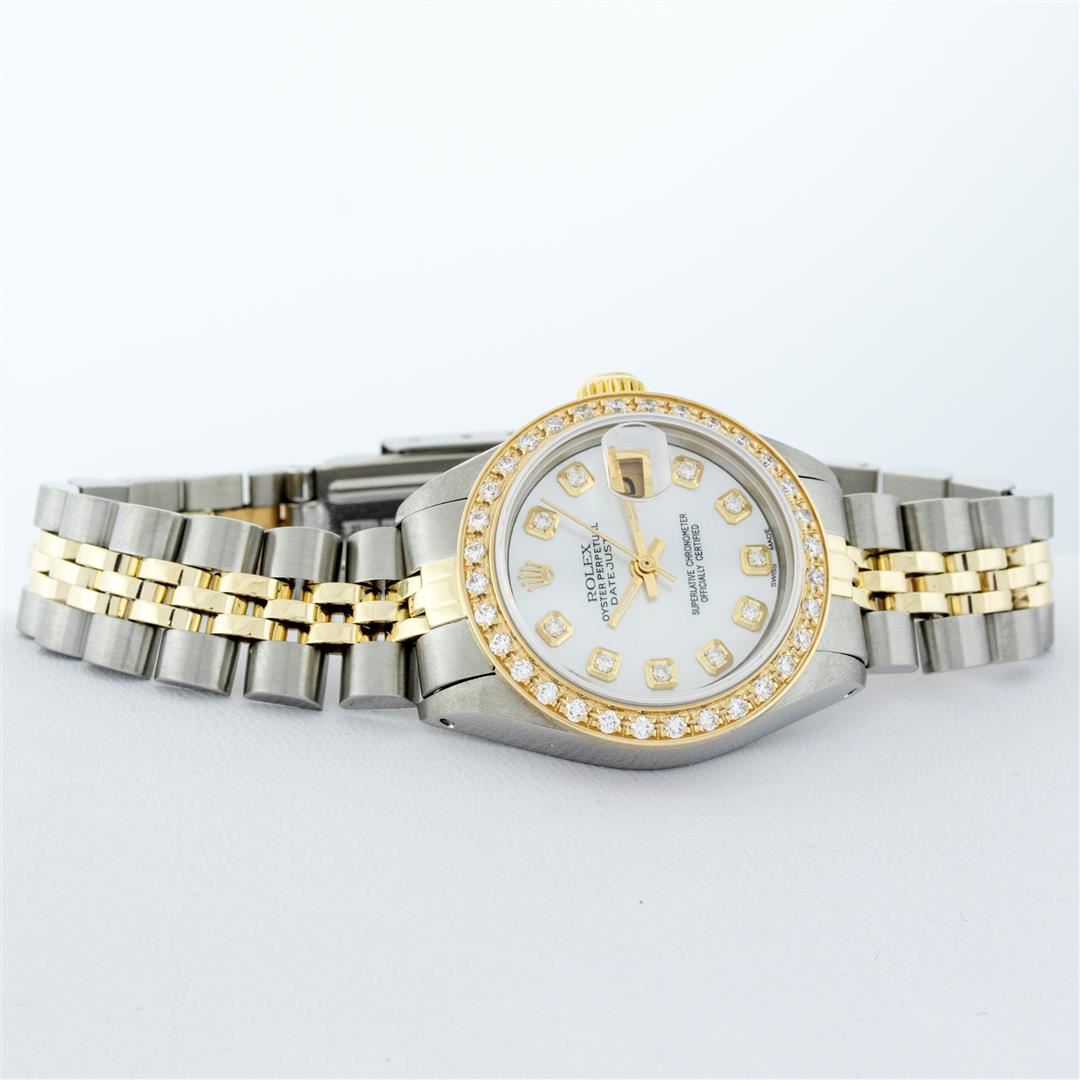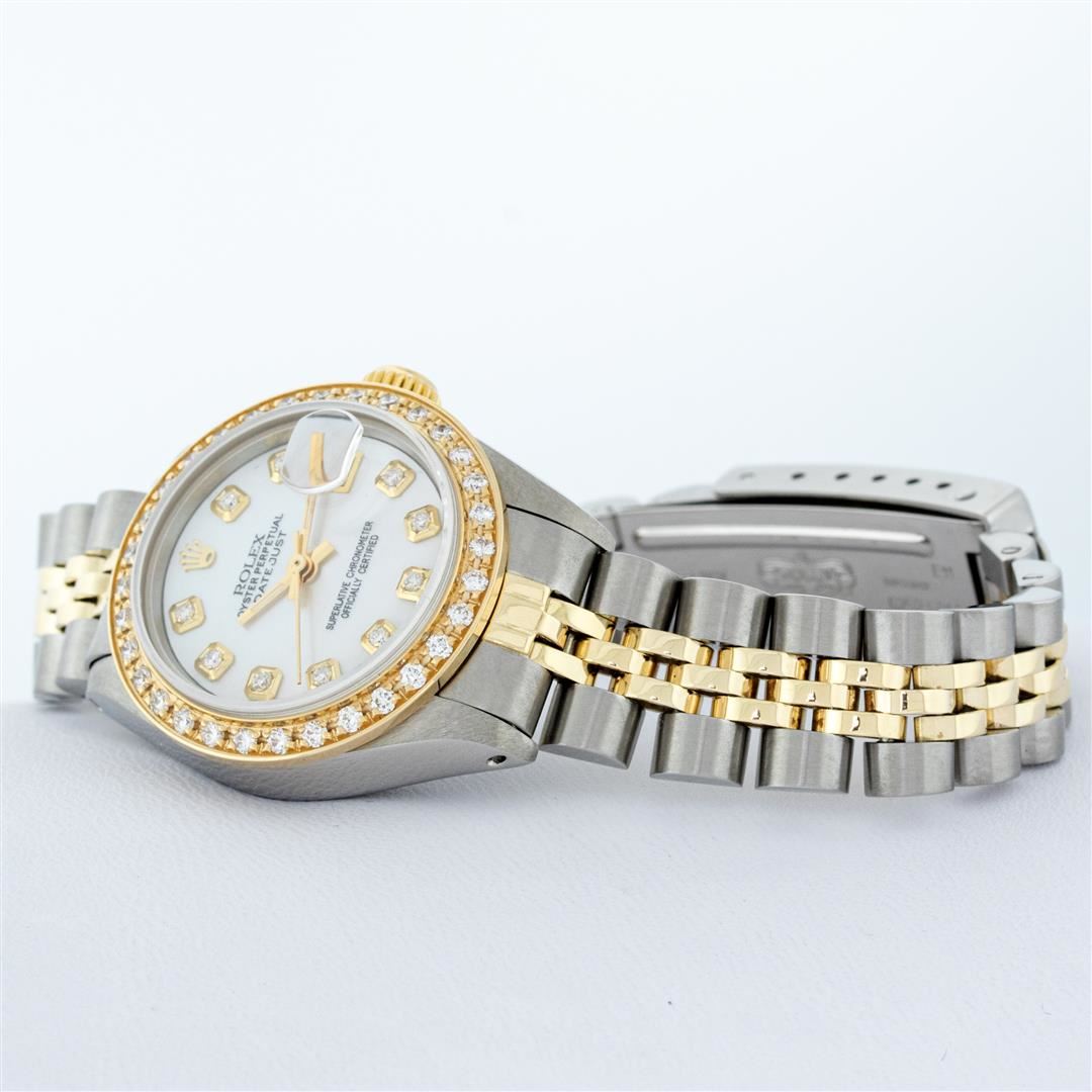 One Ladies Two Tone Rolex Datejust Polished, Serviced & Electronically Tested, Yellow Gold & Stainless Steel Case: 26mm, Yellow Gold Crown, Custom Bezel: 18K Yellow Gold Beadset Diamond Bezel, Diamond Count: 32 Diamonds Total Weight .70 Carat, Clarity: Si-VS, Color: G to H. Custom Crystal: Synthetic Sapphire Cyclops Lens. Custom Hands: New Luminescent Hands. Movement: Automatic Winding Movement Caliber. Custom Dial: Mother Of Pearl Dial Set With Diamond Hour Markers, 10 Diamond in Dial G To H In Color, SI-VS Clarity. Date Window: 3 O'Clock Position Date Display, Model: Datejust. Condition: G-6 Extra Fine. Bracelet: Two Tone Yellow Gold & Stainless Steel Jubilee. Bright Polish. 6.0 Inch Length, Adjustable. Standard Clasp, With Rolex Logo. This Watch Has Been Serviced Time Tested And Is In Excellent Condition It Is Free Of All Scratches And Dents.