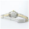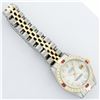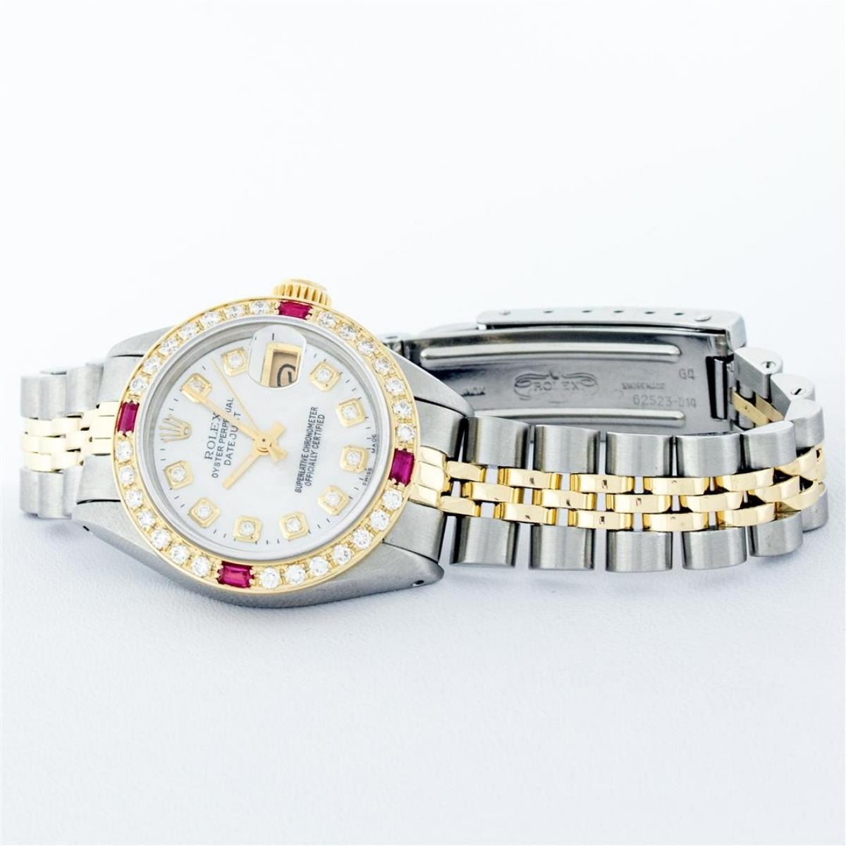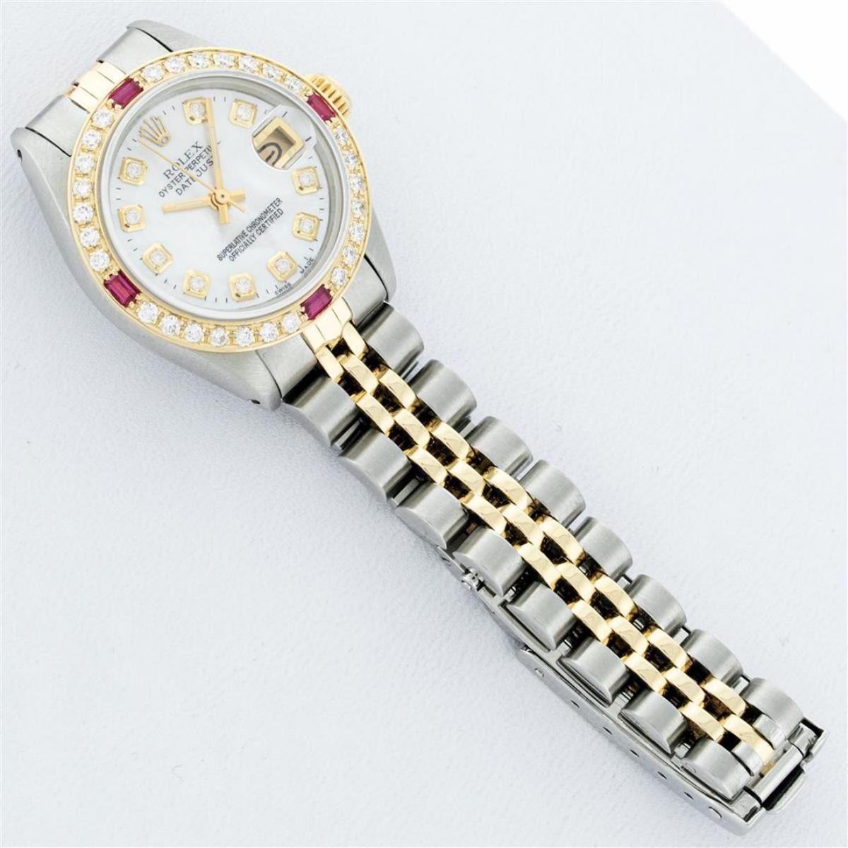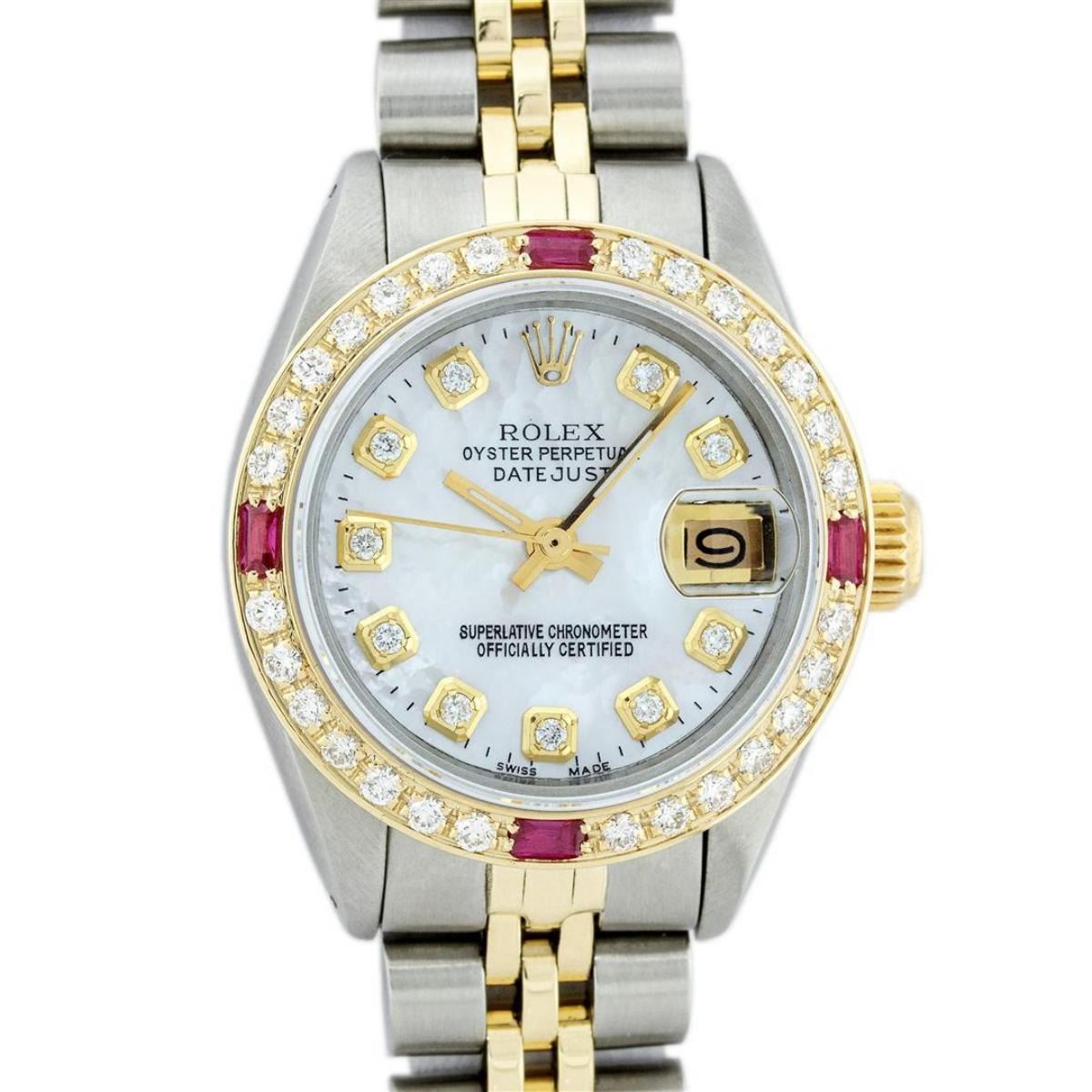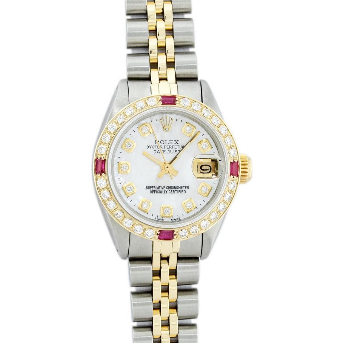 One Ladies Pre Owned Two Tone Rolex Datejust Polished, Serviced & Electronically Tested, Yellow Gold & Stainless Steel Case: 26mm, Yellow Gold Crown, Custom Bezel: New 18K Yellow Gold Ruby Beadset Diamond Bezel, Diamond + Gem Count: 28 Diamonds + 4 Rubies