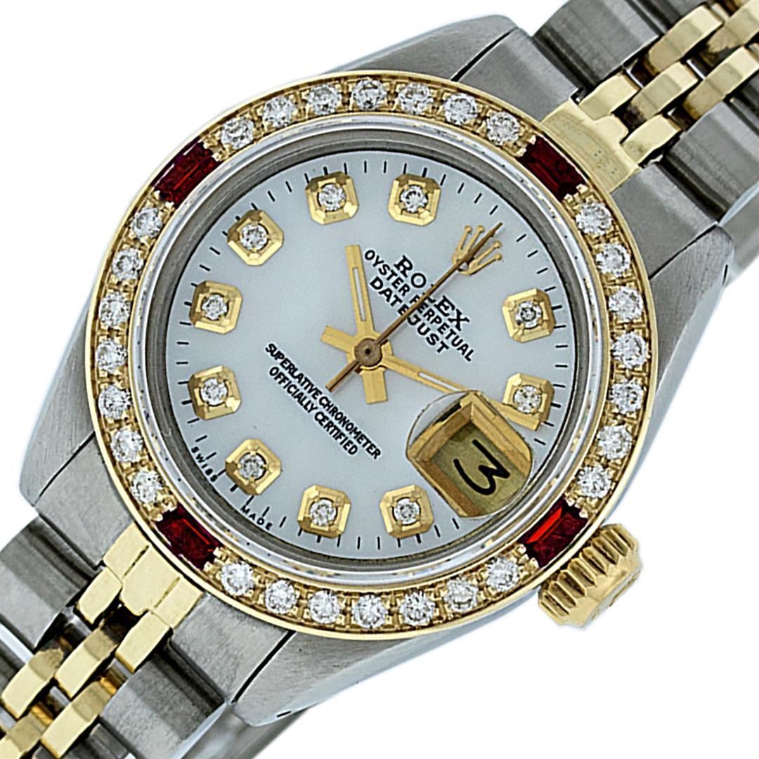 One Ladies Pre Owned Two Tone Rolex Datejust Polished, Serviced & Electronically Tested, Yellow Gold & Stainless Steel Case: 26mm, Yellow Gold Crown, Custom Bezel: New 18K Yellow Gold Ruby Beadset Diamond Bezel, Diamond + Gem Count: 28 Diamonds + 4 Rubies