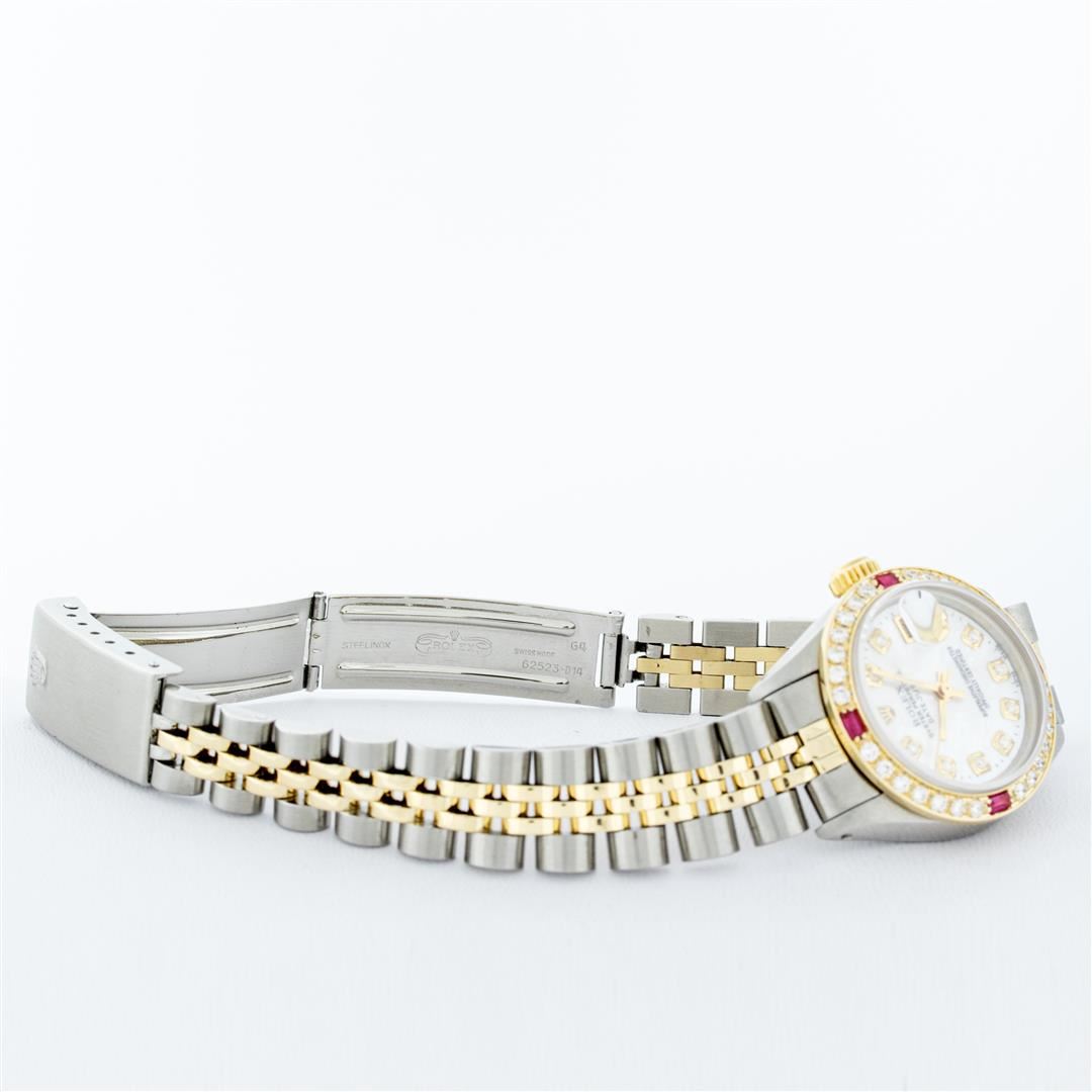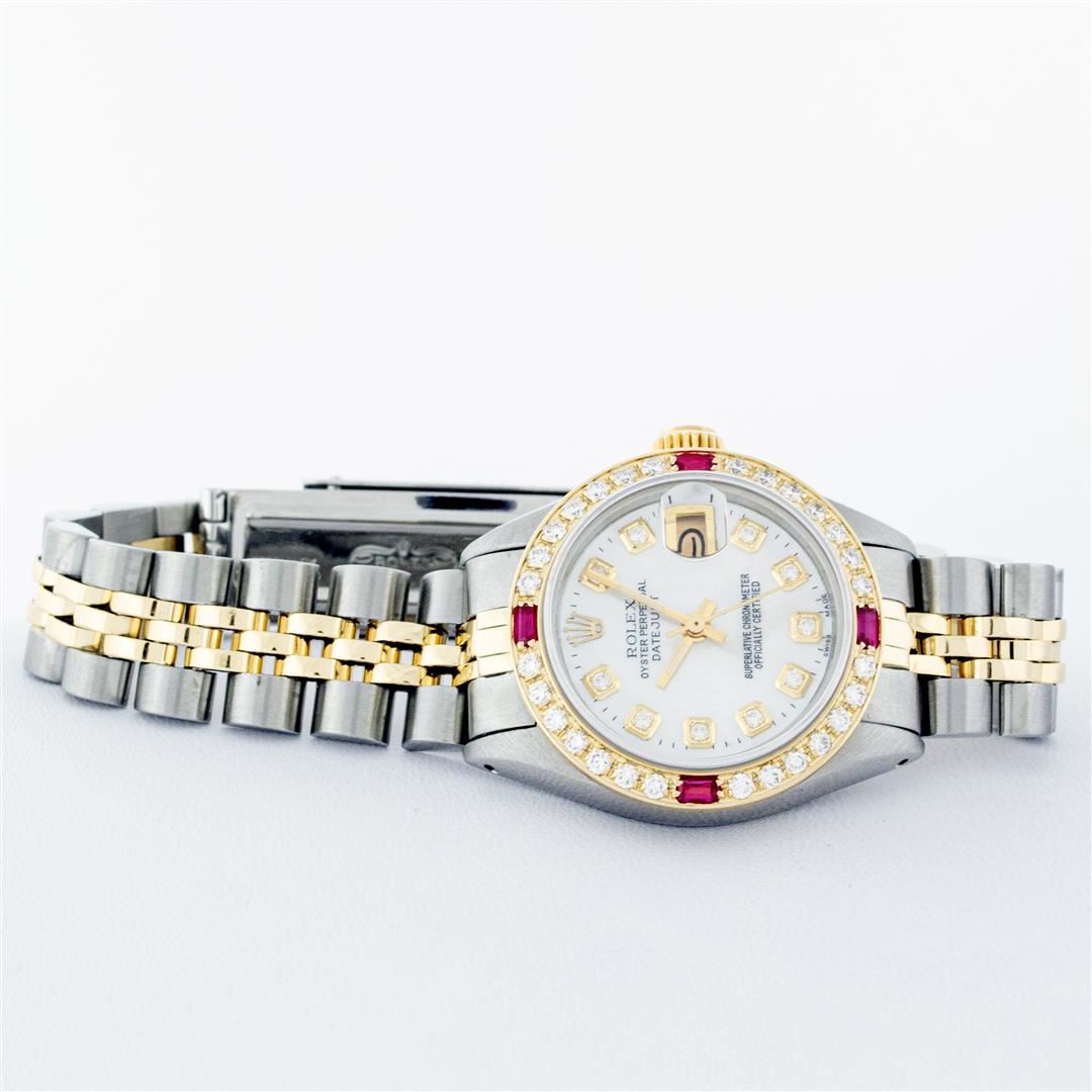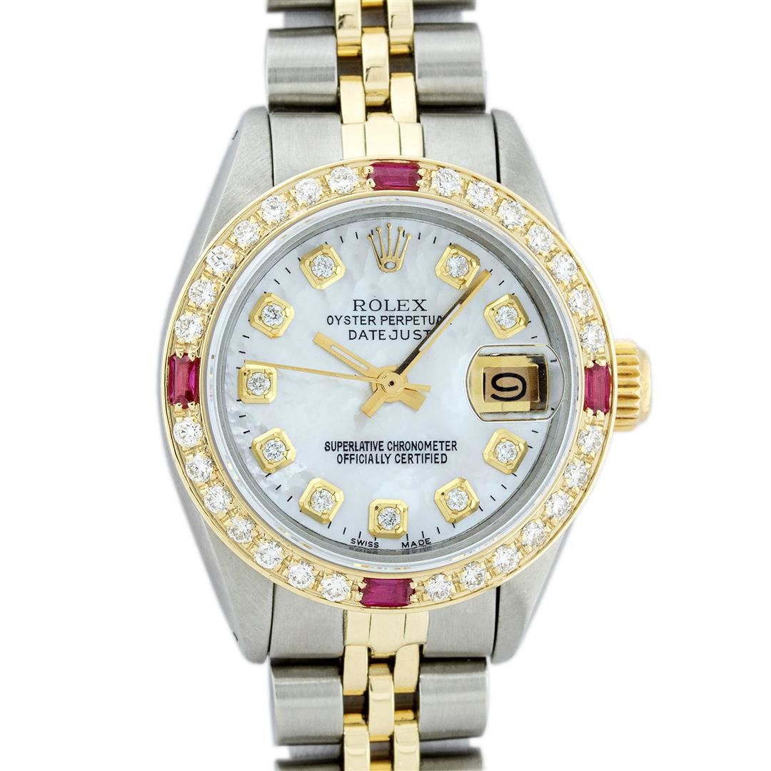 One Ladies Pre Owned Two Tone Rolex Datejust Polished, Serviced & Electronically Tested, Yellow Gold & Stainless Steel Case: 26mm, Yellow Gold Crown, Custom Bezel: New 18K Yellow Gold Ruby Beadset Diamond Bezel, Diamond + Gem Count: 28 Diamonds + 4 Rubies